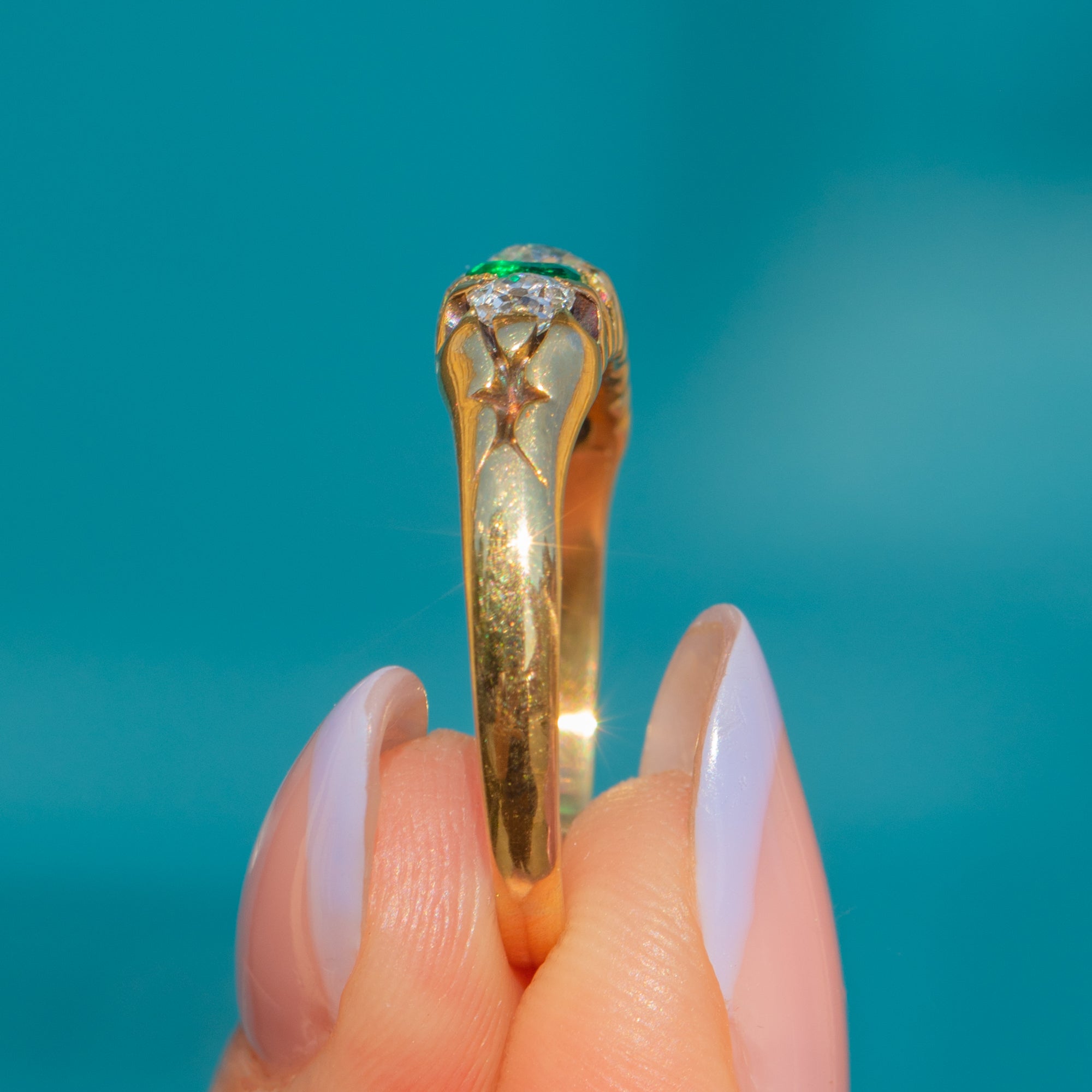 Victorian 18ct Gold Old Mine Cut Diamond Emerald Five Stone Ring, Carved Shoulders