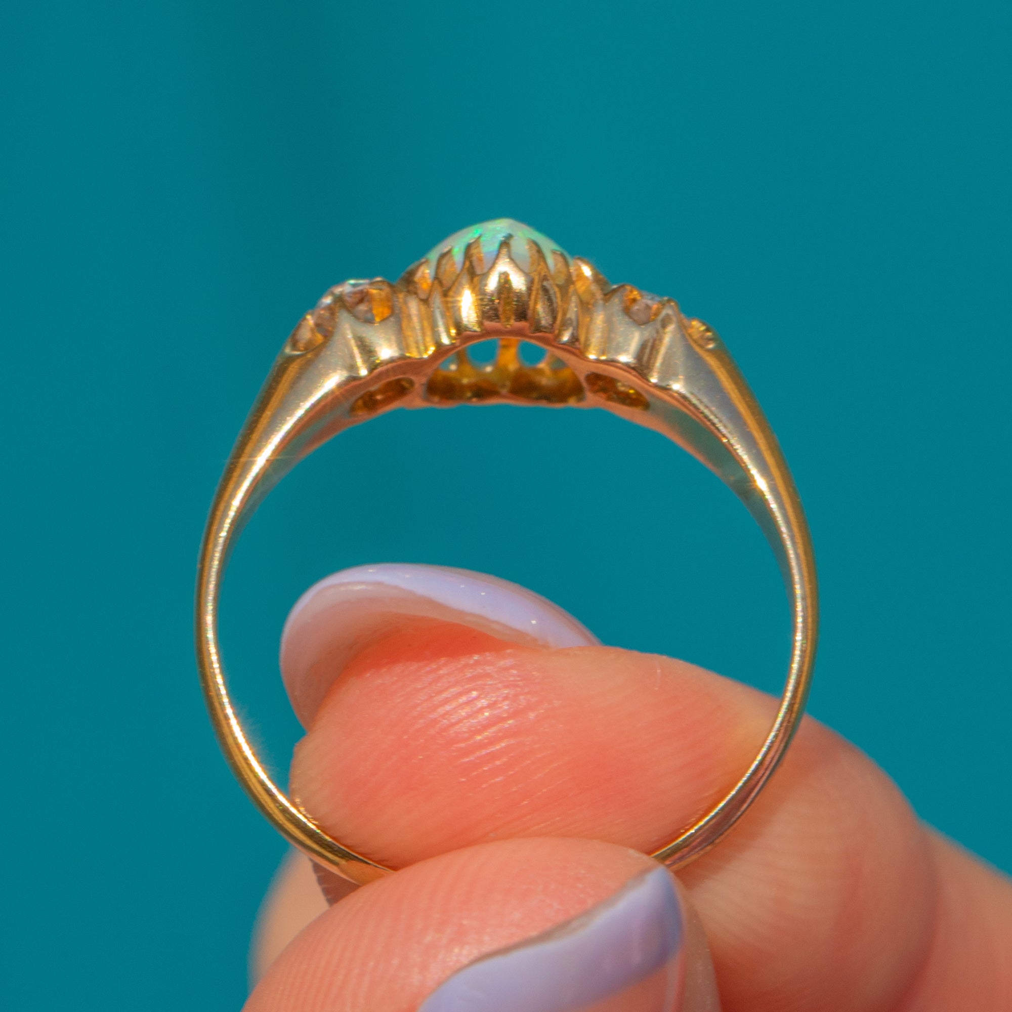 VERY GOOD: This Victorian 18ct Gold Opal heart Diamond ring is in very good condition - her stones are all crisp, with no scuffs or dings to note and are secure in their settings. There is evidence of a resize mark at the back but this is only visible from the back and hardly impacts the overall impression of the piece. She's a delight!