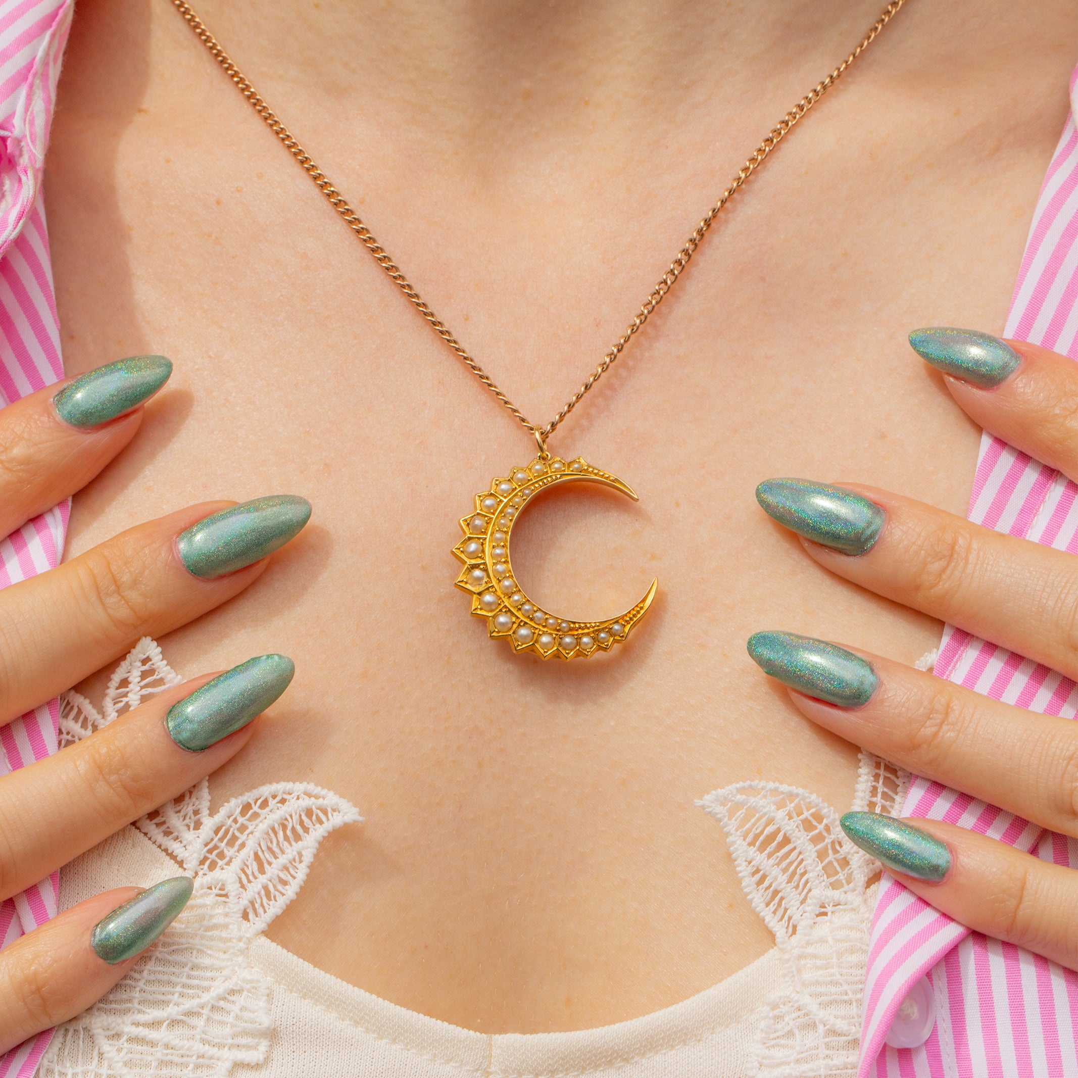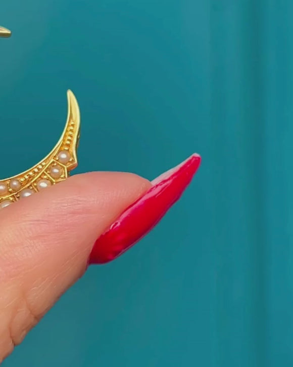 This striking Victorian 18ct Gold Pearl crescent moon pendant will bring undeniable celestial allure to your antique jewellery collection! The rows of plump Pearls send iridescent shimmers across the curved form of the crescent, set into saturated 18ct Gold.