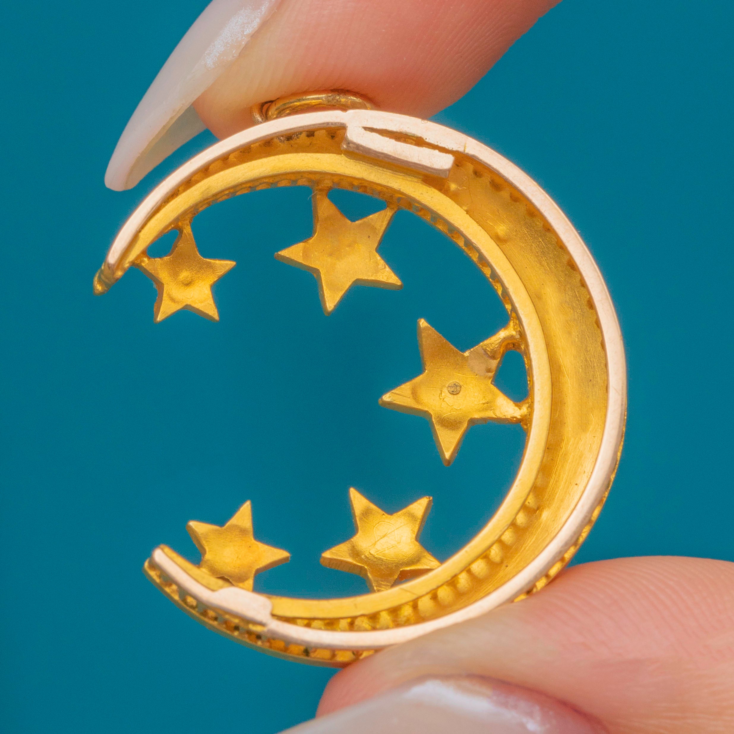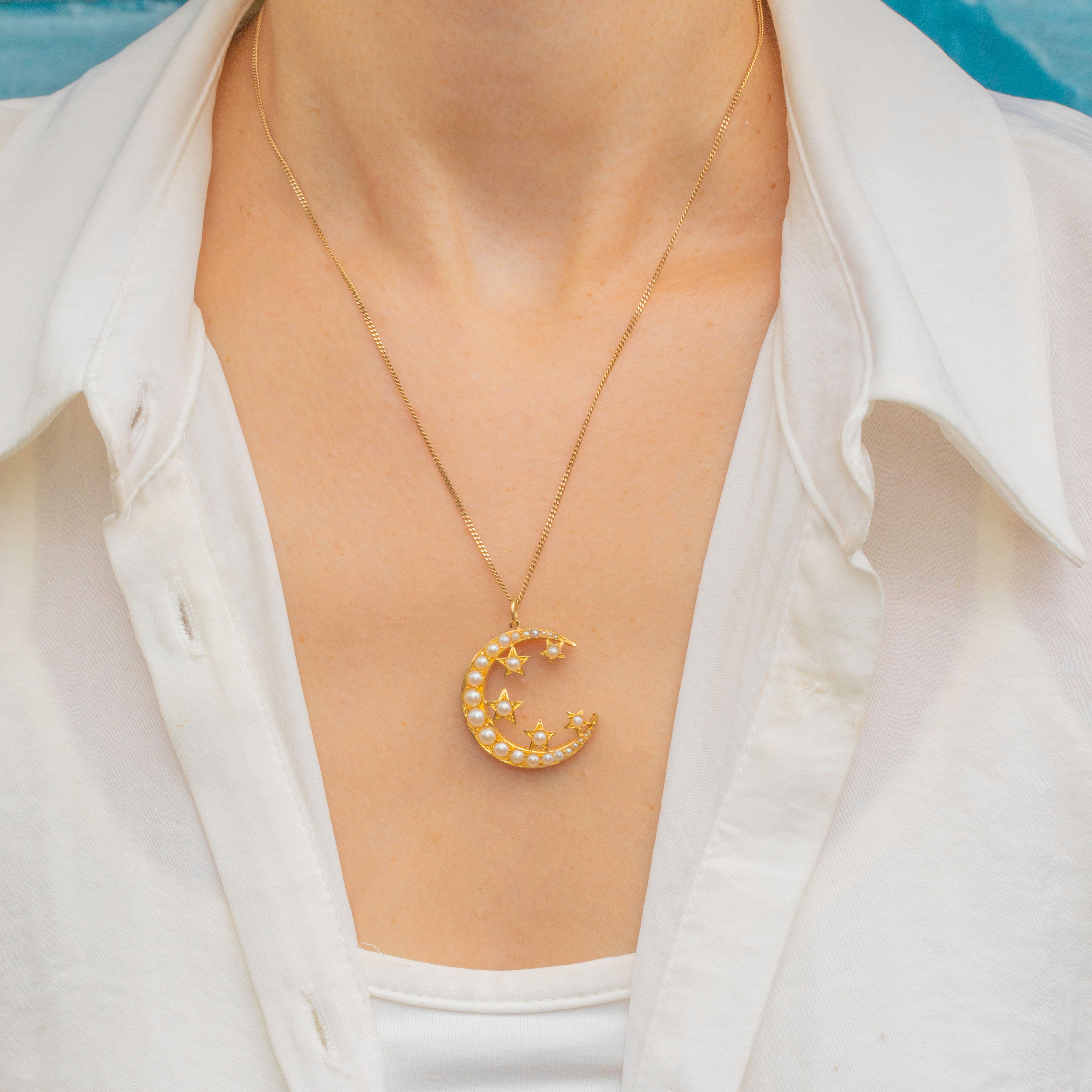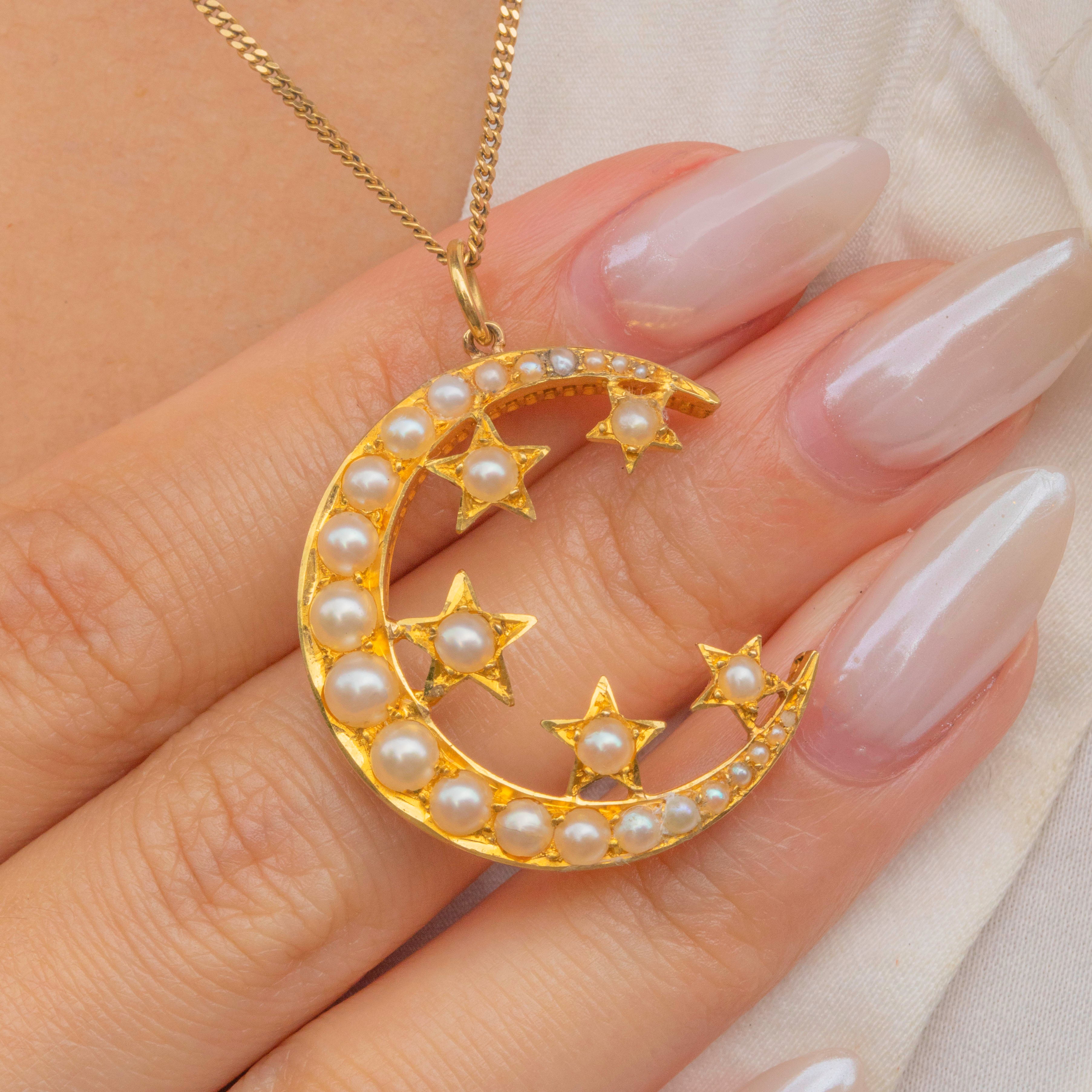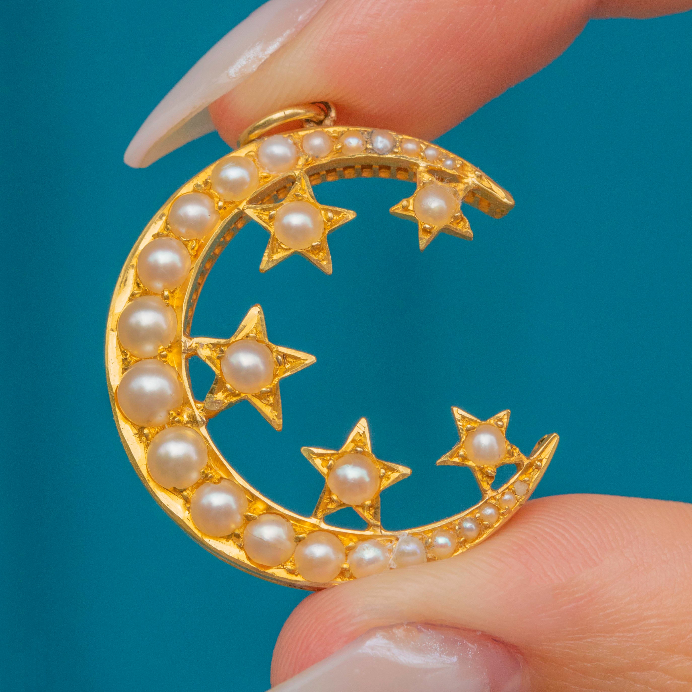 Calling all celestial jewellery lovers, this Victorian 18ct Gold Pearl crescent moon and stars pendant was made for you! Her curvaceous form is inlaid with shimmering plump Pearls which perfectly arch to her crescent shape, studded with five stars each with a Pearl centre.