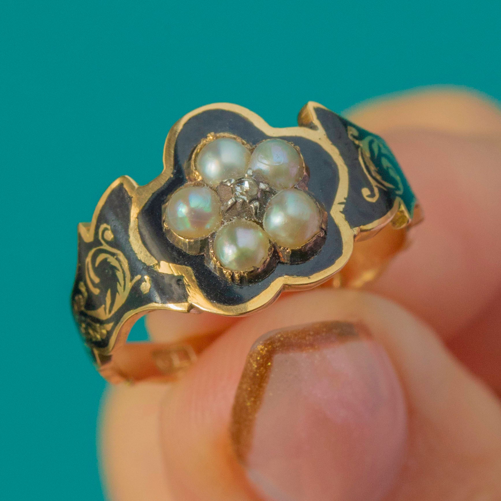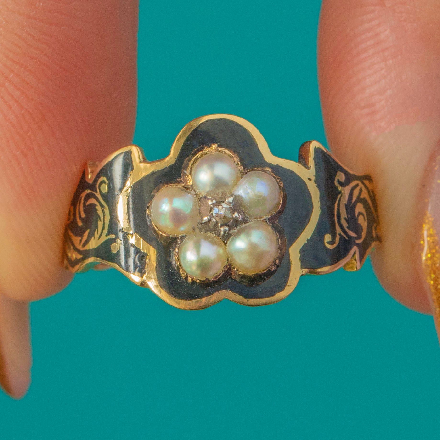 EXCELLENT: The Pearls and Diamond are secure and in excellent condition with no notable abrasions. The black Enamel is pristine—exceptionally rare for a mourning ring of this age. There is no inscription to the interior. The rear compartment glass is no longer present, as is common with early Victorian memorial rings, but the ring remains strong and beautifully preserved.