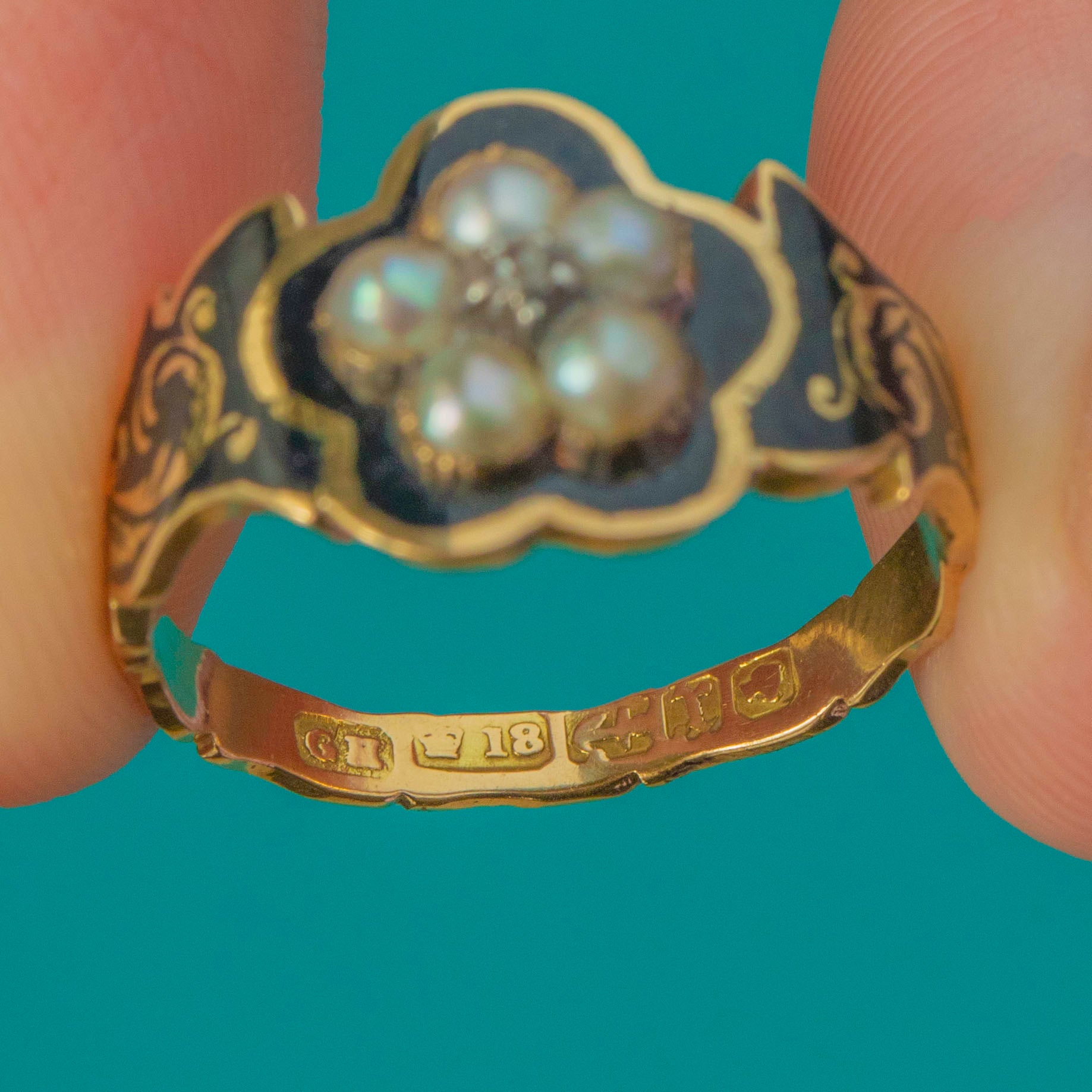 A rare early Victorian mourning ring dated 1846, crafted in rich 18ct Gold with immaculate Black Enamel reading “IN MEMORY OF”. Set with natural Pearls and a single Diamond, this beautifully preserved jewel captures the sentimentality and elegance of mid-19th century memorial pieces.
