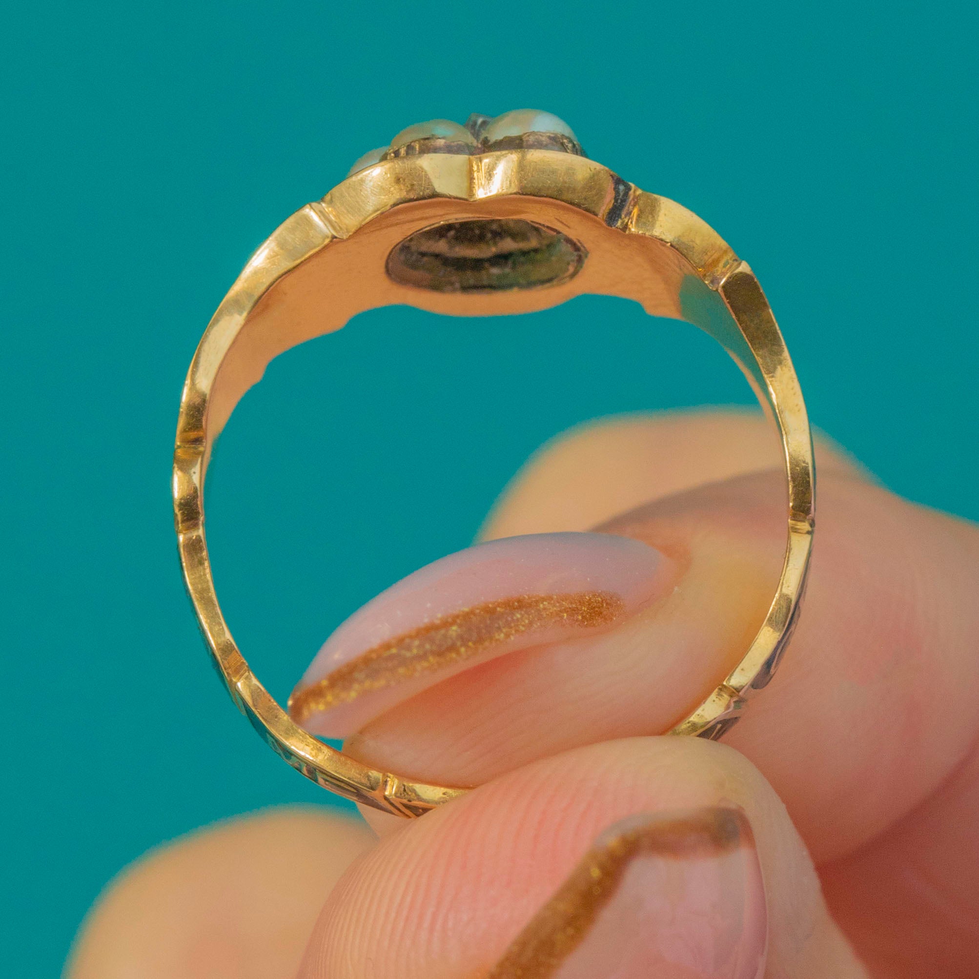 The Enamel is pristine, which is exceptionally uncommon for rings of this age. There would once have been a small glass compartment to the rear, now absent, but the ring remains strong, wearable, and wonderfully intact for its period.