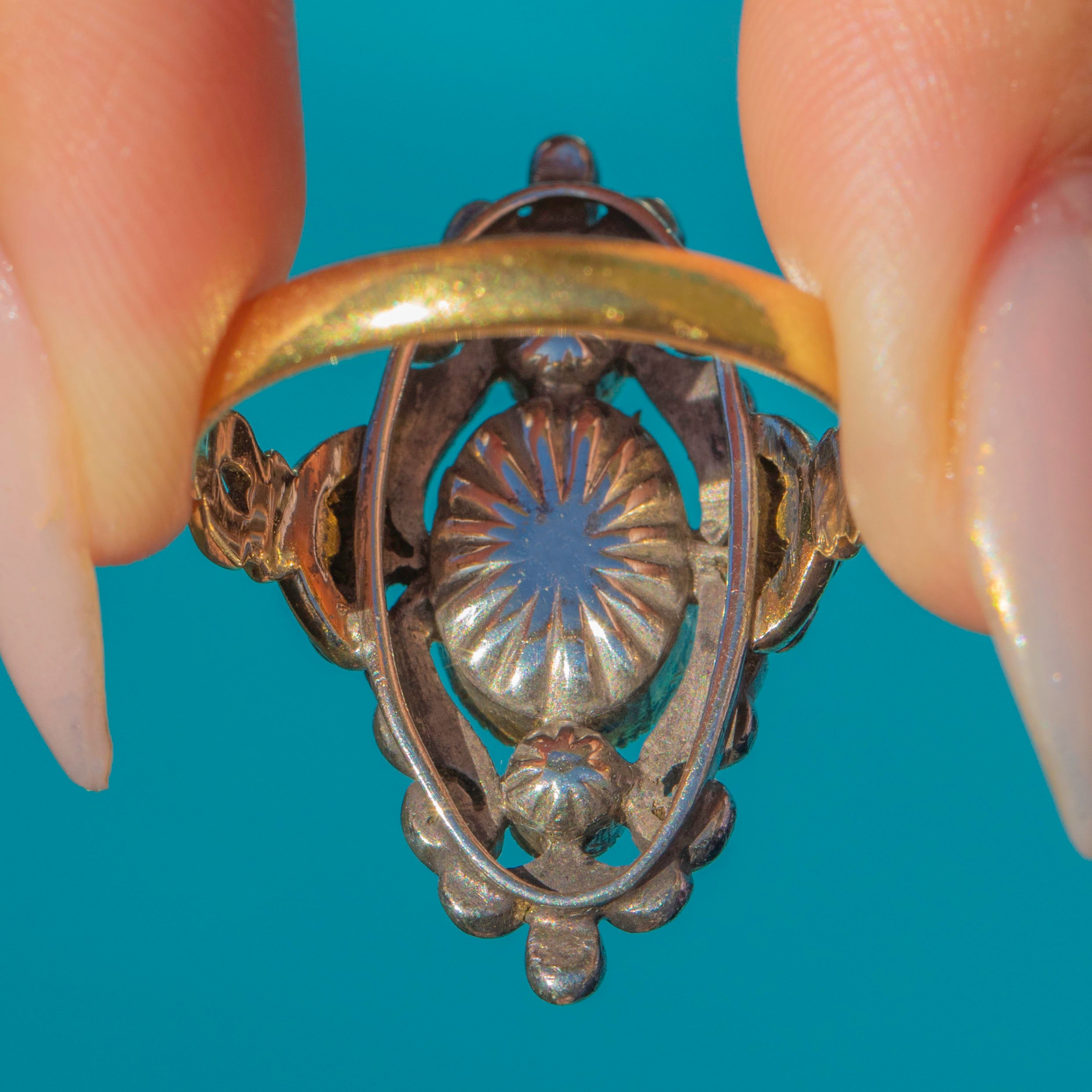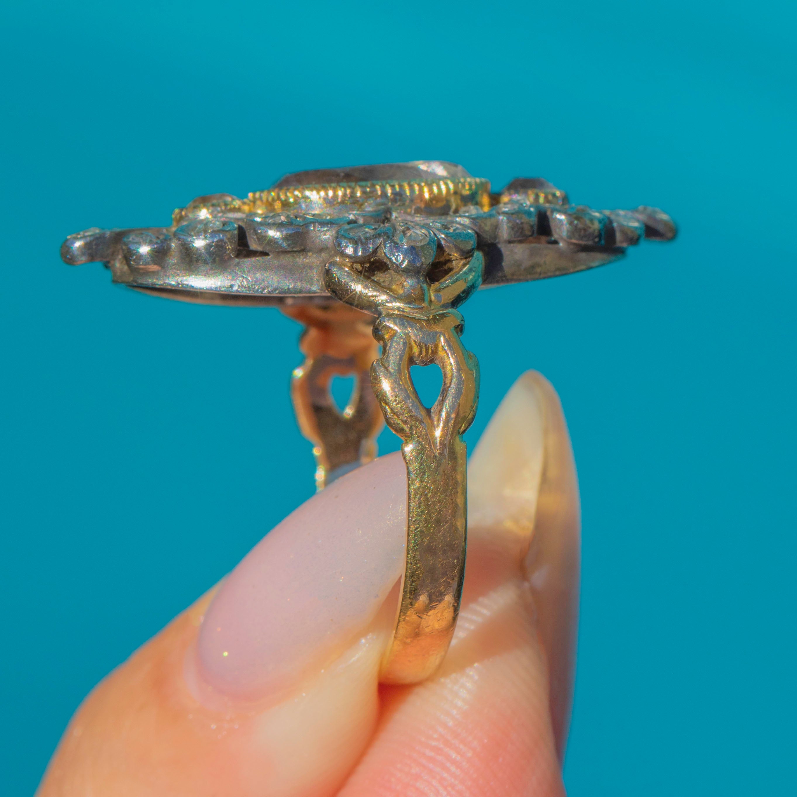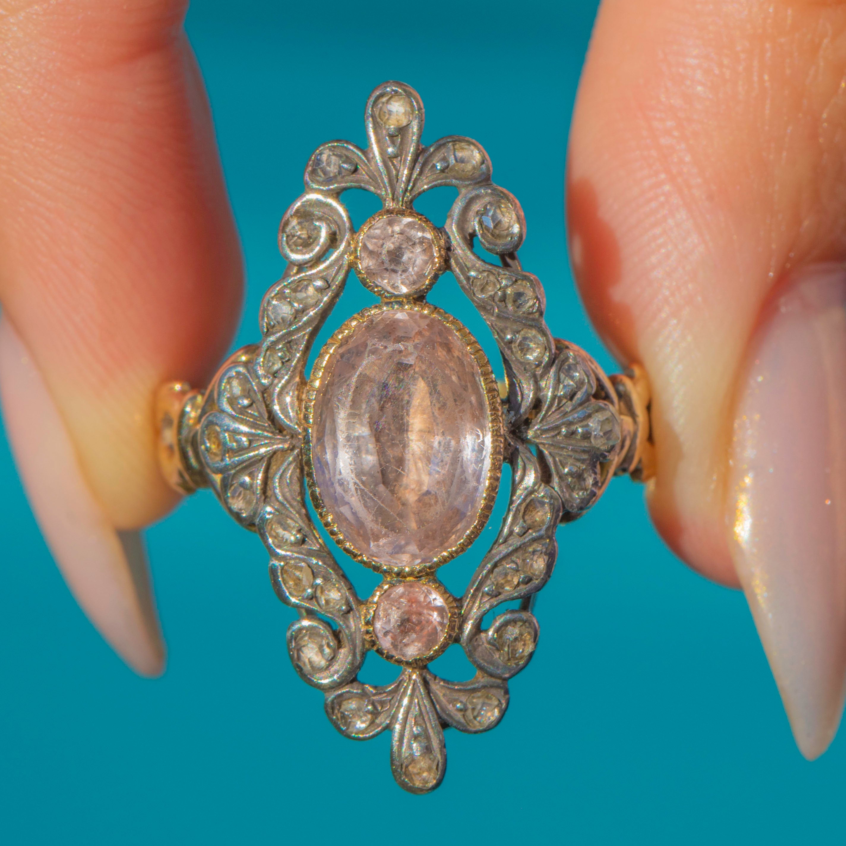 This ornate Victorian Pink Topaz and Rose-cut Diamond ring is a masterpiece! Crafted in 18ct Gold with typical Silver settings, it's designed with a richly decorative openwork face and a flattering navette or "little boat" shape. At the centre sits three pretty Pink Topaz framed with twinkling old-cut Diamonds set in crimped Silver. The ring face extends an impressive 30mm long, creating a striking and distinctive silhouette on the finger.