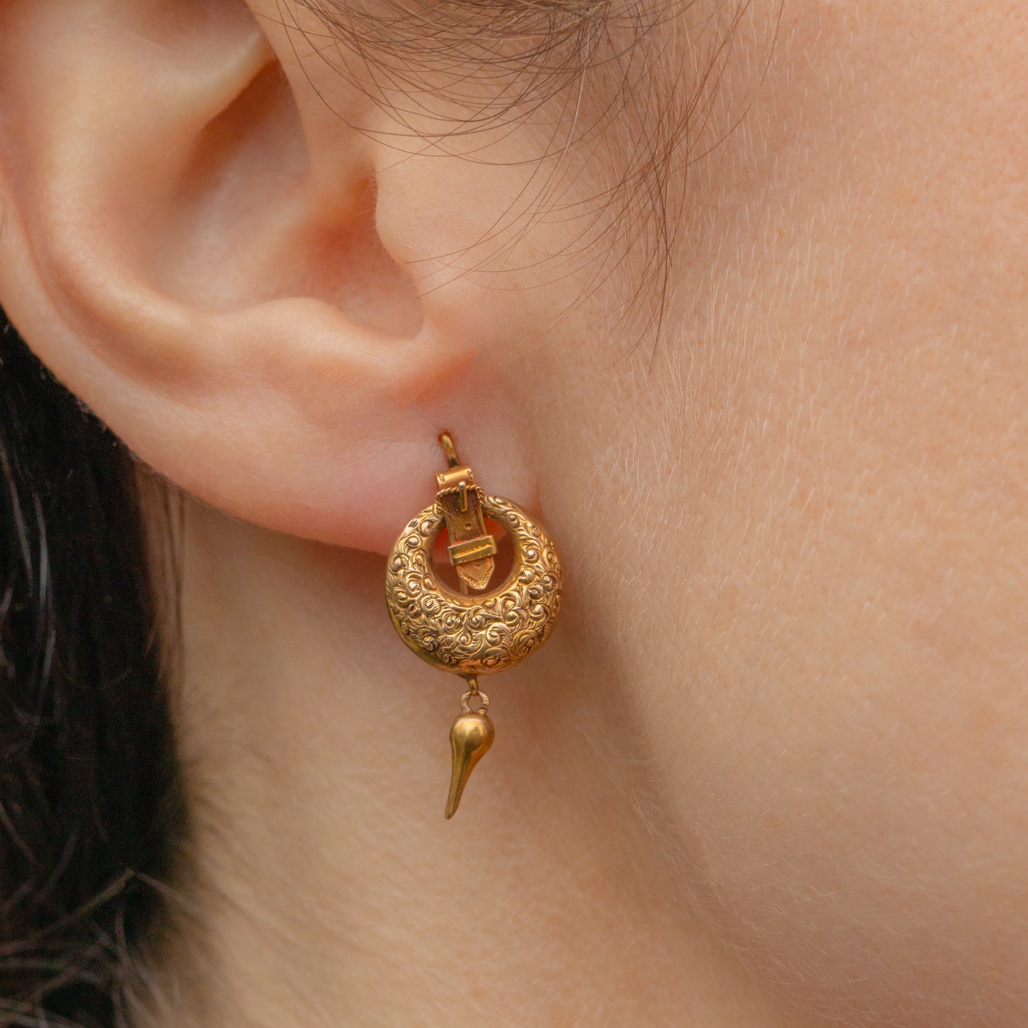 VERY GOOD. These Victorian 18ct Gold repoussé hoop earrings are in very good condition. The details are crisp and intricate and the Gold is brightly saturated. There is some minor wear throughout, including a small ding on the front of one hoop and a missing prong on one buckle, but these are only noticeable under close inspection. With secure and comfortable hooks, these antique hoop earrings can be worn with confidence!