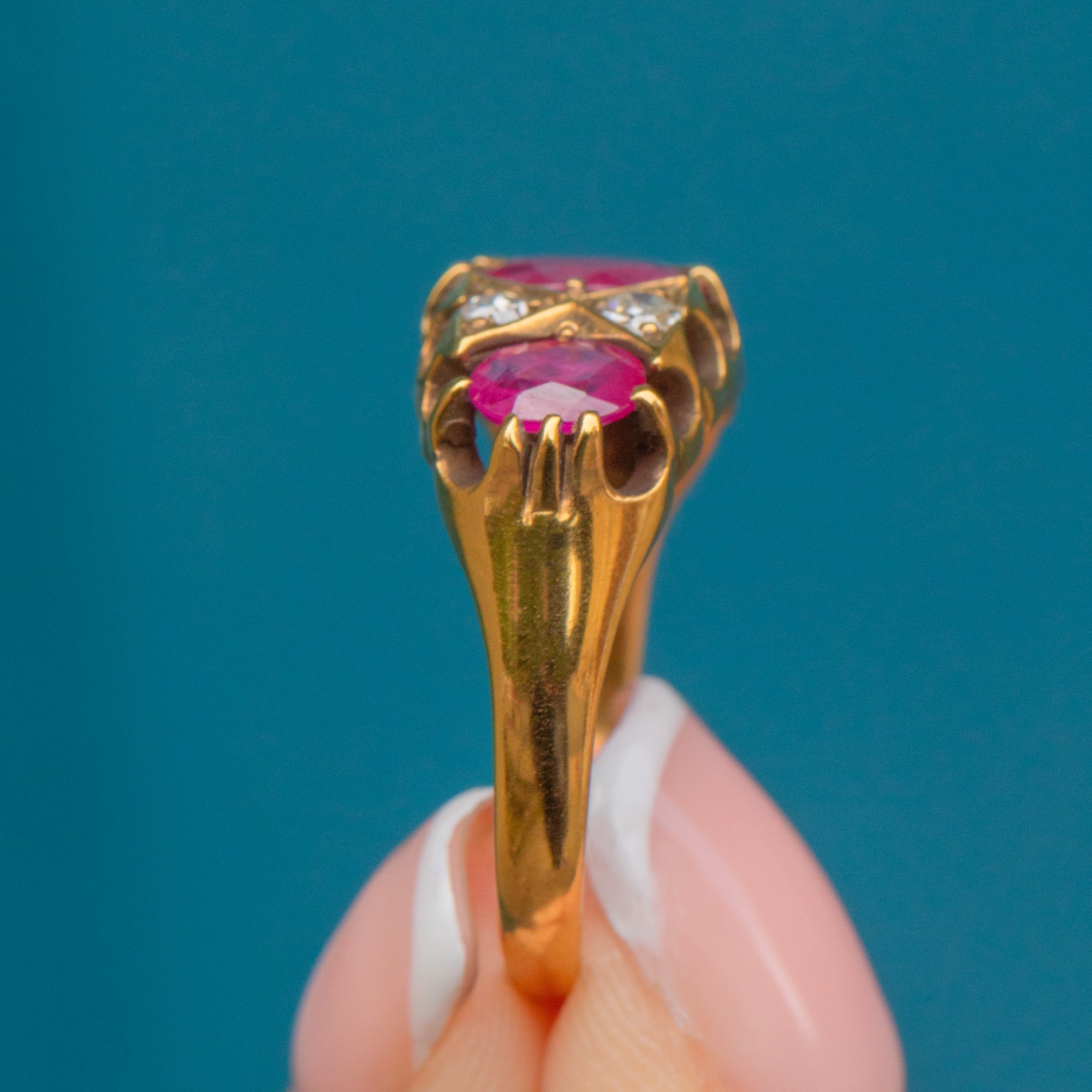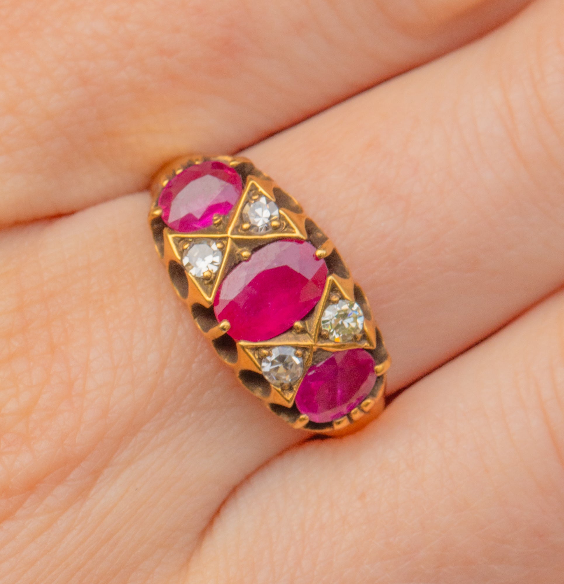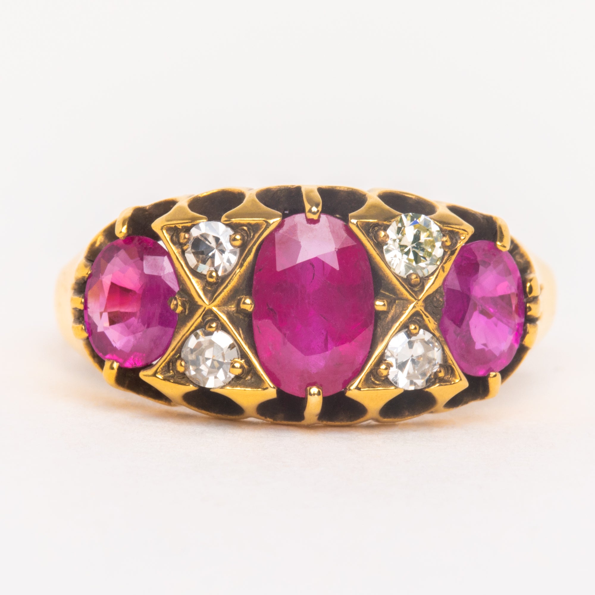 We have fallen in love with the delicious, juicy pink hues of the three natural Rubies displayed proudly on the lovely 18ct Gold crown gallery! Four sweet, twinkling Diamonds shimmer between the luxurious Ruby gemstones in the most delightful way. A match made in antique jewellery heaven!