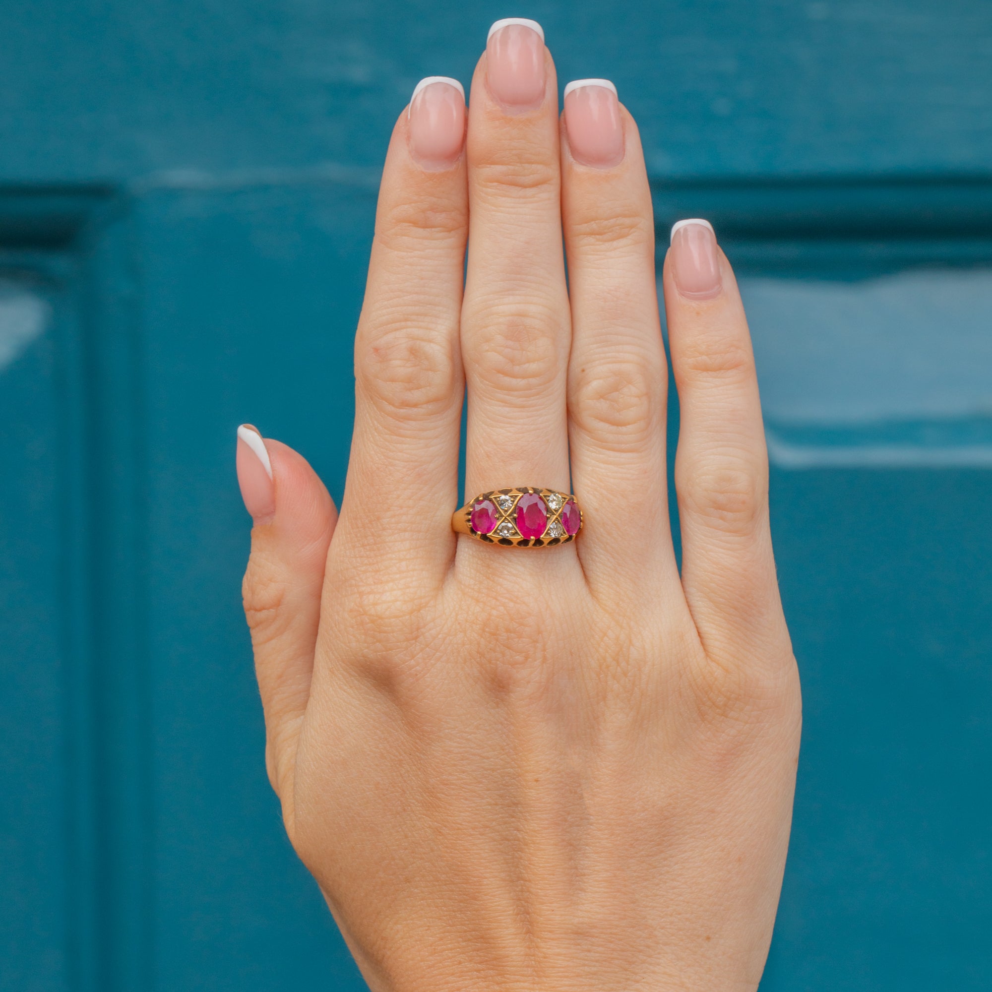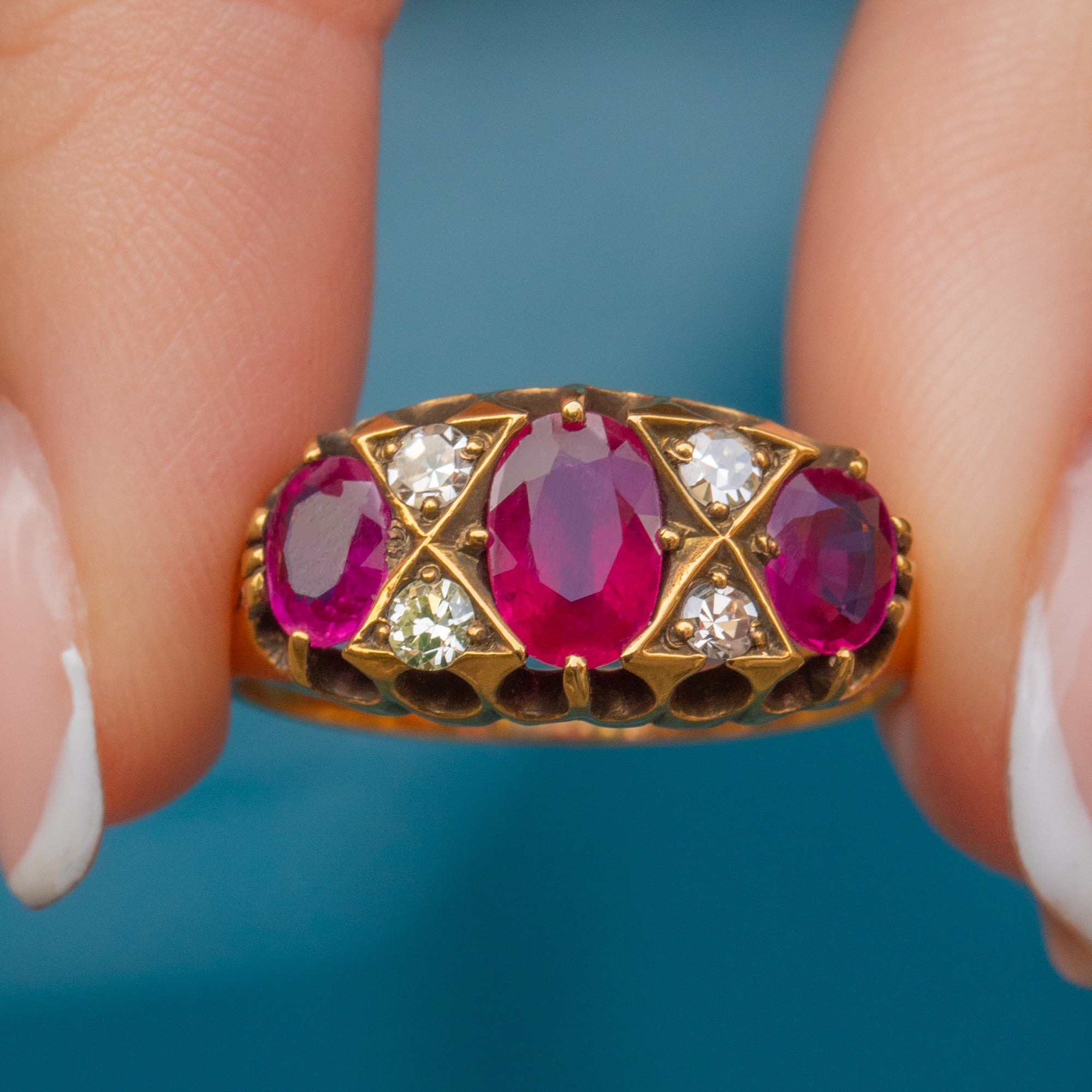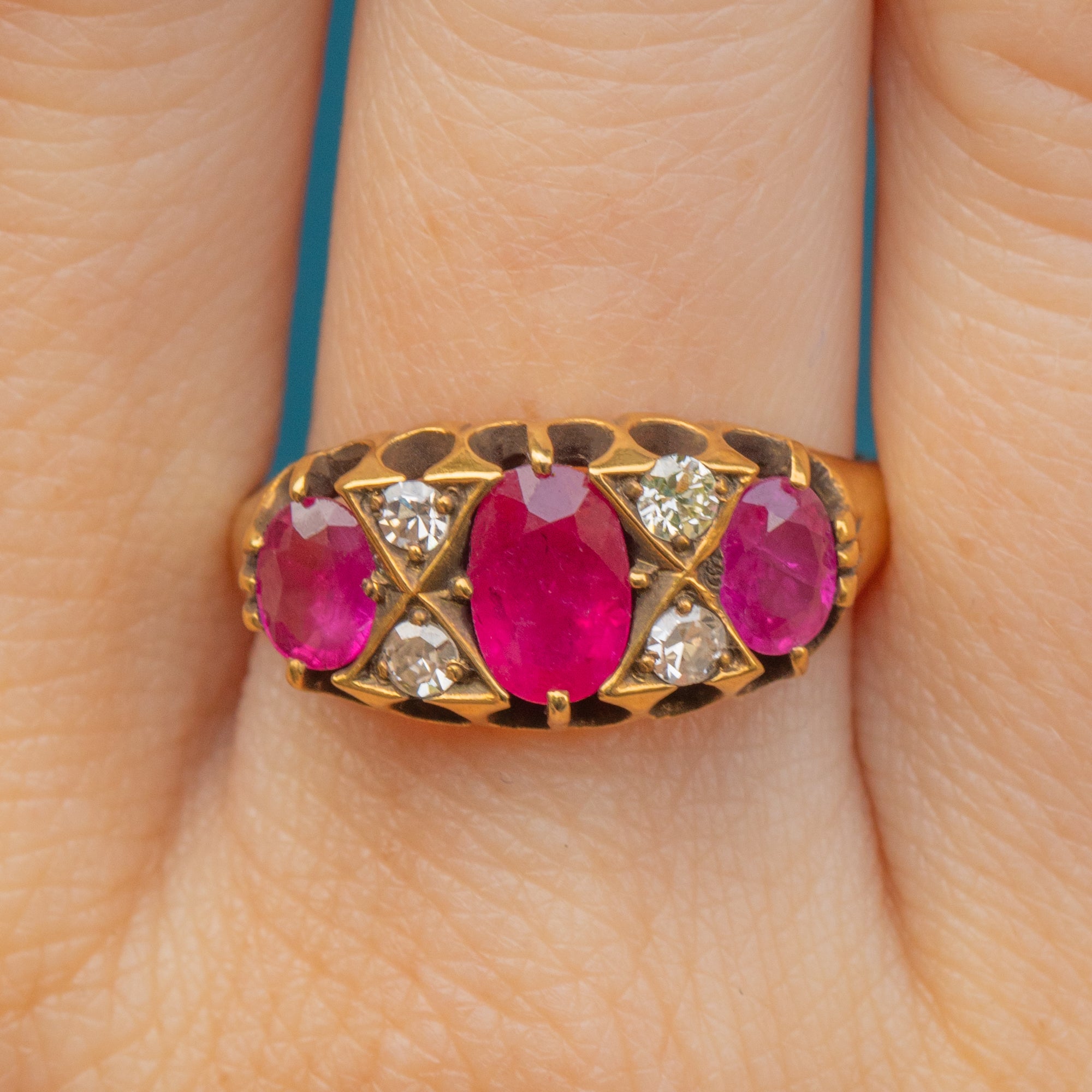 We have fallen in love with the delicious, juicy pink hues of the three natural Rubies displayed proudly on the lovely 18ct Gold crown gallery! Four sweet, twinkling Diamonds shimmer between the luxurious Ruby gemstones in the most delightful way. A match made in antique jewellery heaven!