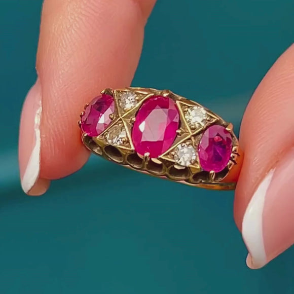 Victorian 18ct Gold Ruby Diamond Boat Ring, 1.44ct Natural Rubies