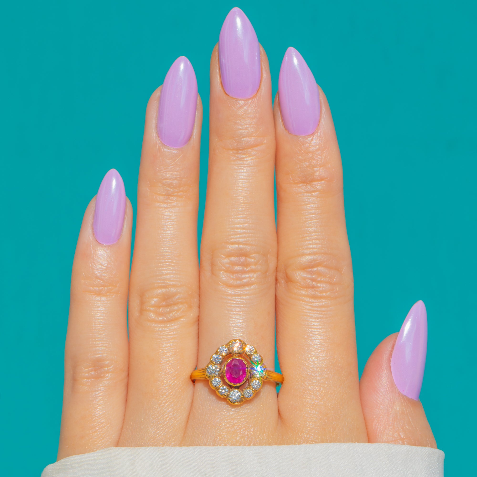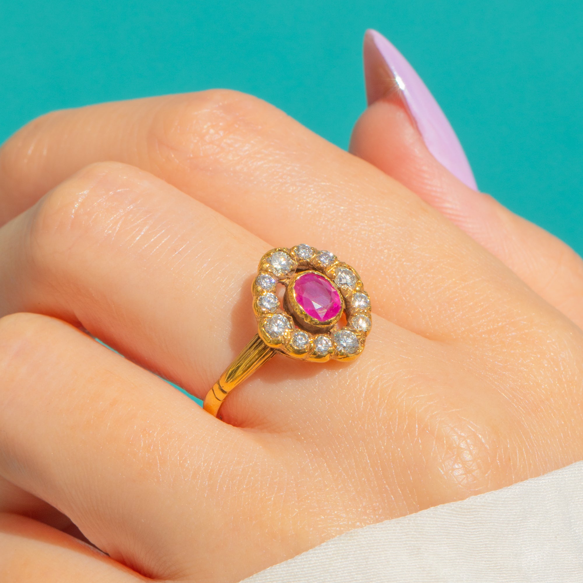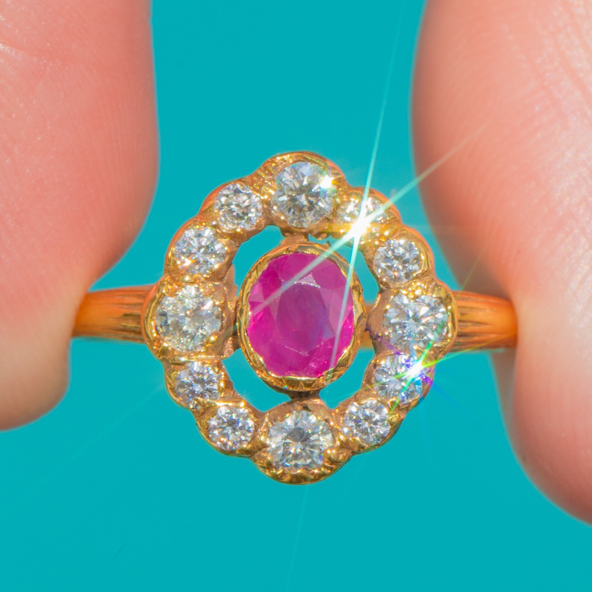 A timeless Victorian cluster ring that captures the romance of the era, crafted in rich 18ct Gold with a wonderfully detailed, hand-finished feel. At its heart sits an oval Ruby of approximately 0.55ct, its vibrant pink-red hue lifted in a raised bezel and framed by a scalloped halo.