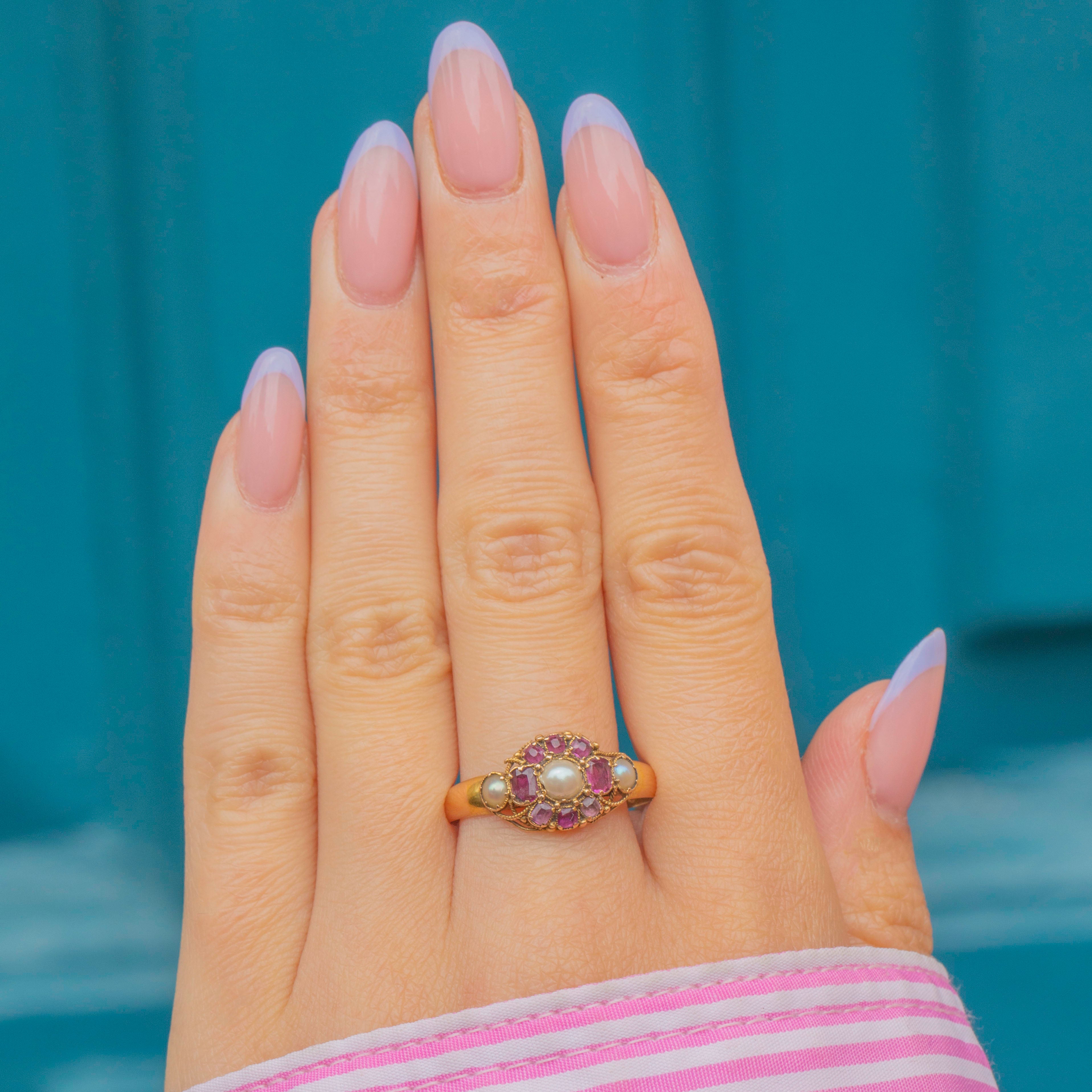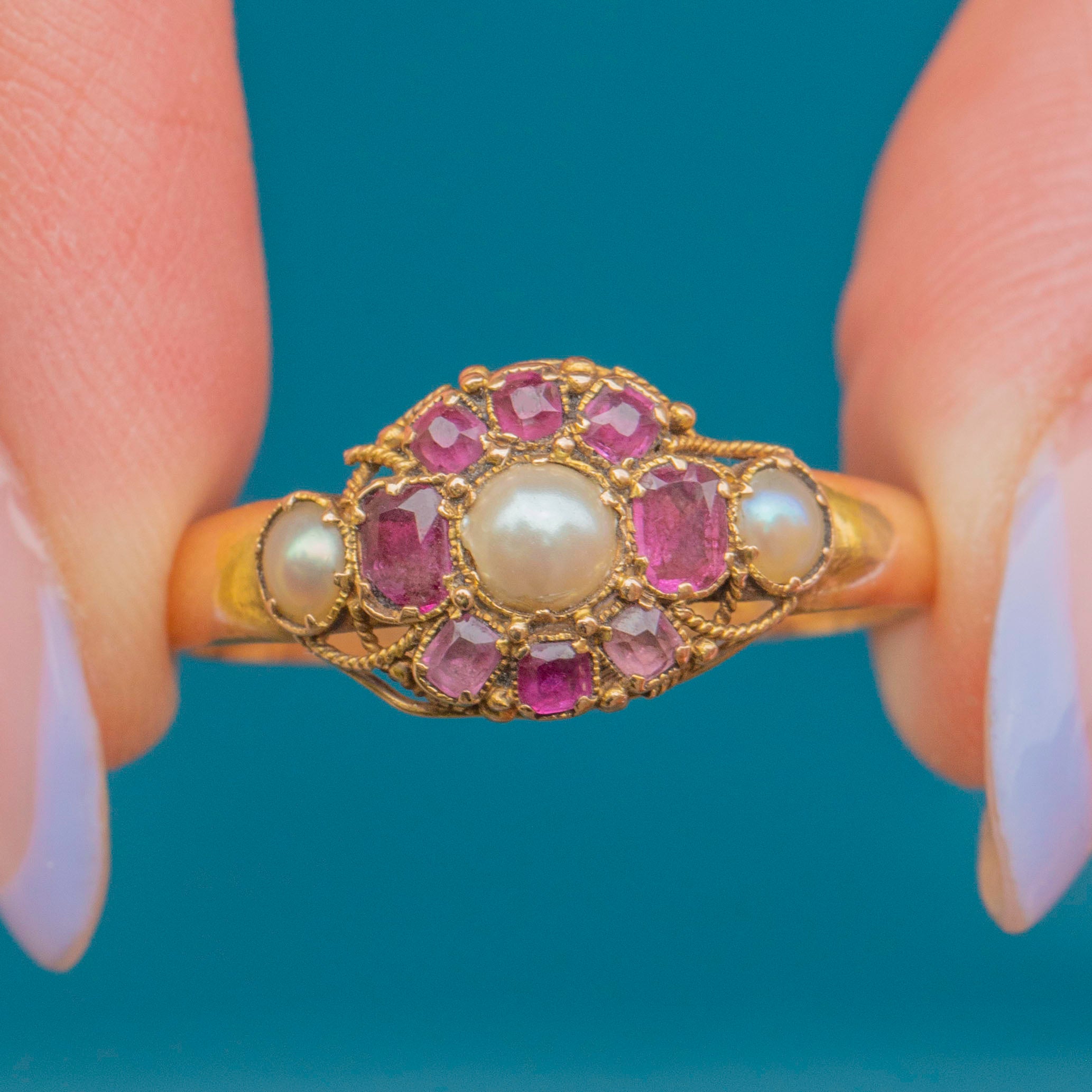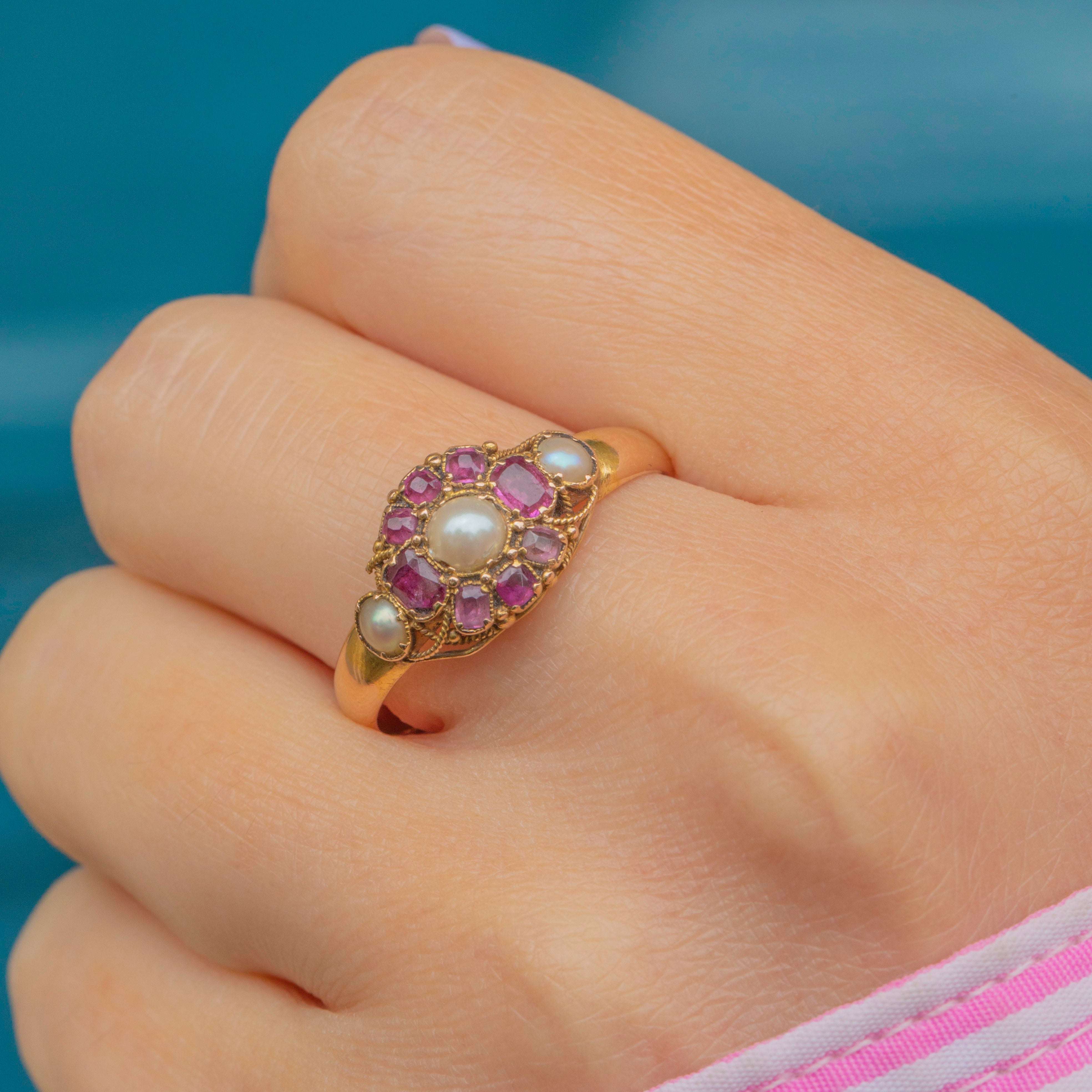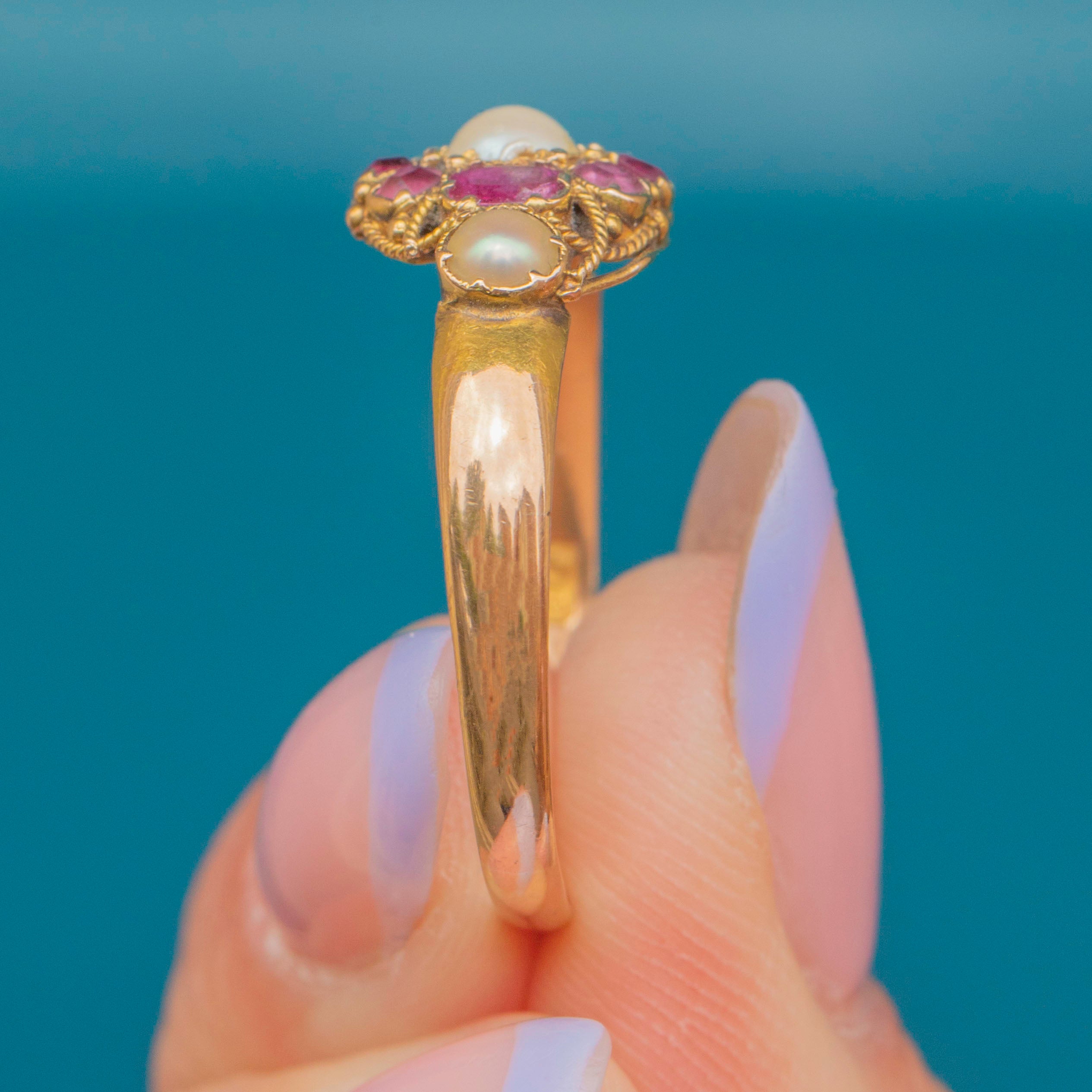 VERY GOOD: This Victorian 18ct Gold Ruby Pearl flower ring is in very good condition. The gemstones are securely set, with minimal signs of wear. There are some scratches to the back of the ring face as well as evidence of a previous resize on the back of the shank, which do not impact the integrity of the ring. Fitting comfortably and crafted meticulously, this antique ring can be worn with confidence.
