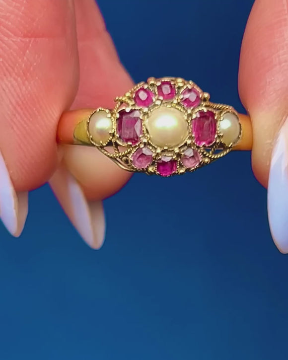 Victorian 18ct Gold Ruby Pearl Flower Ring, c.1900