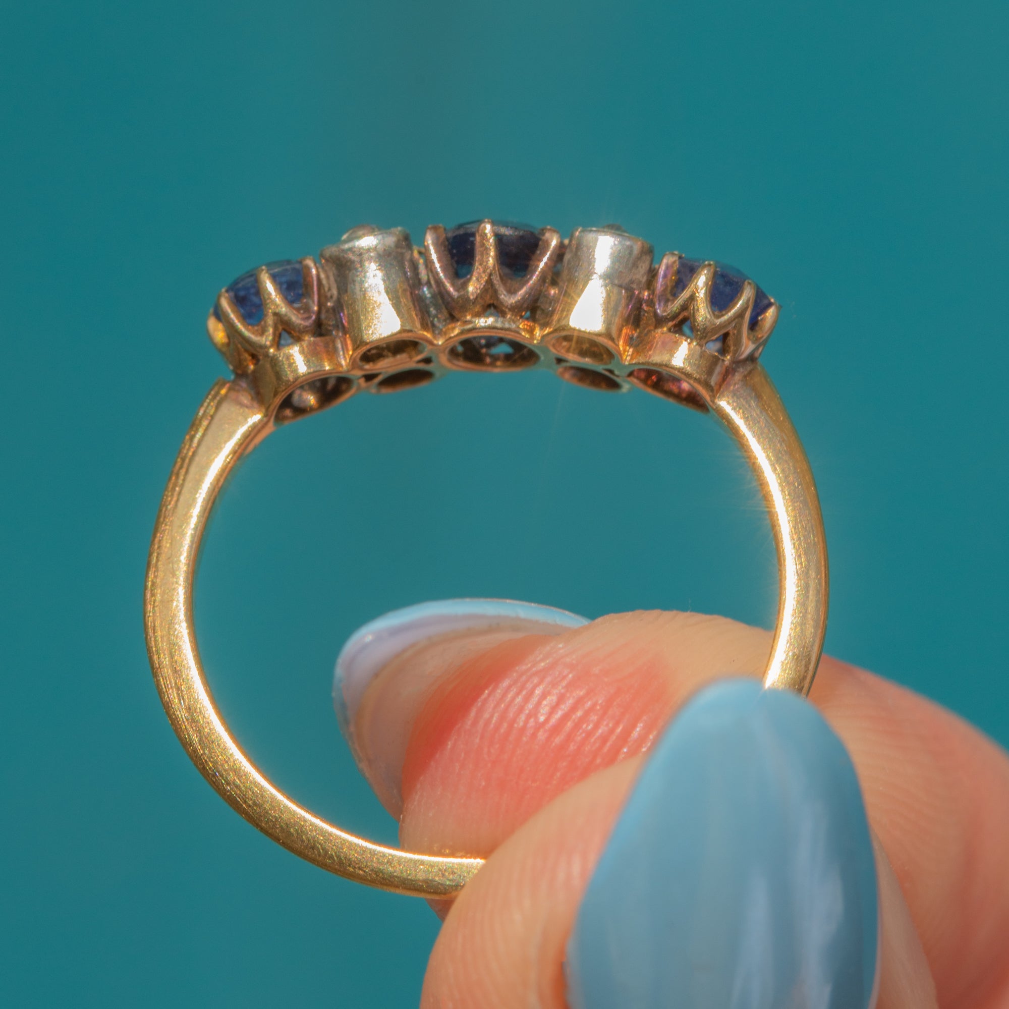 The central Sapphire projects a deep saturated blue hue, flanked by lighter, cornflower blue Sapphires, each displayed within elegant 18ct Gold claws and weighing 0.86cts combined. In typical Victorian fashion, the Diamonds are set within Silver bezels to enhance their bright sparkle.