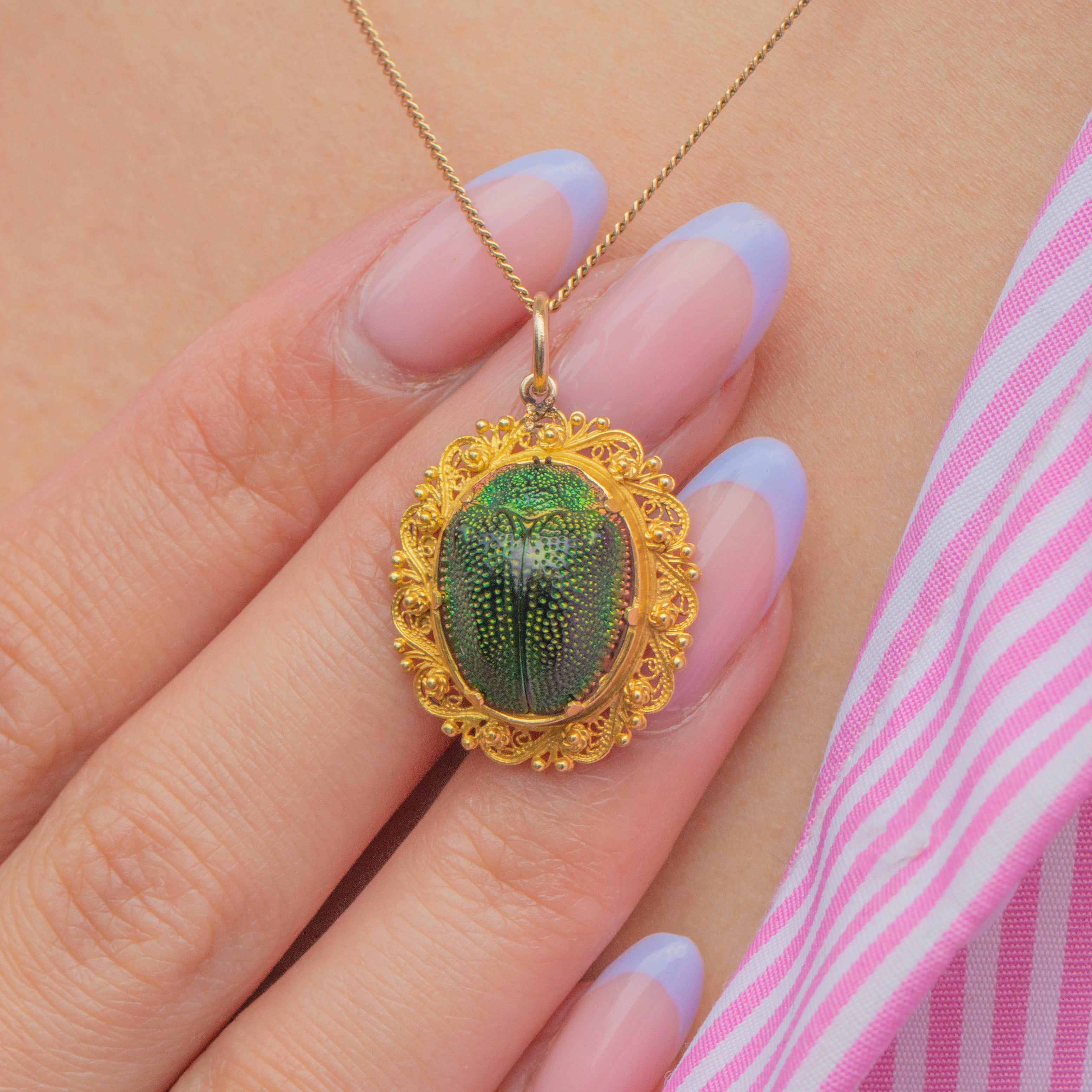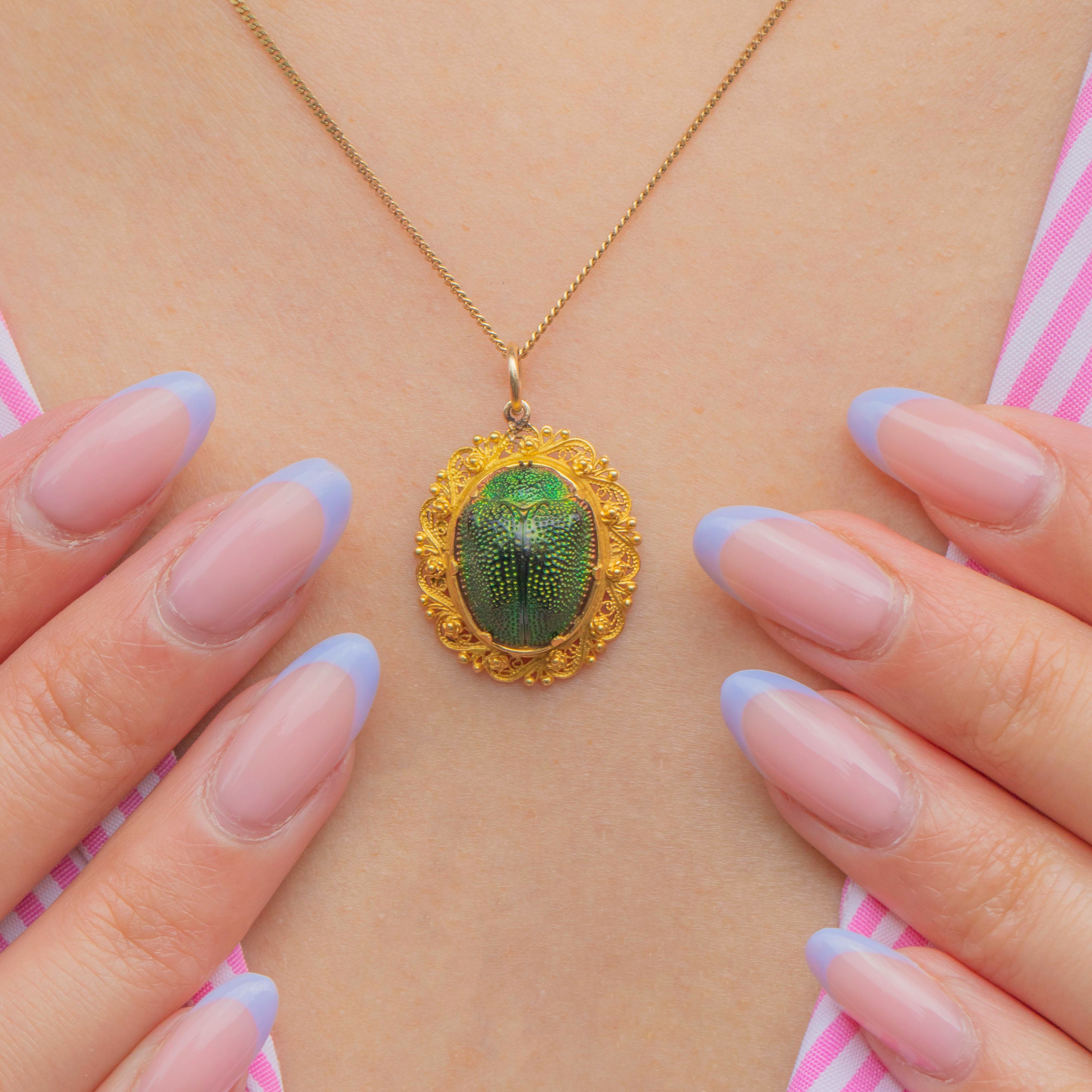 EXCELLENT: This Victorian 18ct Gold Scarab Beetle filigree pendant is in excellent antique condition. The beetle itself is in lovely condition, perfectly preserved, and free from damage. Her 18ct Gold filigree border is in pristine condition - bright and beautiful with no dings or dents. Firmly attached to the Gold jump-ring, this characterful pendant will become your new favourite item!