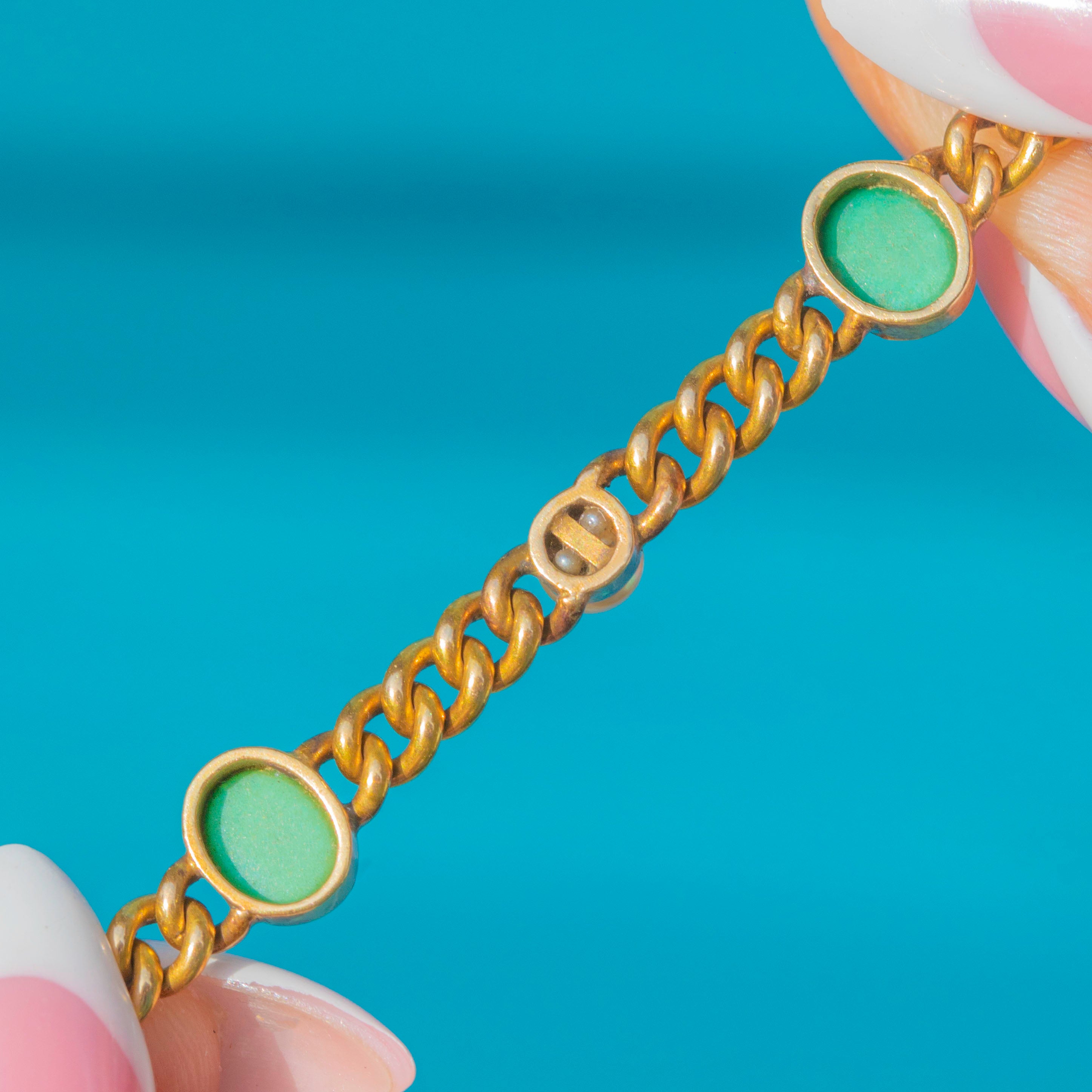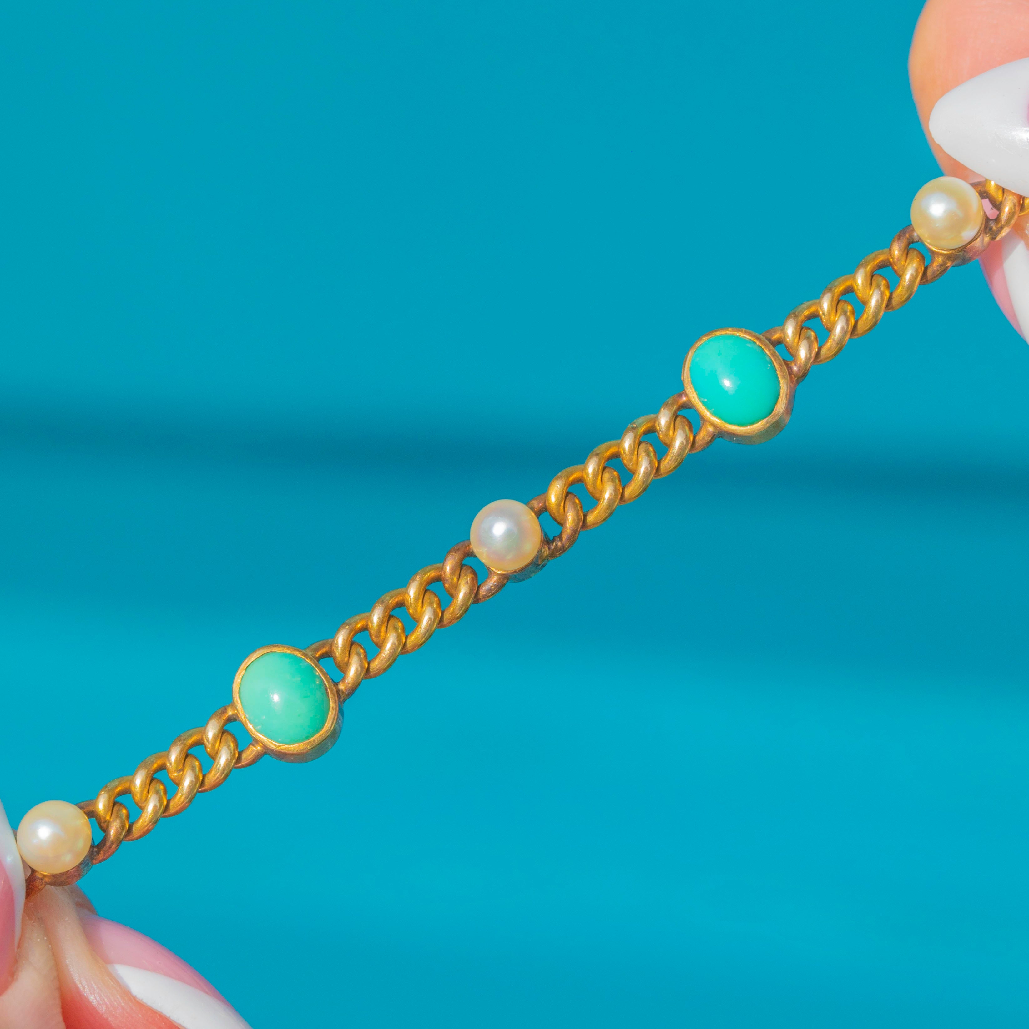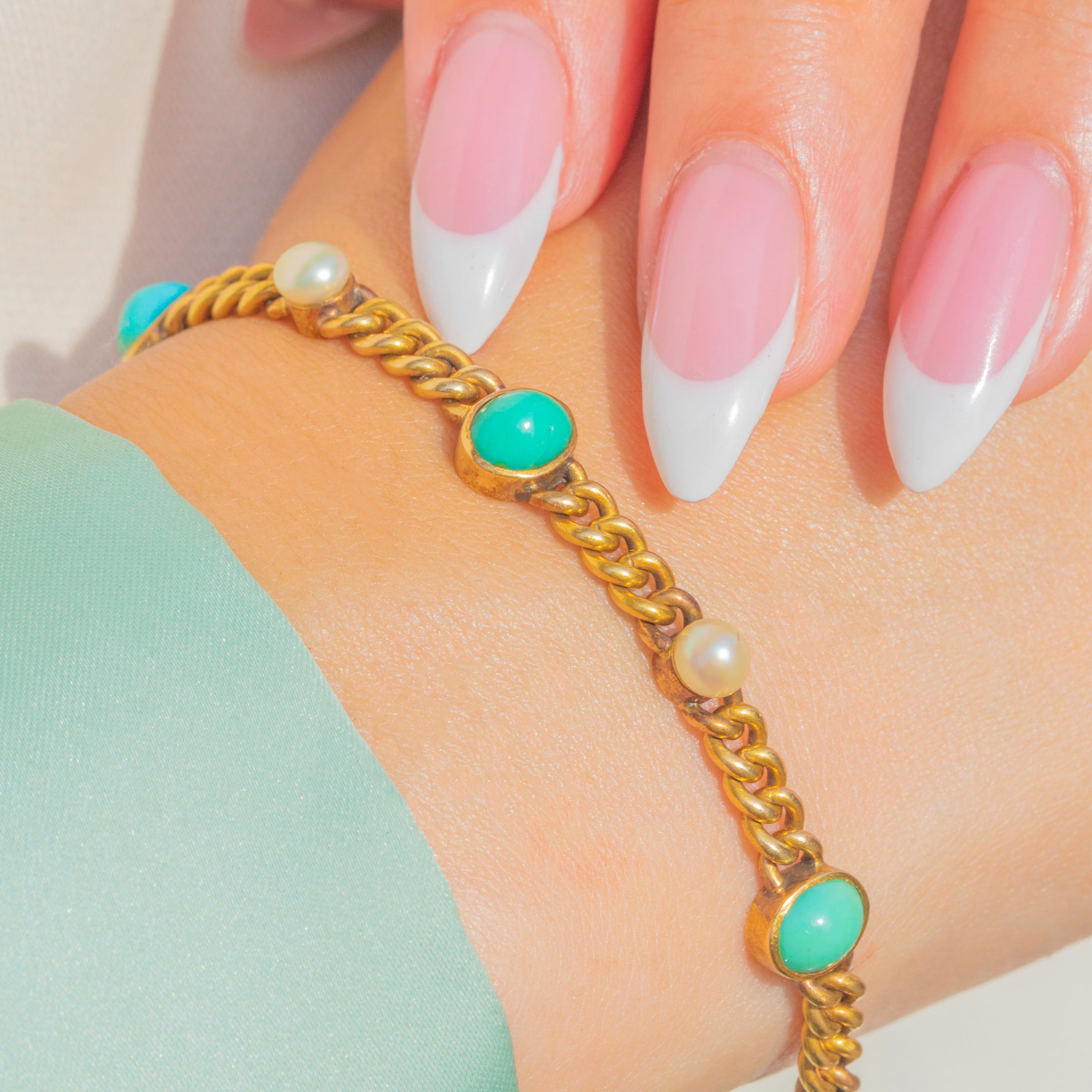 Victorian 18ct Gold Turquoise Natural Pearl Curb Bracelet