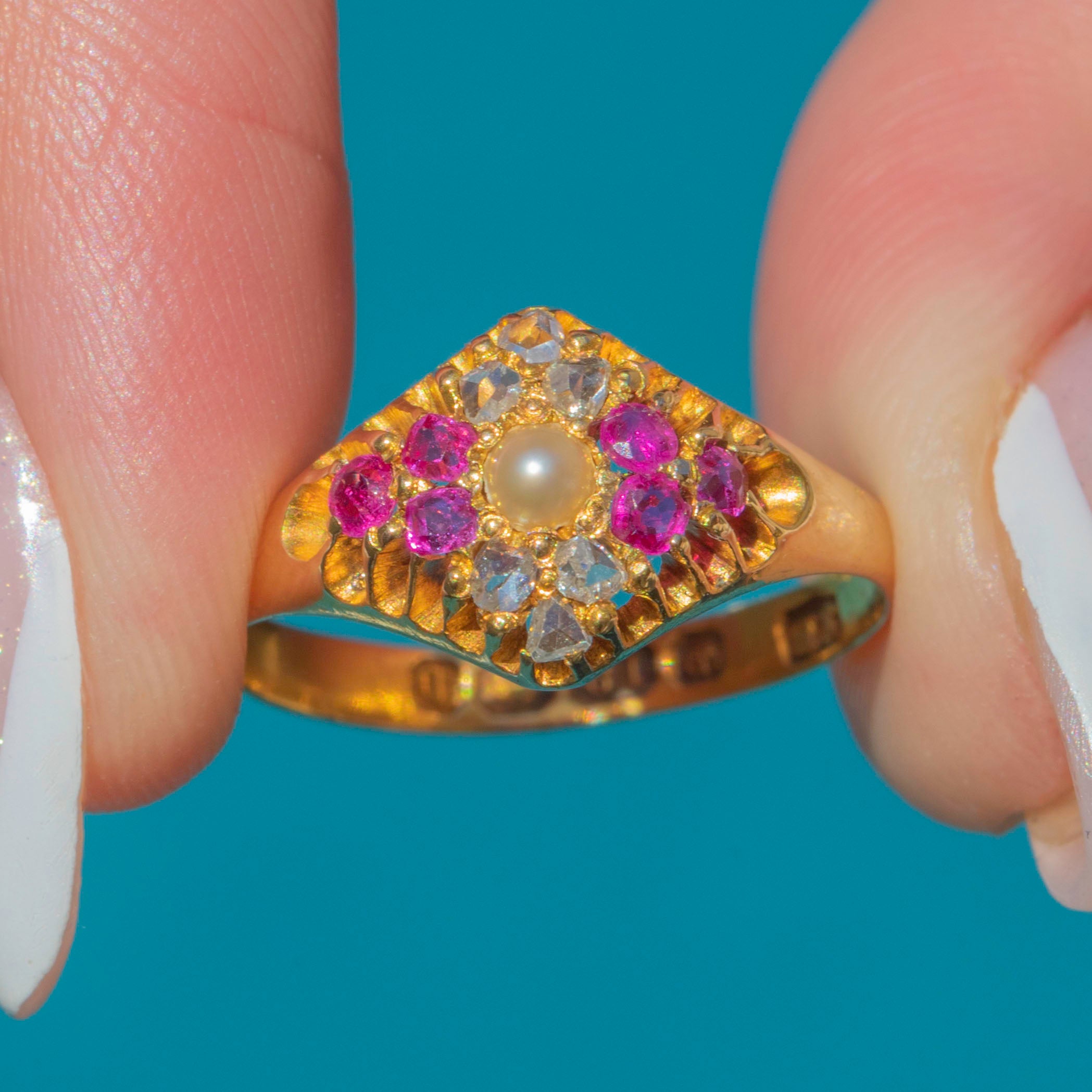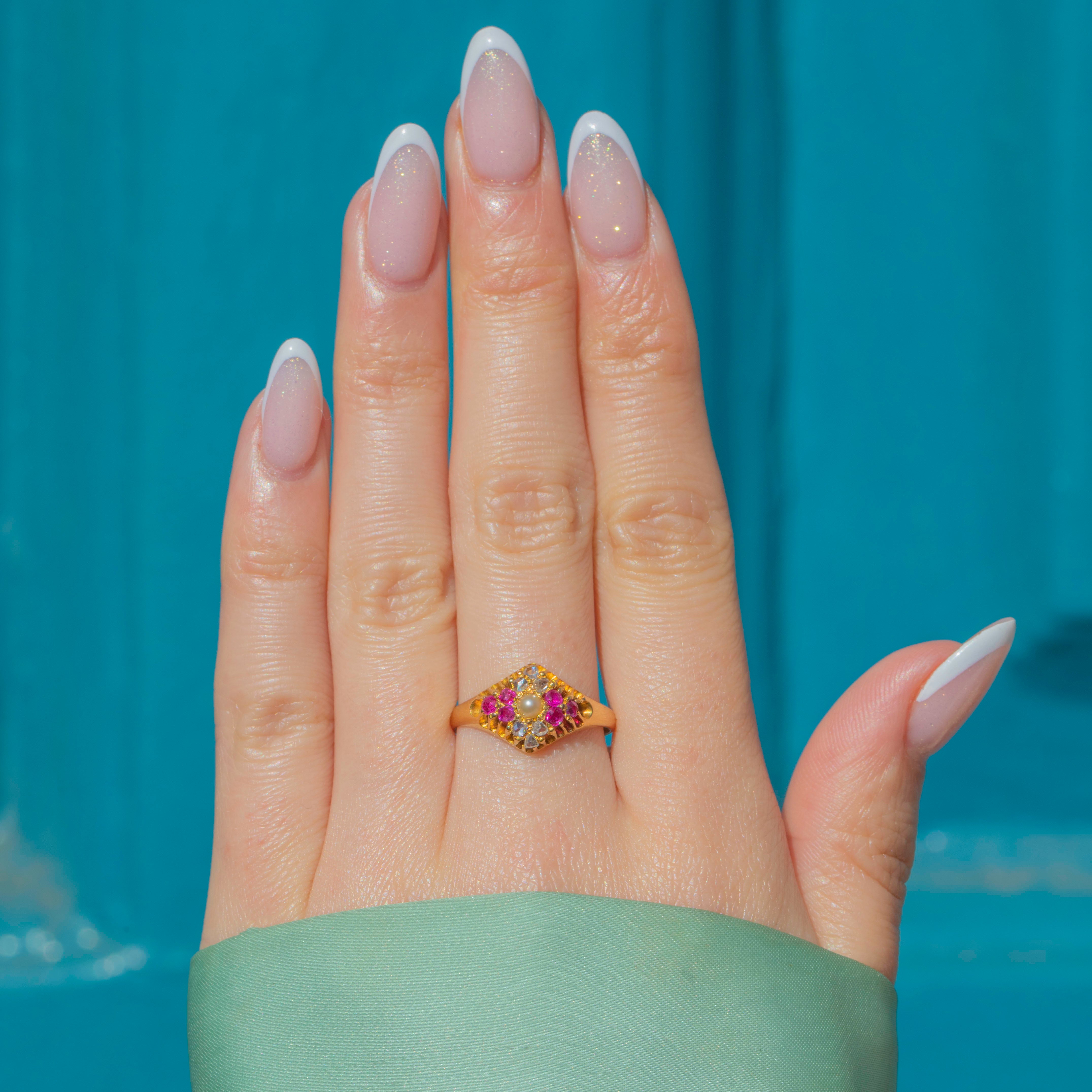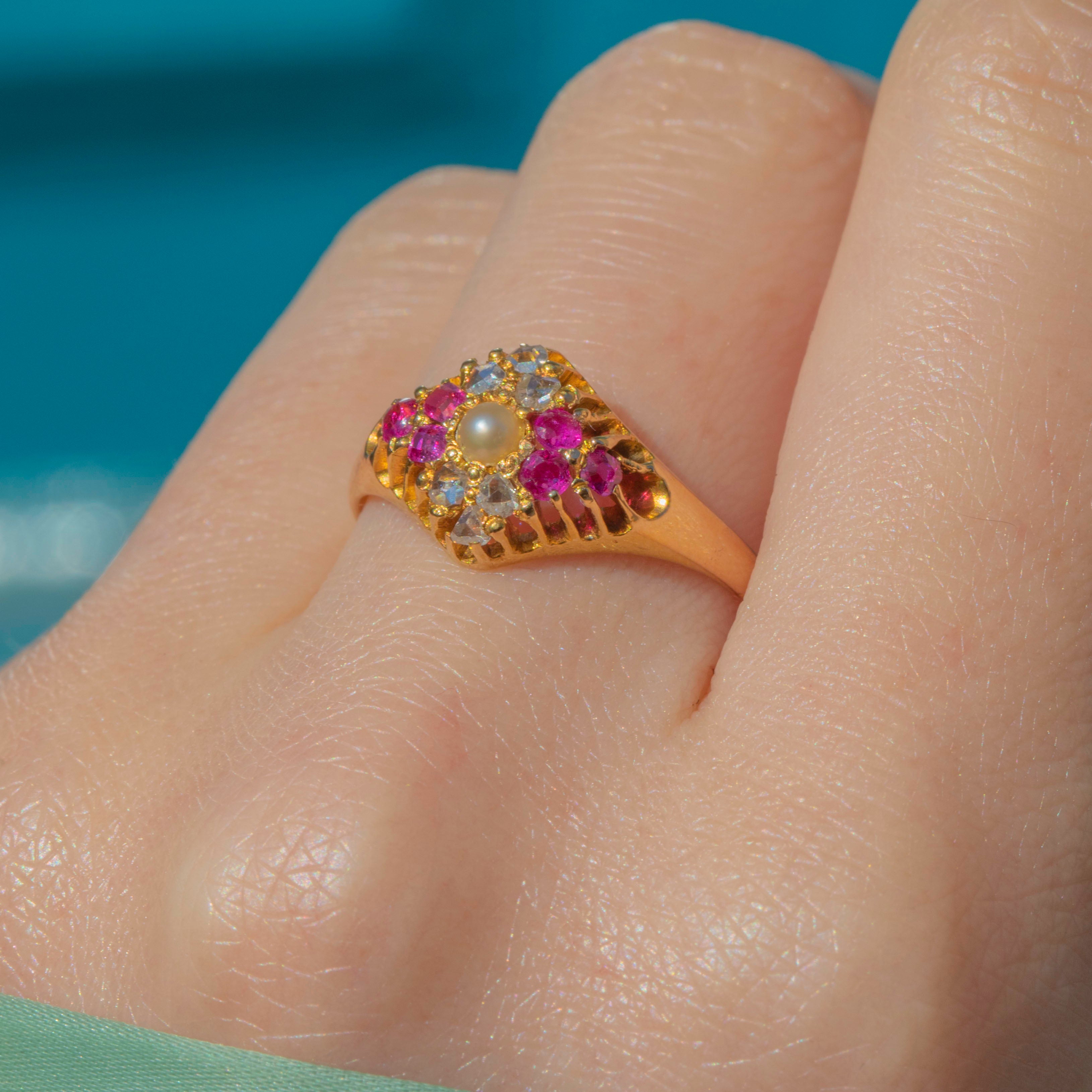 This Victorian 18ct Gold Ruby & rose-cut Diamond Pearl lozenge ring is an antique delight! Displaying a luxurious selection of gemstones, this Victorian ring boasts six fuchsia Rubies and six scintillating Diamonds surrounding an iridescent Pearl -what a treat!