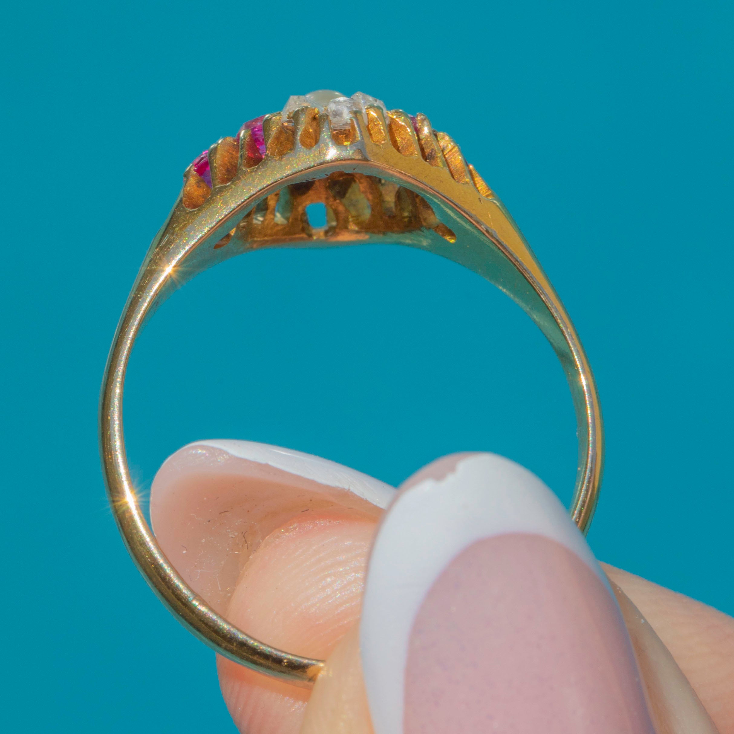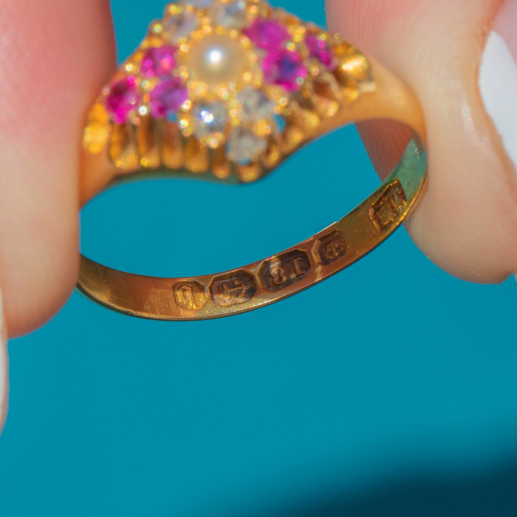 EXCELLENT: This Victorian 18ct Gold Ruby Diamond Pearl lozenge ring is in excellent condition. Each gemstone is radiant and secure in its claw settings, with very little signs of wear. Fully hallmarked and dated to 1876 and with a robust, chunky band, you'll be able to enjoy wearing this authentic piece of Victorian jewellery for many more years to come!