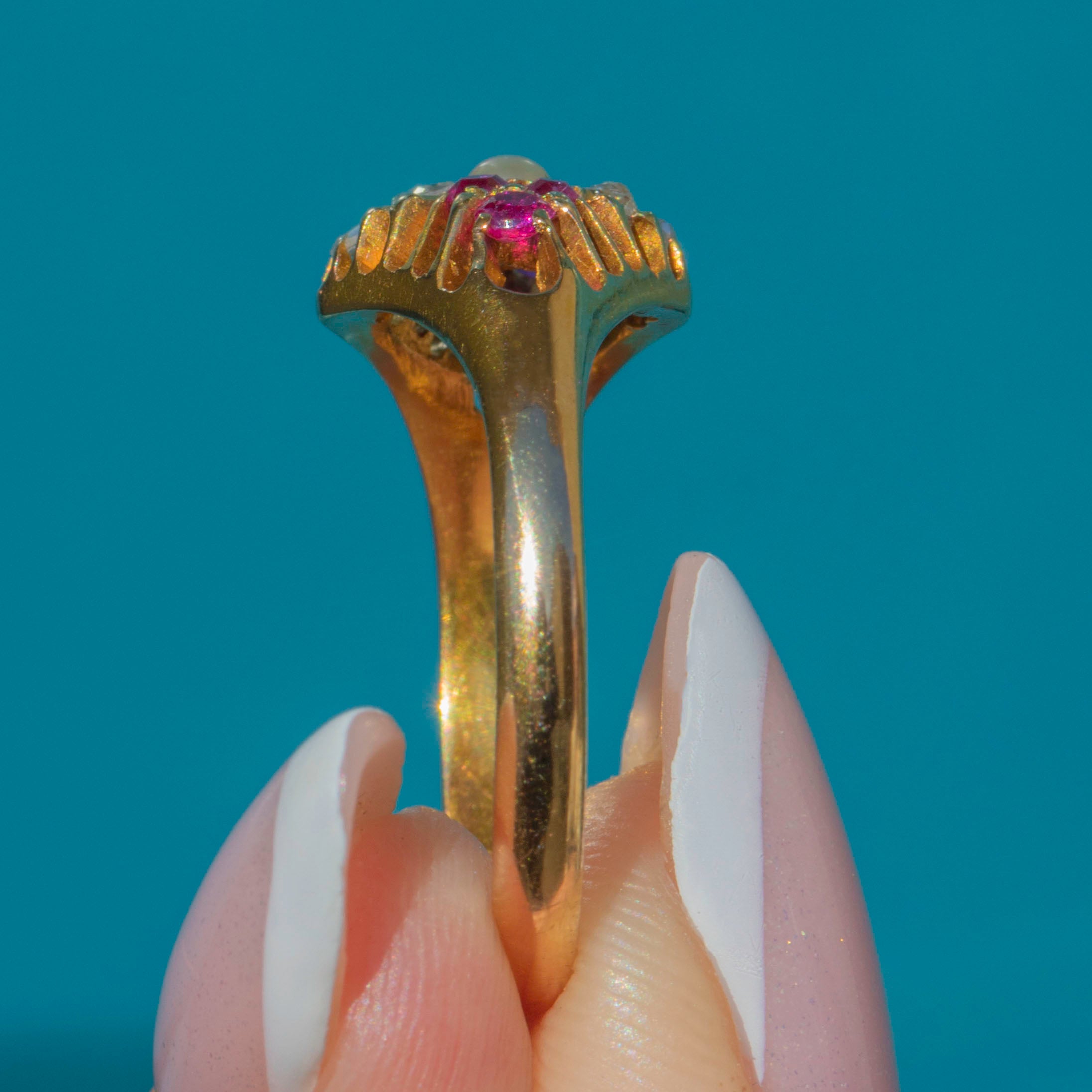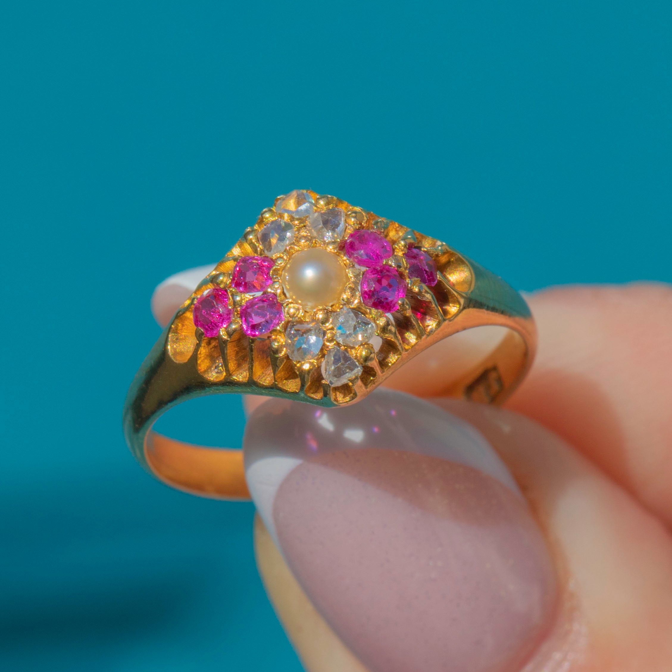 Victorian 18ct Gold Ruby Rose-Cut Diamond Pearl Lozenge Ring, c.1876