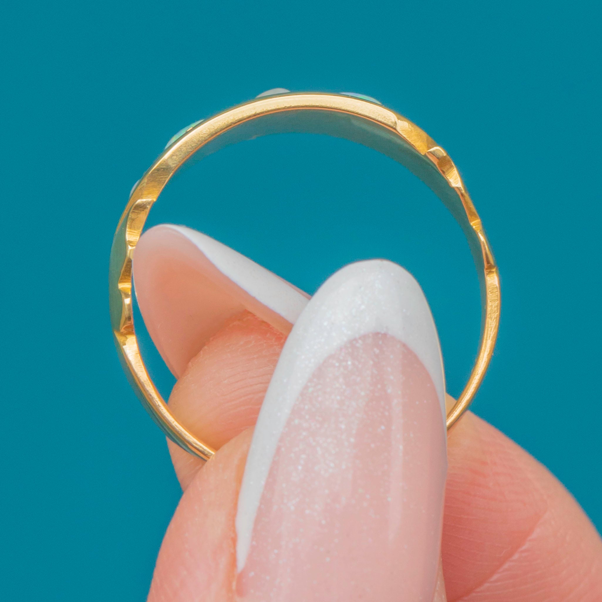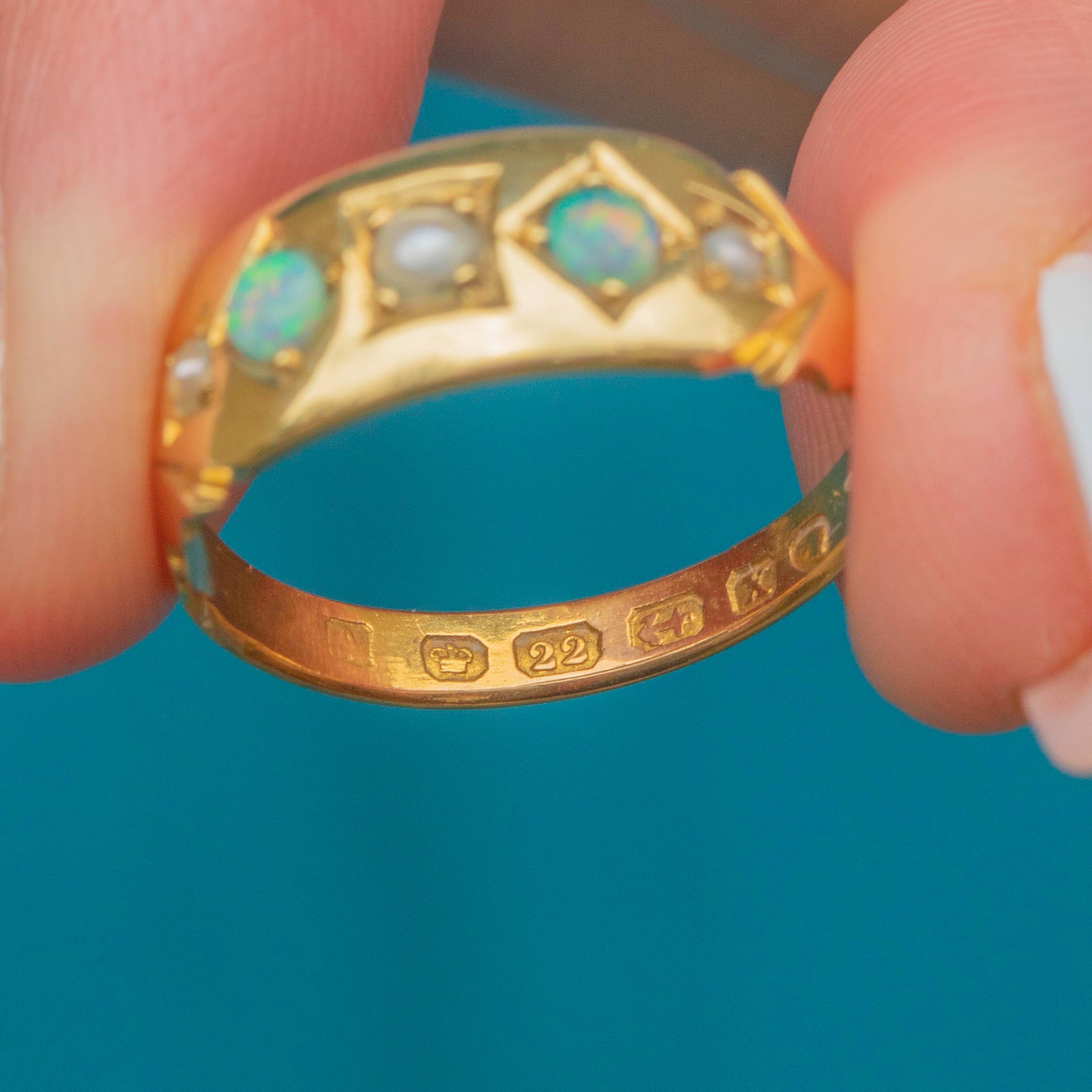 VERY GOOD-EXCELLENT: This Victorian 22ct Gold Opal Pearl gypsy ring is in wonderful condition. The Gold has a sumptuous glow with wonderful reflective qualities, and the band is smooth providing comfortable wear. There is some mild wear around the gemstone settings, noticeable under close inspection, but they all remain securely set and free from surface wear. The hallmarks are fully legible, allowing us to date this authentic piece of Victorian jewellery to 1872!