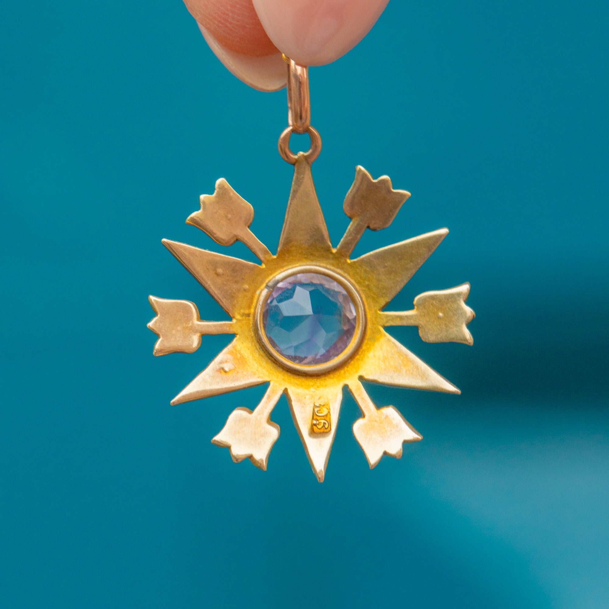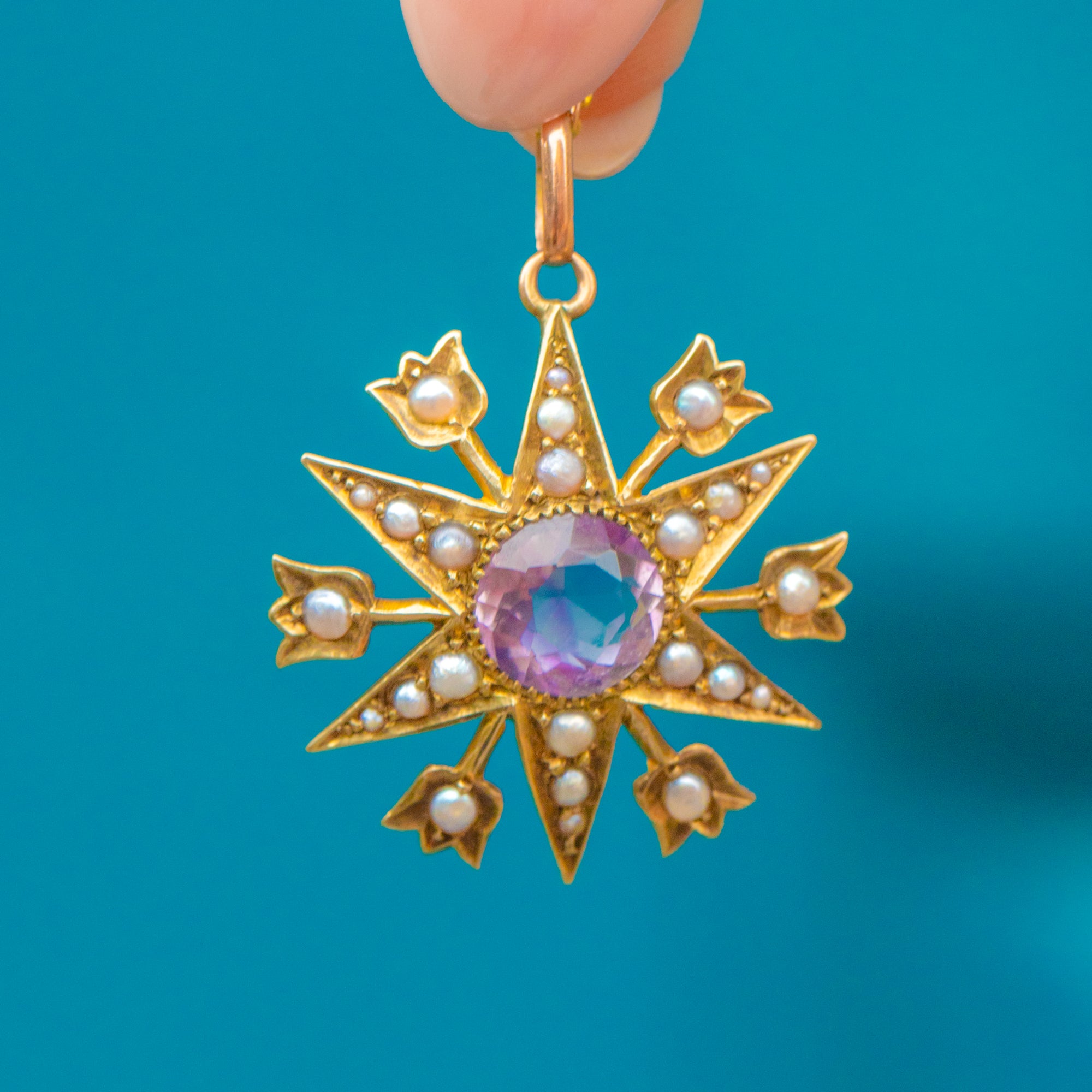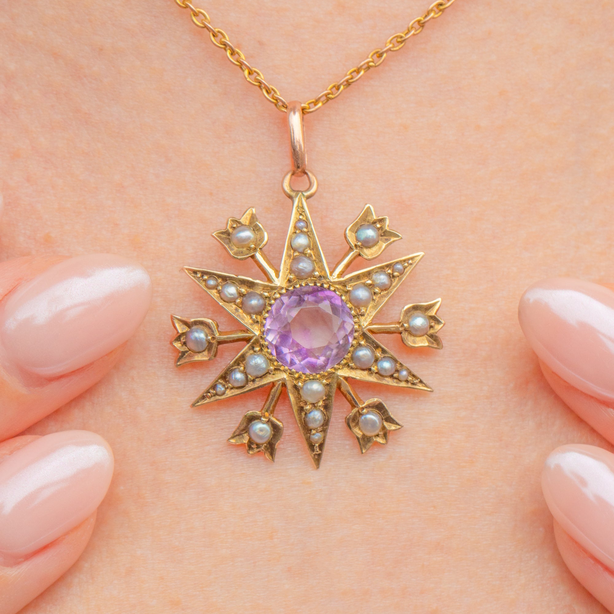 Victorian 9ct Gold Amethyst Pearl Starburst Pendant, 1.45ct Amethyst