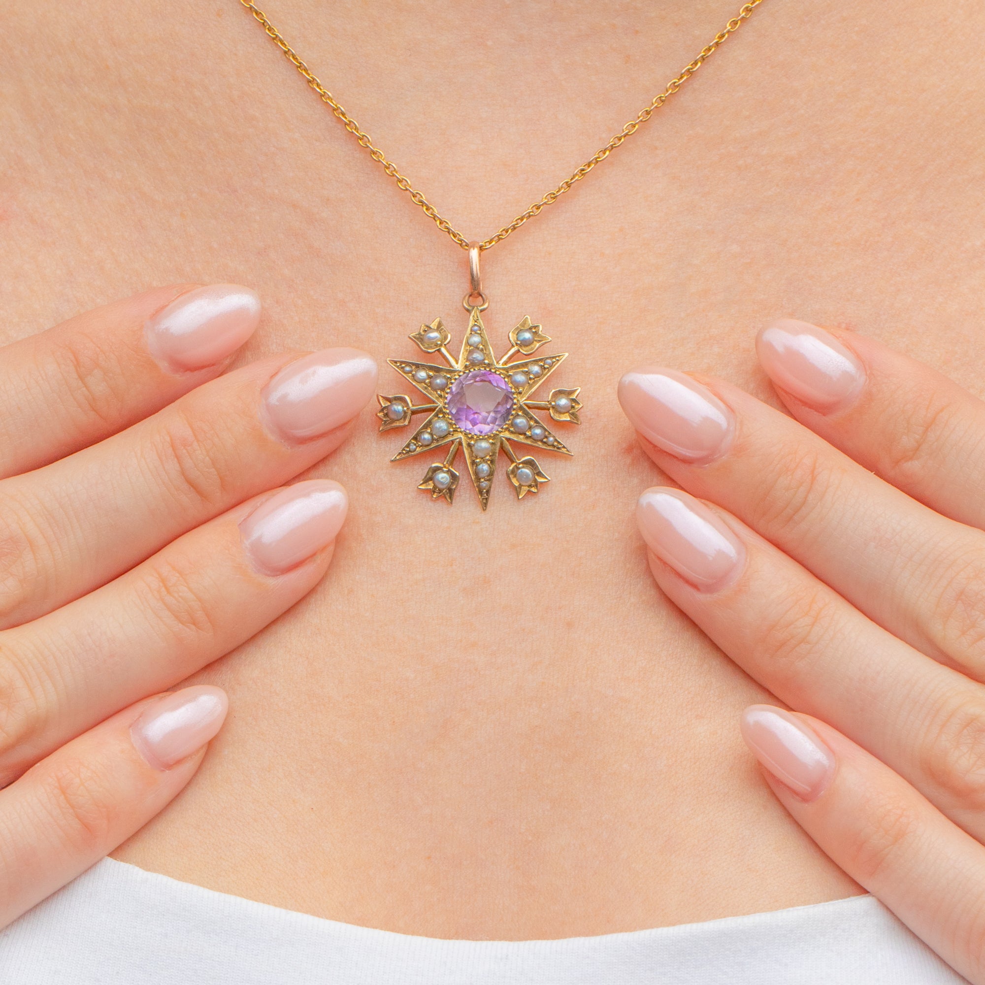 Brighten up your jewellery collection with this Victorian 9ct Gold Amethyst Pearl starburst pendant! The classically Victorian form of this beauty has been crafted from a honey-hued 9ct Gold and is embellished with shimmering Silver Pearls covering each point, with a lilac infused 1.45ct Amethyst at her centre.
