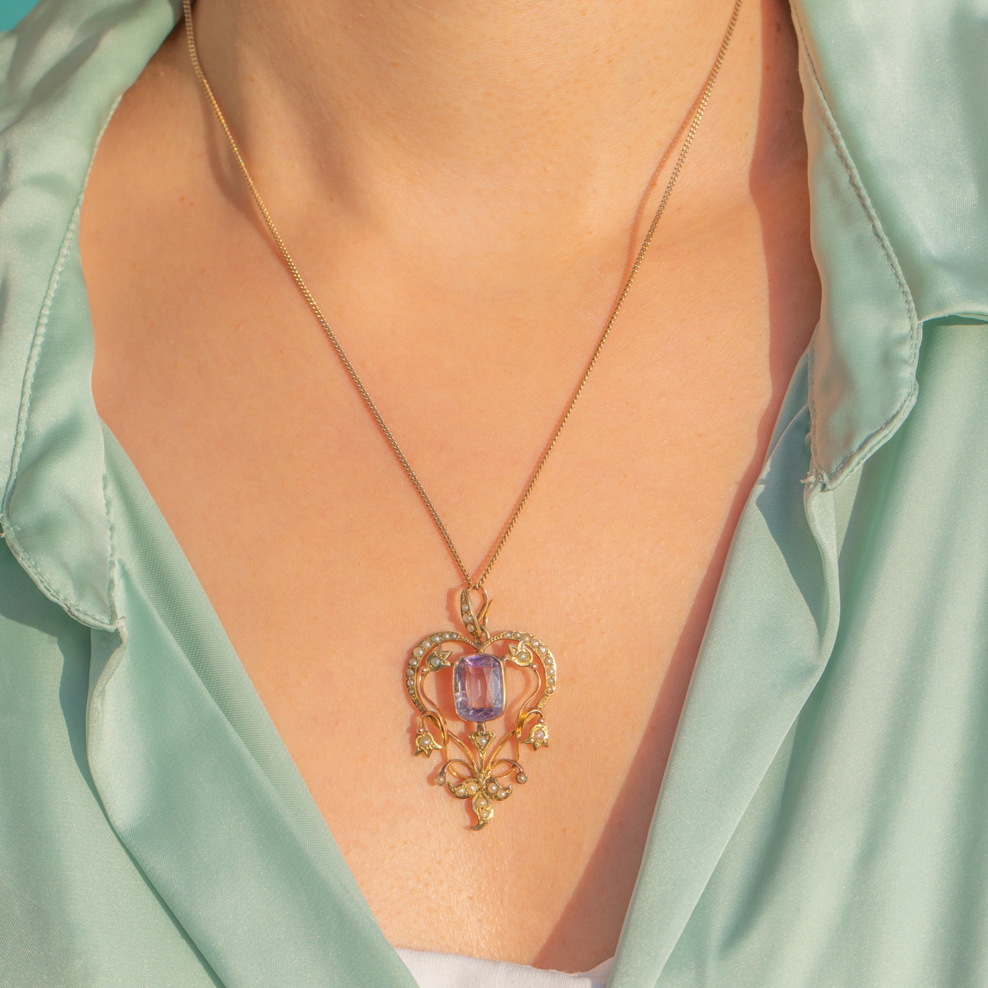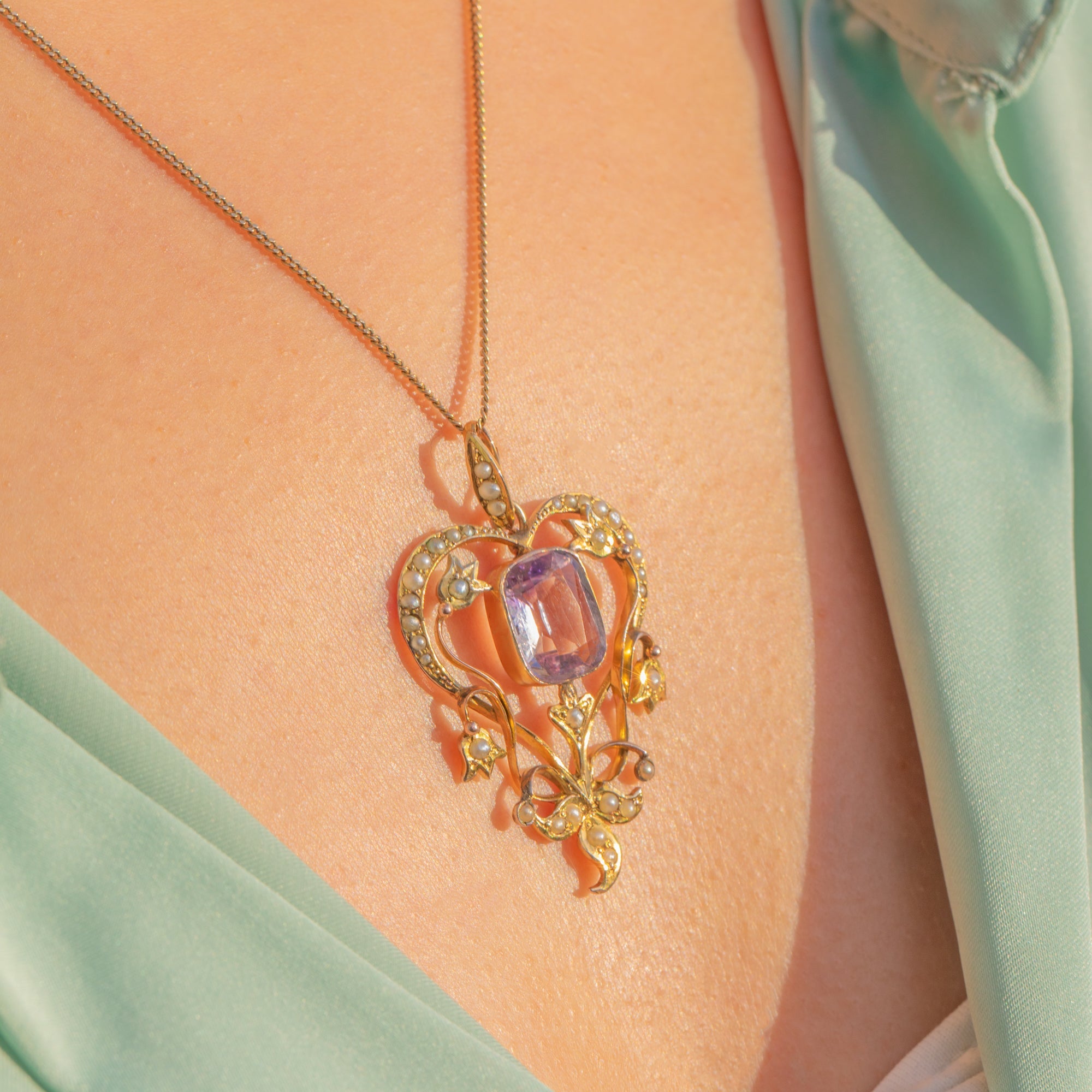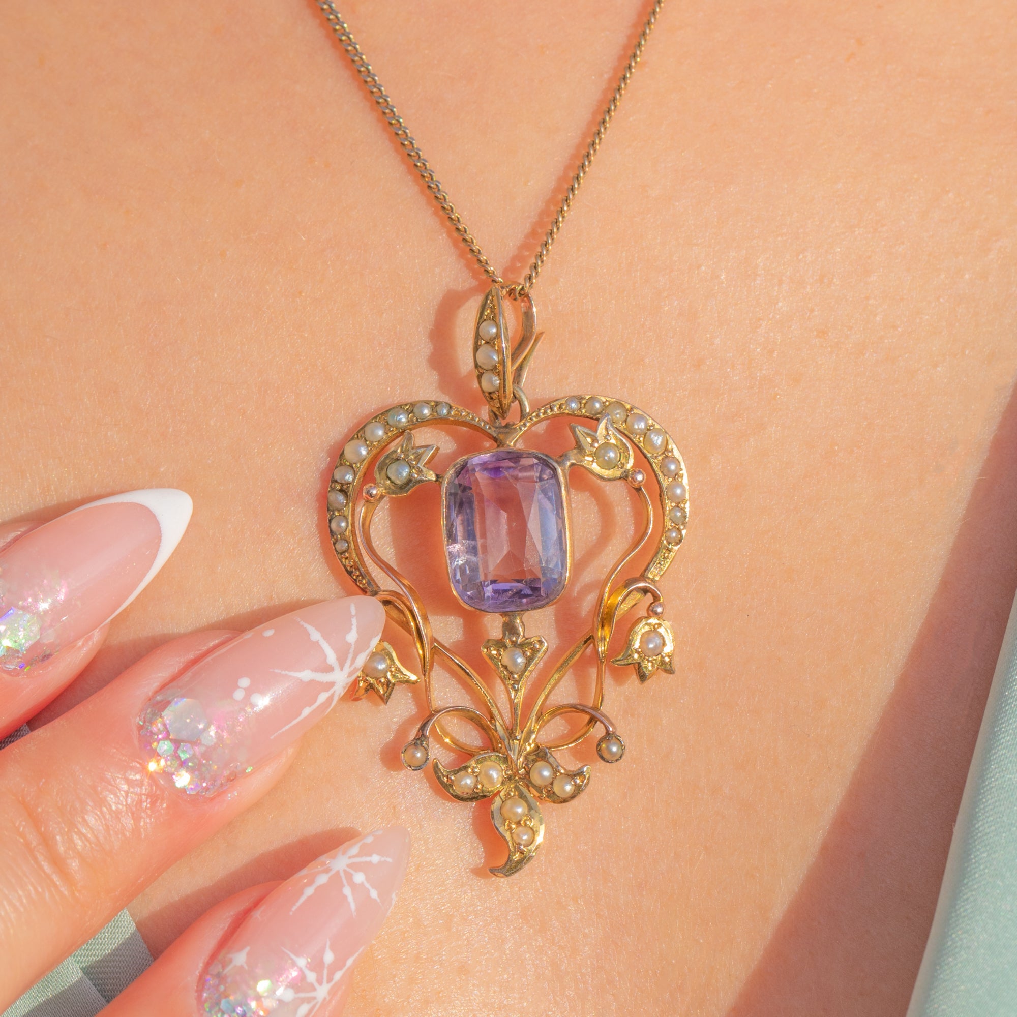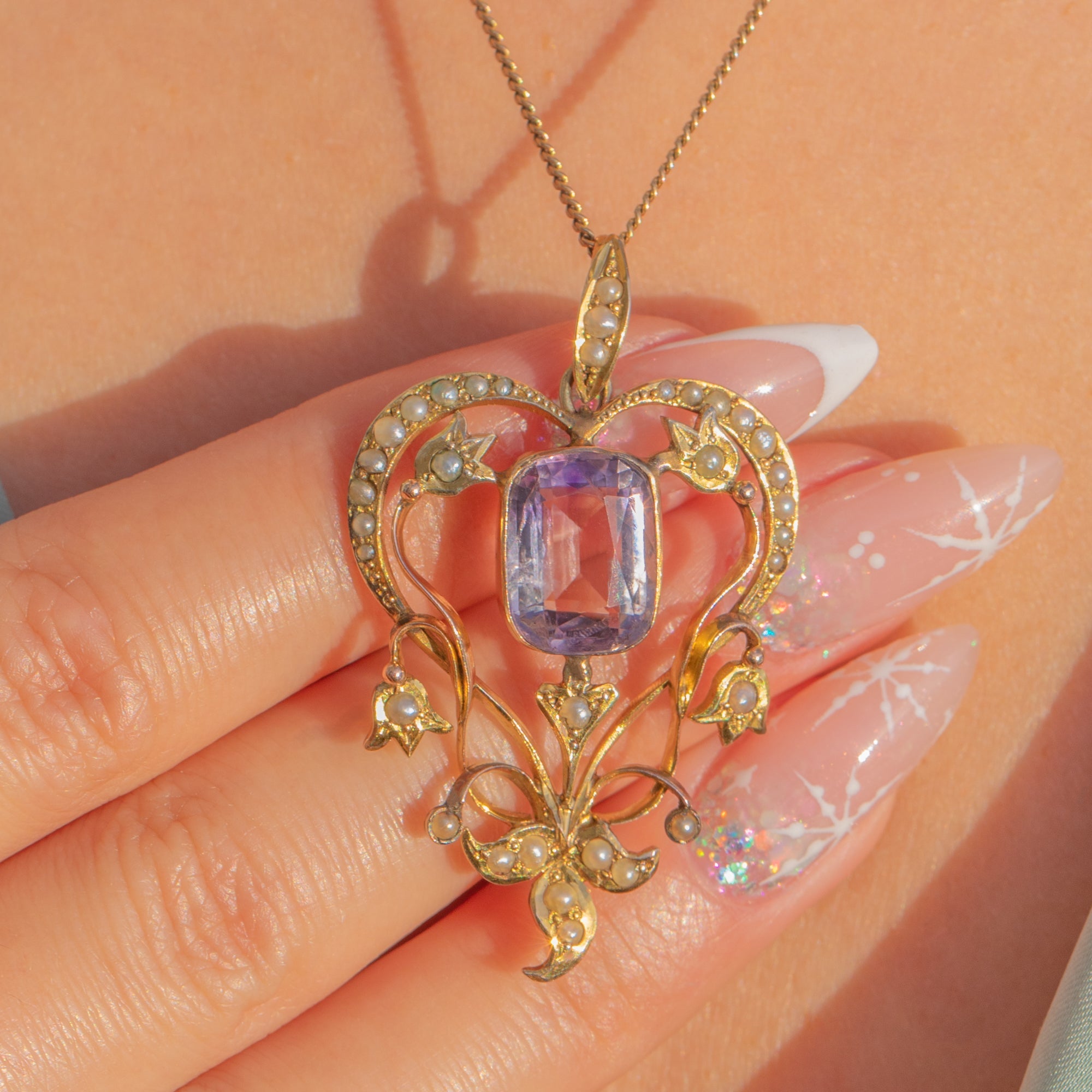 This Victorian pendant captures the elegance of the era beautifully, featuring a glowing 3.50ct cushion-cut Amethyst framed by delicate scrolling Gold and Seed Pearls. Soft lavender hues shimmer through the stone, while the pearls accent the design like tiny drops of light.