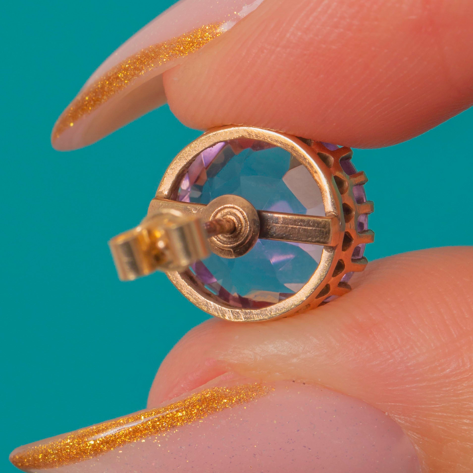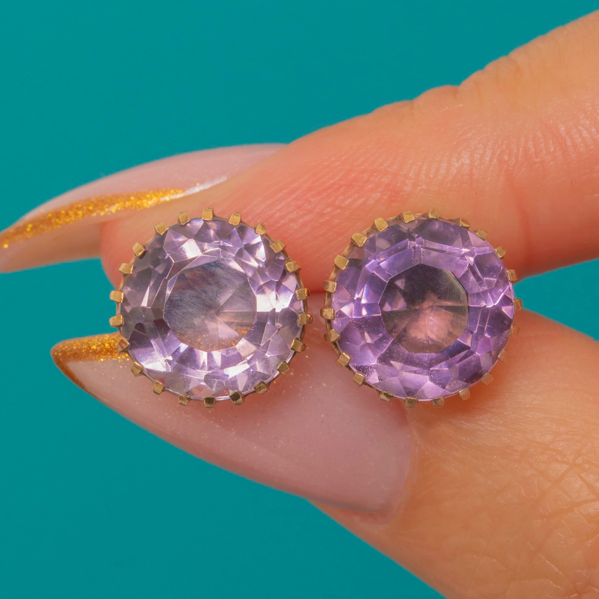 VERY GOOD: The Amethysts are bright and well-matched, showing only minor facet wear under magnification. The antique settings are secure and in lovely condition, complemented by sturdy modern 9ct Gold posts and butterfly backs for reliable daily wear.