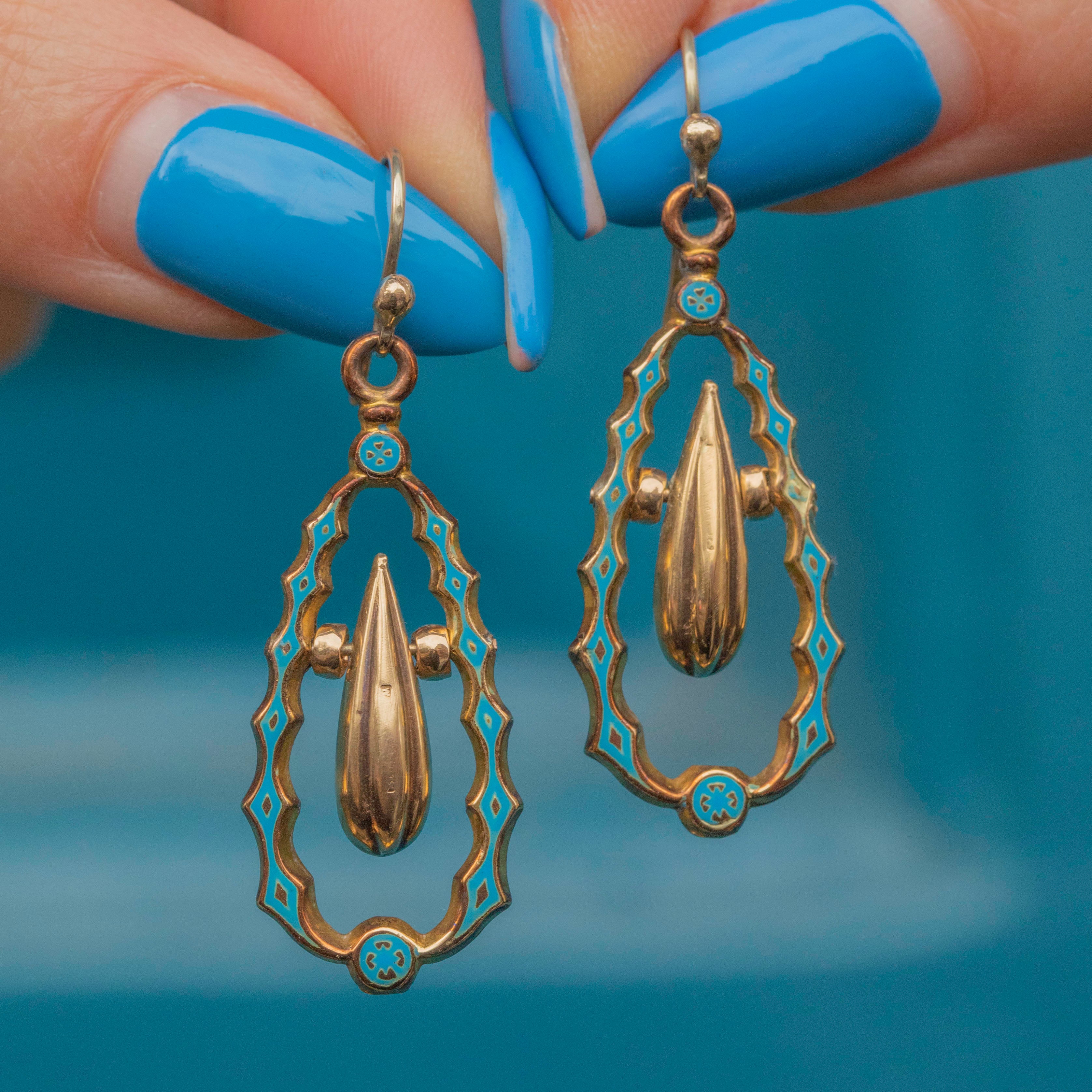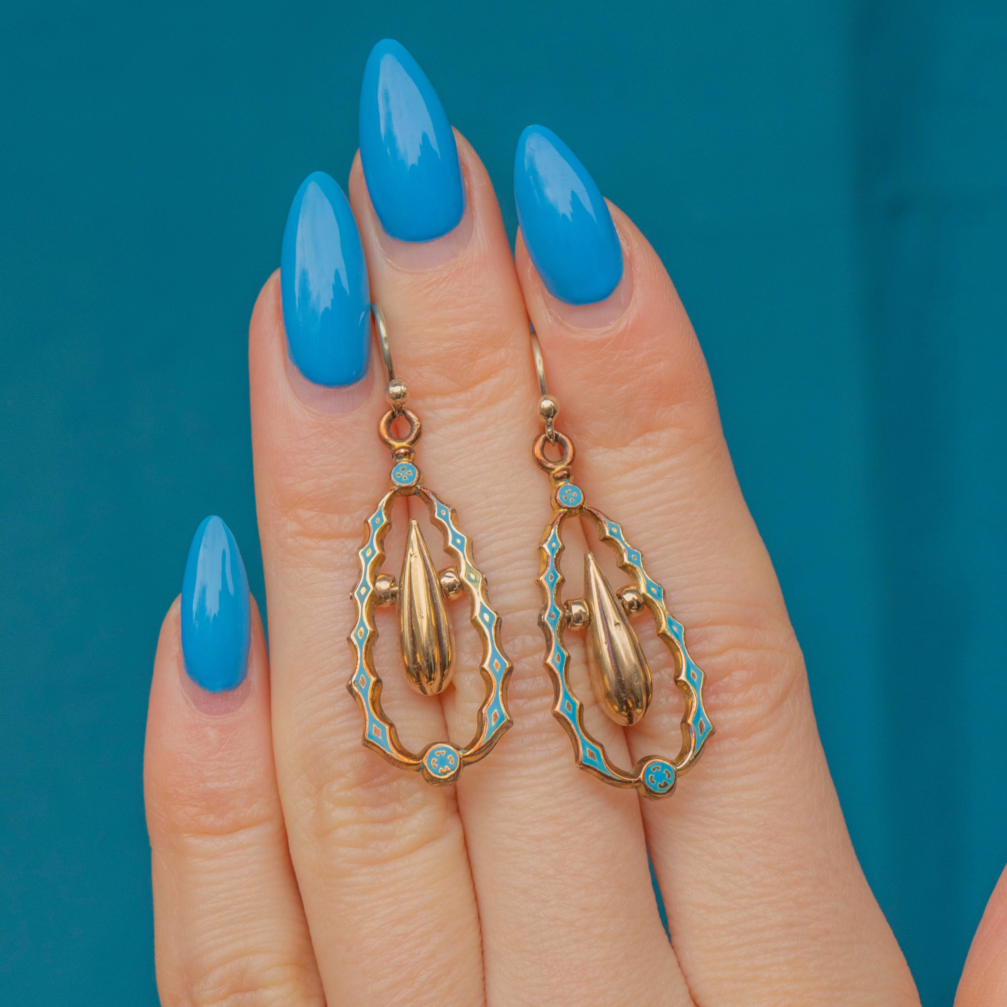 These Victorian 9ct Gold Blue Enamel torpedo drop earrings are a gorgeous statement pair to add to your collection!