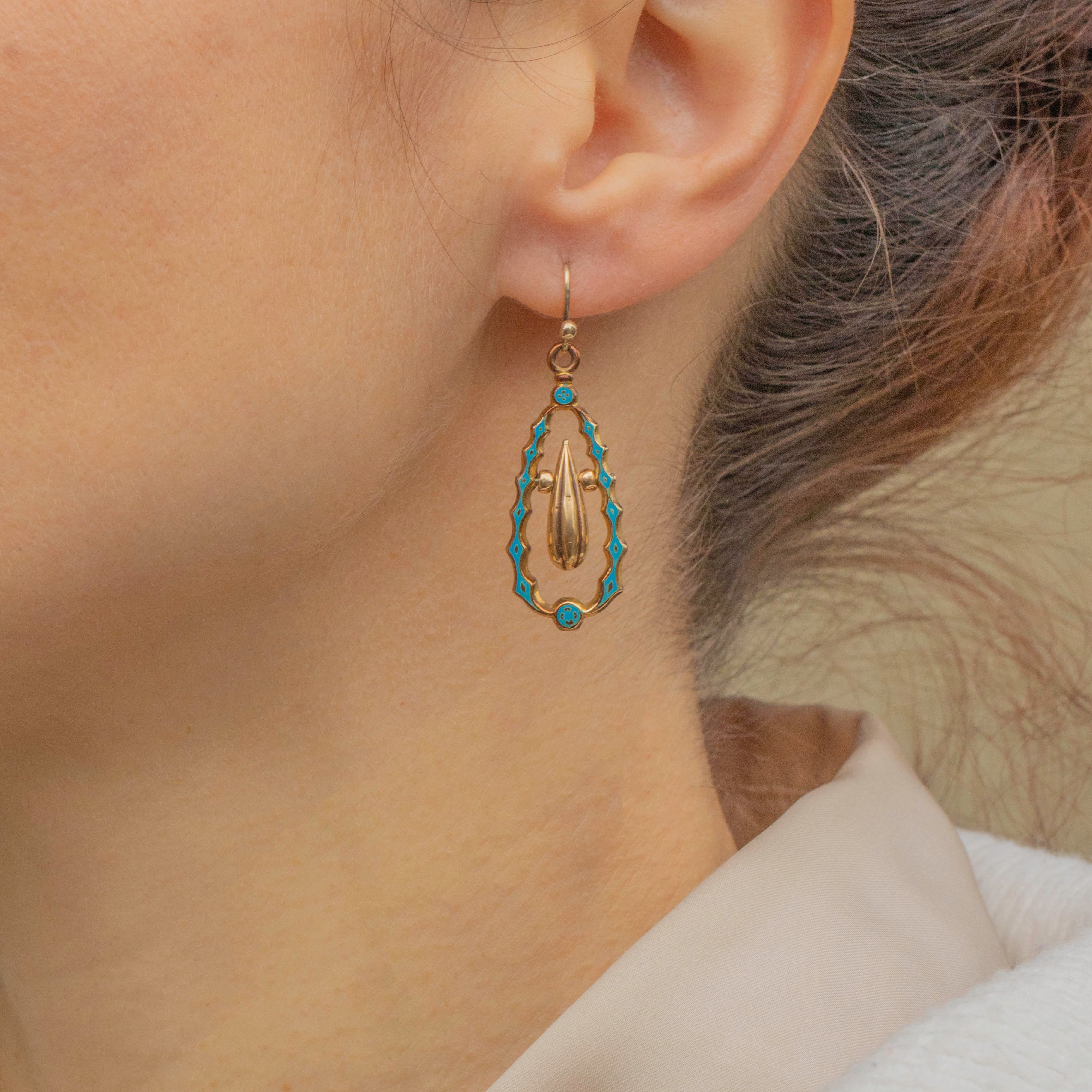 VERY GOOD-EXCELLENT: These Victorian 9ct Gold Blue Enamel torpedo drop earrings are in very good-excellent condition. The Gold is rich and buttery, and the enamel is vibrant. There are some minor signs of wear commensurate with age, however this does not detract from her beauty. In great condition, they are soon to become your new go-to!