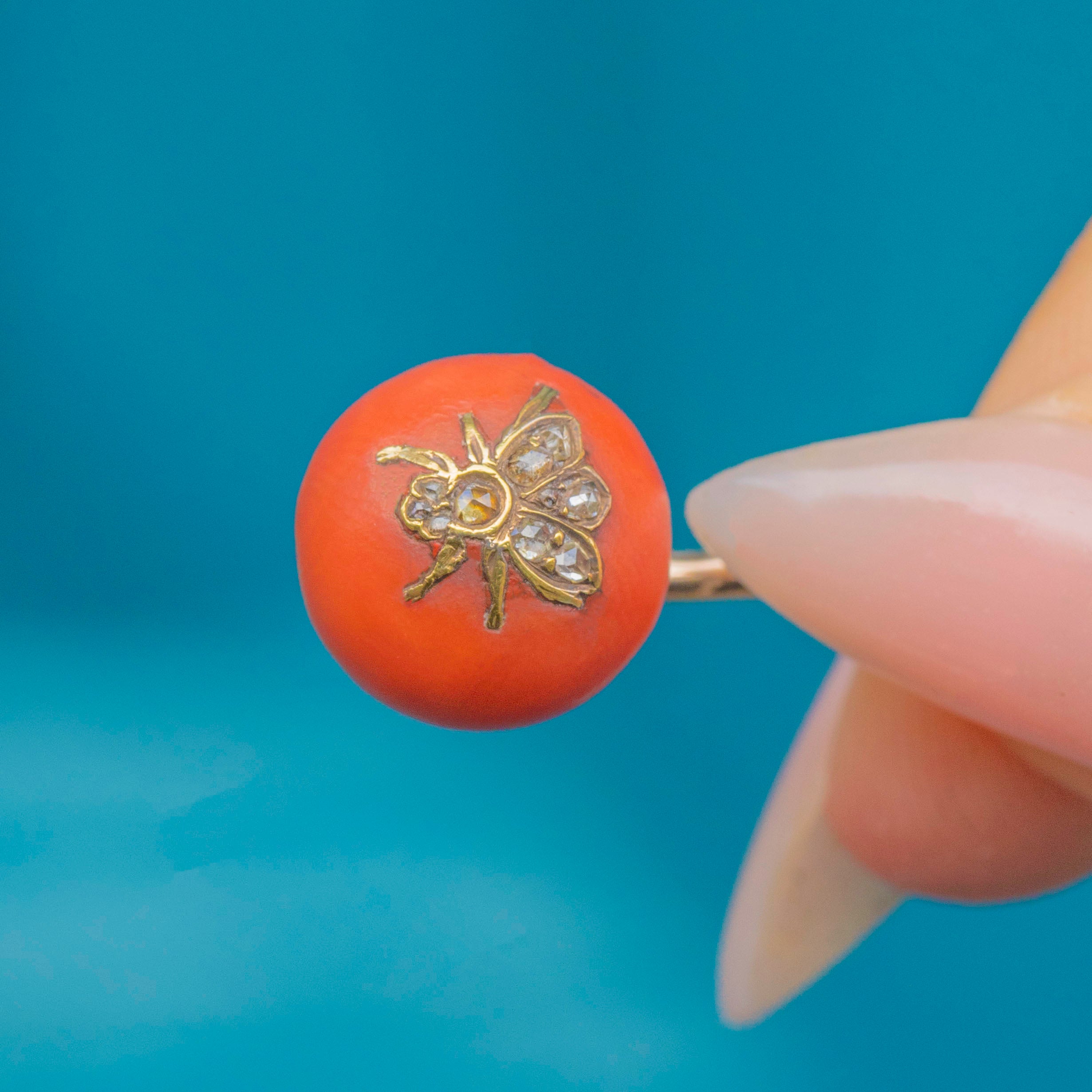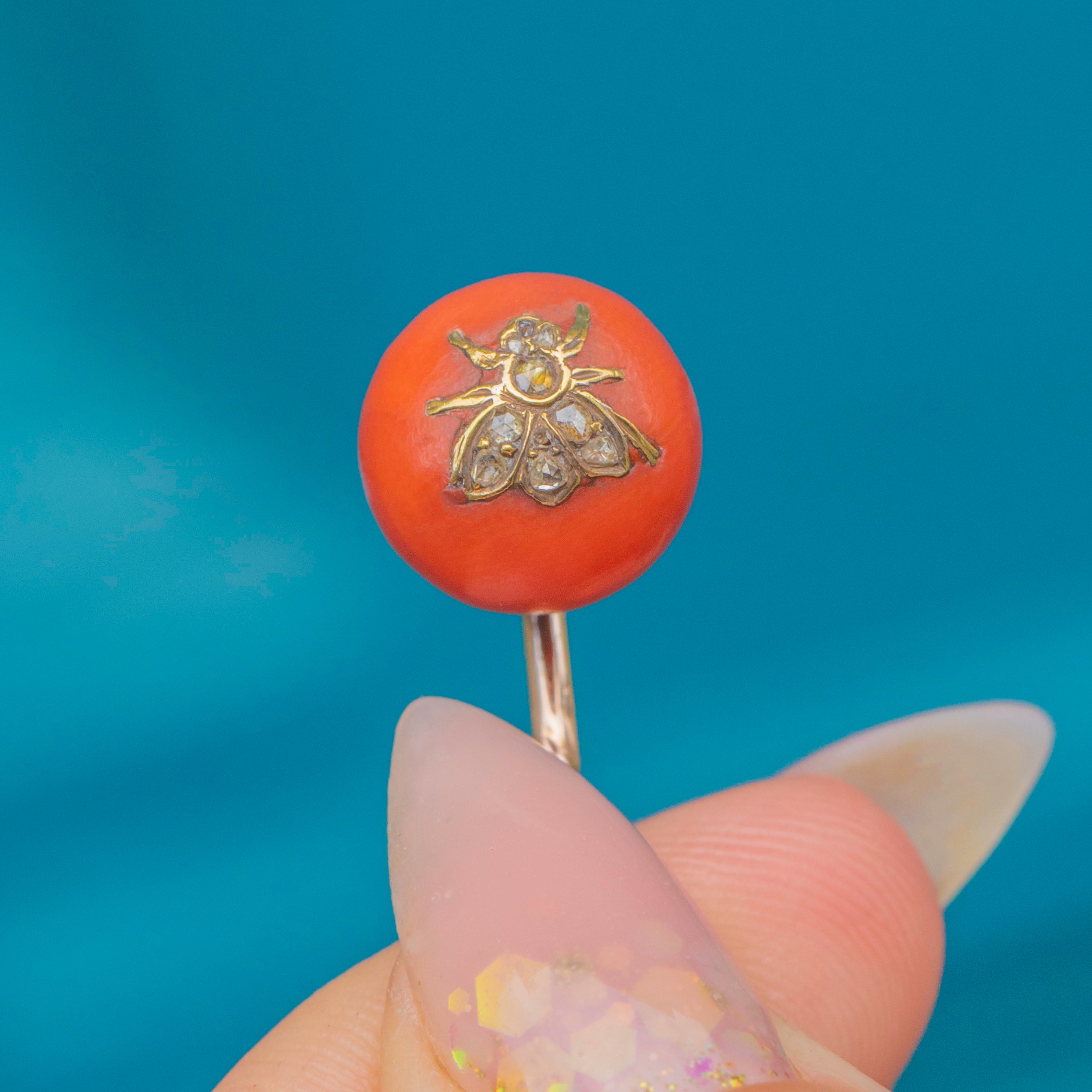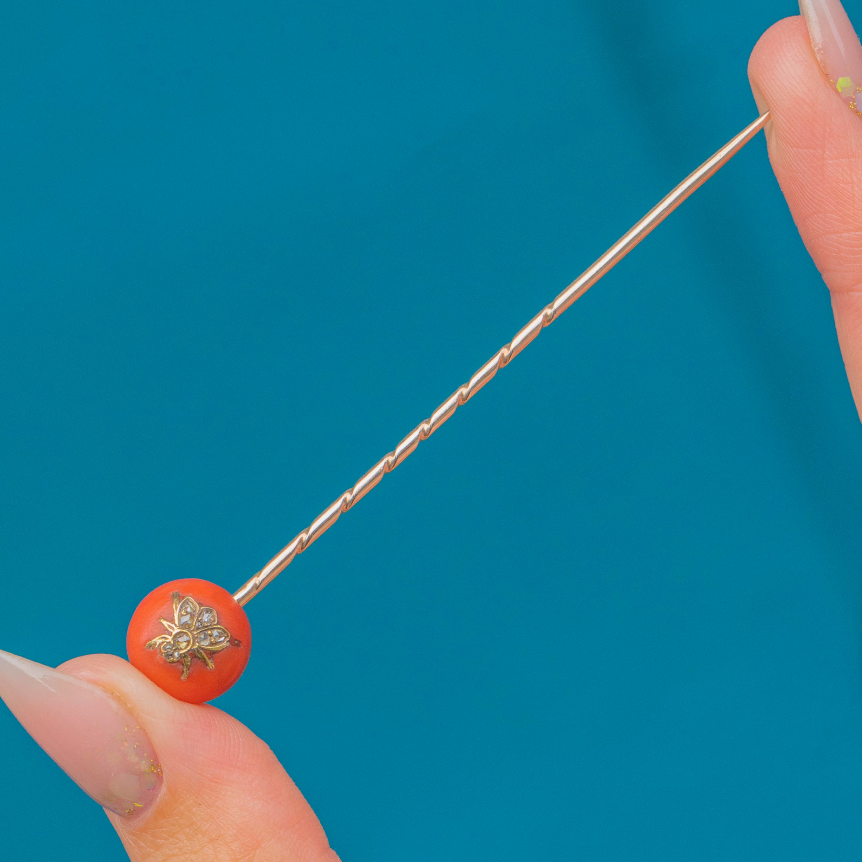 This elegant Victorian stick pin pairs a glowing Coral with a flash of Diamond, all set in warm 9ct Gold. The twisted pin leads to a smooth, Coral orb topped with an applied Gold fly motif set with tiny rose-cut Diamonds, providing a subtle sparkle against the rich orange tones.