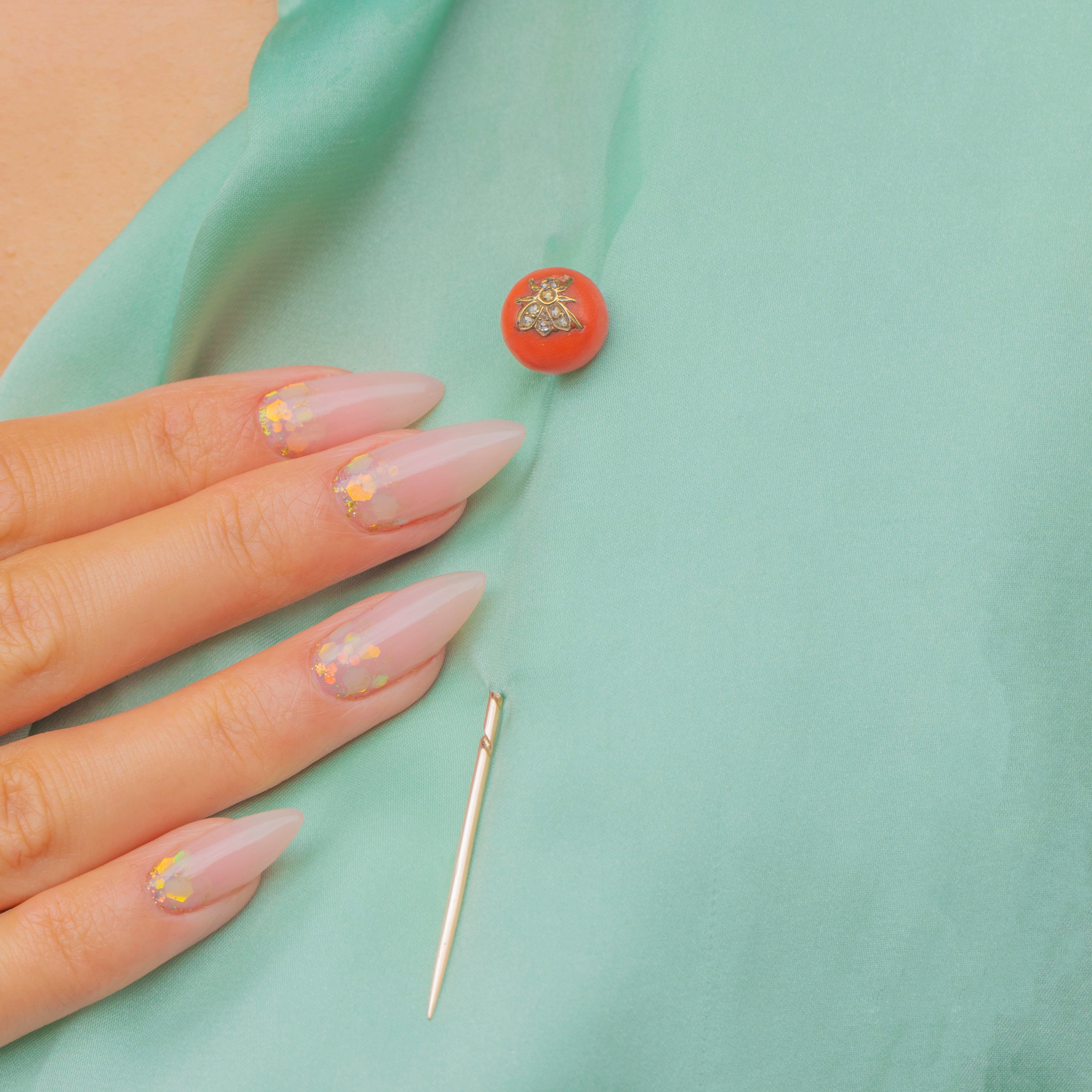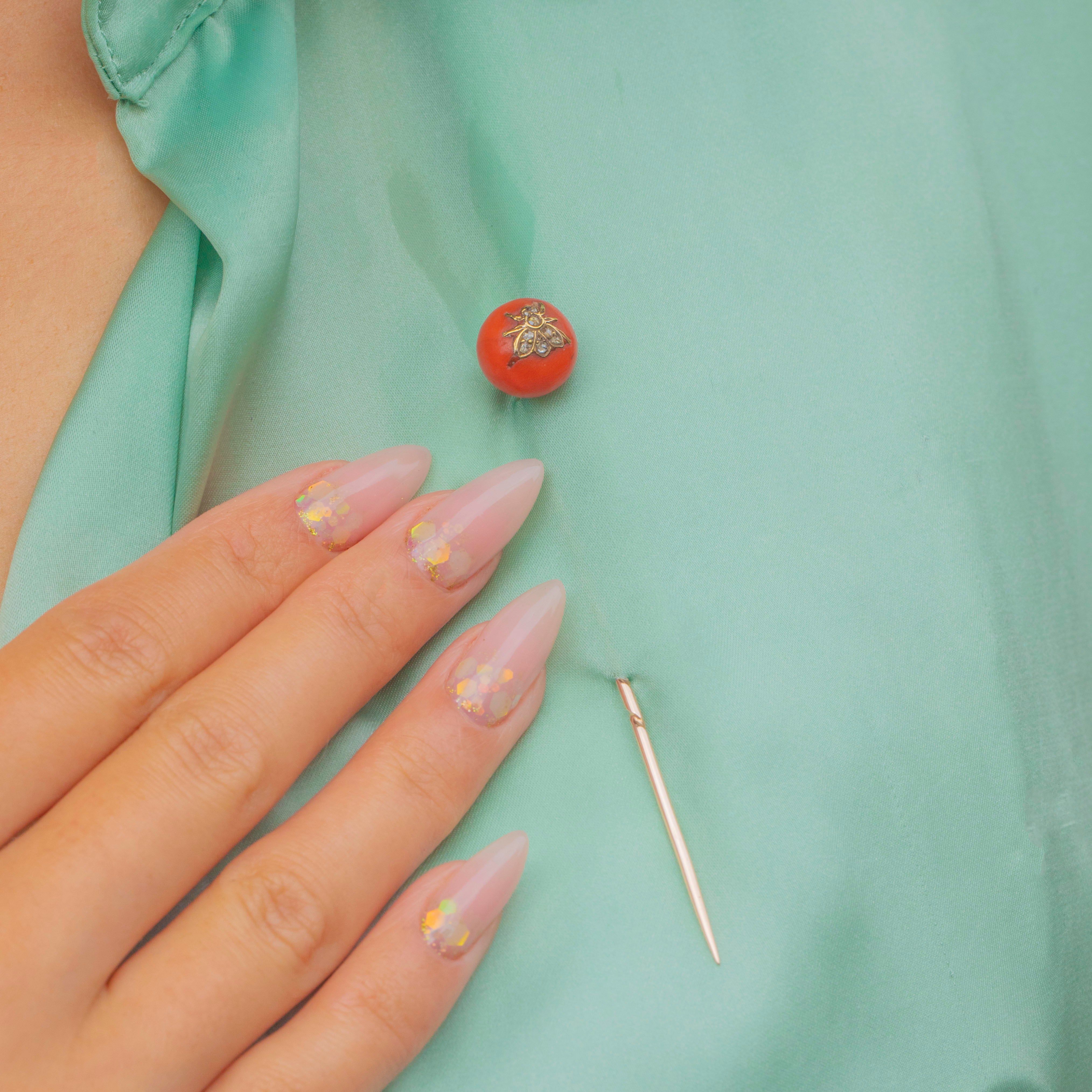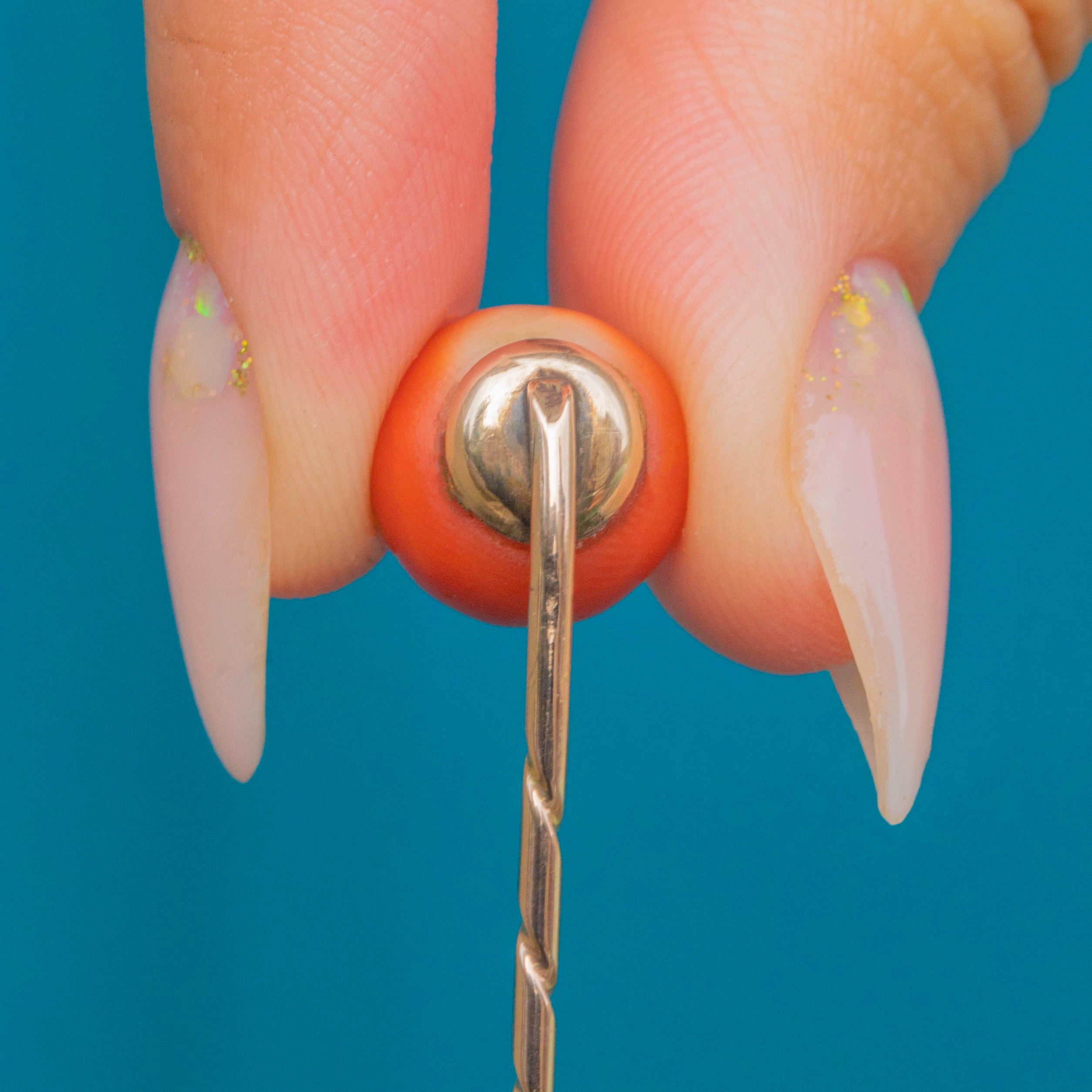 This elegant Victorian stick pin pairs a glowing Coral with a flash of Diamond, all set in warm 9ct Gold. The twisted pin leads to a smooth, Coral orb topped with an applied Gold fly motif set with tiny rose-cut Diamonds, providing a subtle sparkle against the rich orange tones.