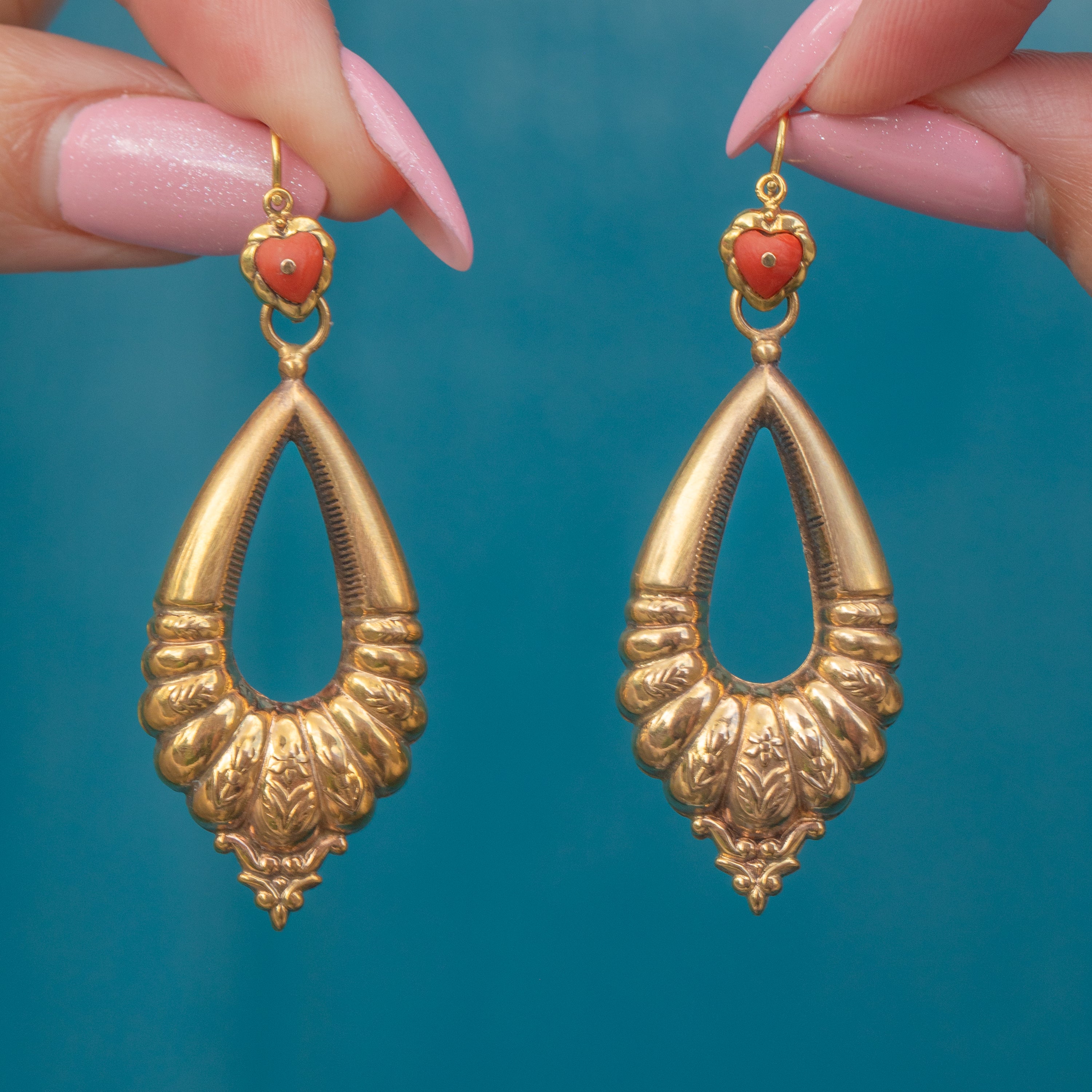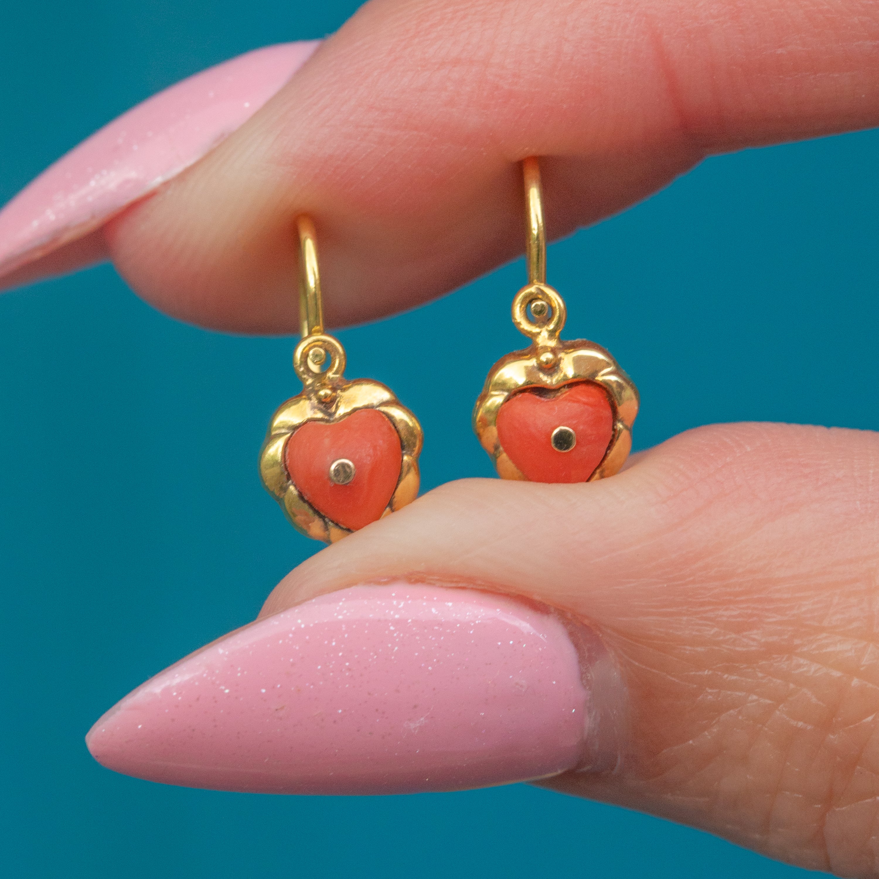 VERY GOOD: These Victorian 9ct Gold Coral heart day and night earrings are in very good condition. The Corals have been wonderfully preserved, free from surface wear and securely held within their settings. The Gold has an even saturation and lovely reflective qualities. There is some general surface wear to the Gold and some of the engraved details have worn down over the years, but the earrings retain every ounce of their charm. With fully functioning lever backs, you can enjoy wearing these antique day and night earrings with absolute confidence!