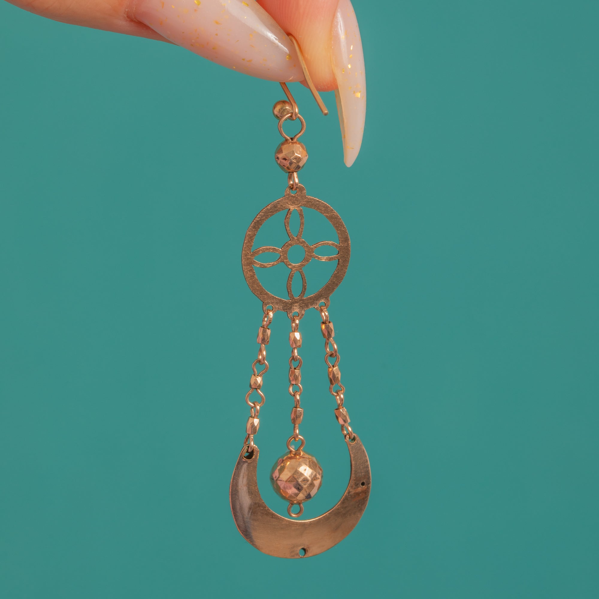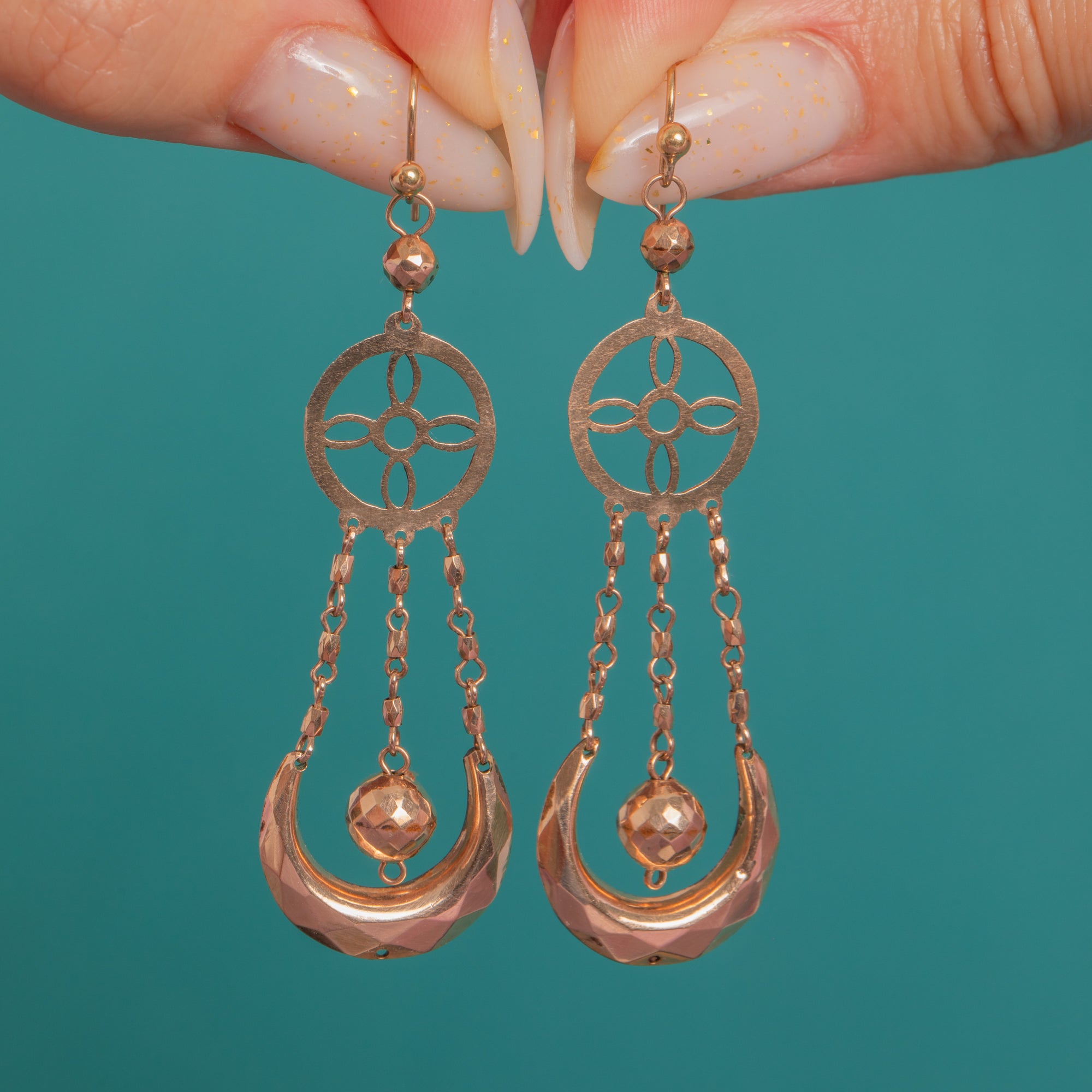 Victorian elegance with a celestial twist: these articulated 9ct Gold drop earrings dance with light and movement. An openwork rosette suspends three fine chains to a faceted crescent, cradling a central faceted orb for a hypnotic, kinetic sparkle. The Gold has a warm rosy-yellow hue that flatters and glows.