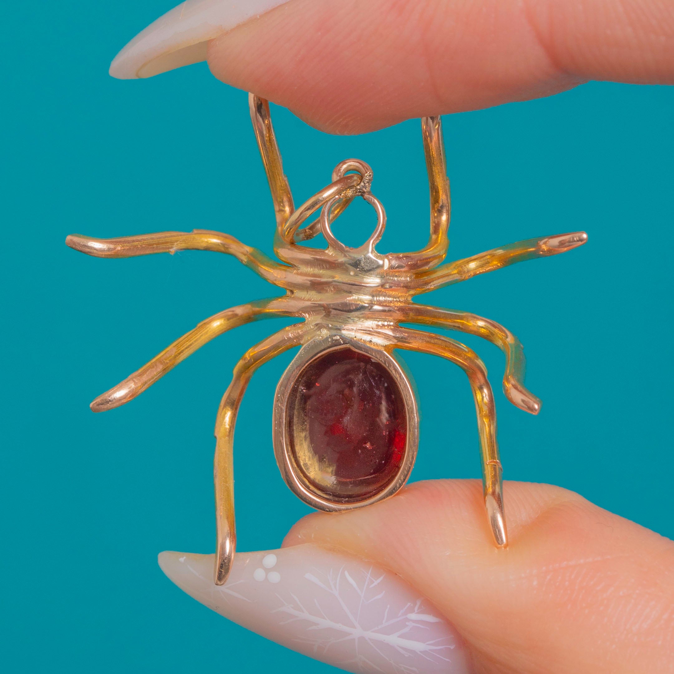 A charismatic Victorian spider pendant, crafted in warm 9ct Gold with a luscious deep-red Garnet cabochon forming the abdomen and a bright step-cut Emerald at the head. The gems sit in neat, textured bezels, while eight slender, curving legs lend a wonderfully naturalistic silhouette with a dash of gothic whimsy.