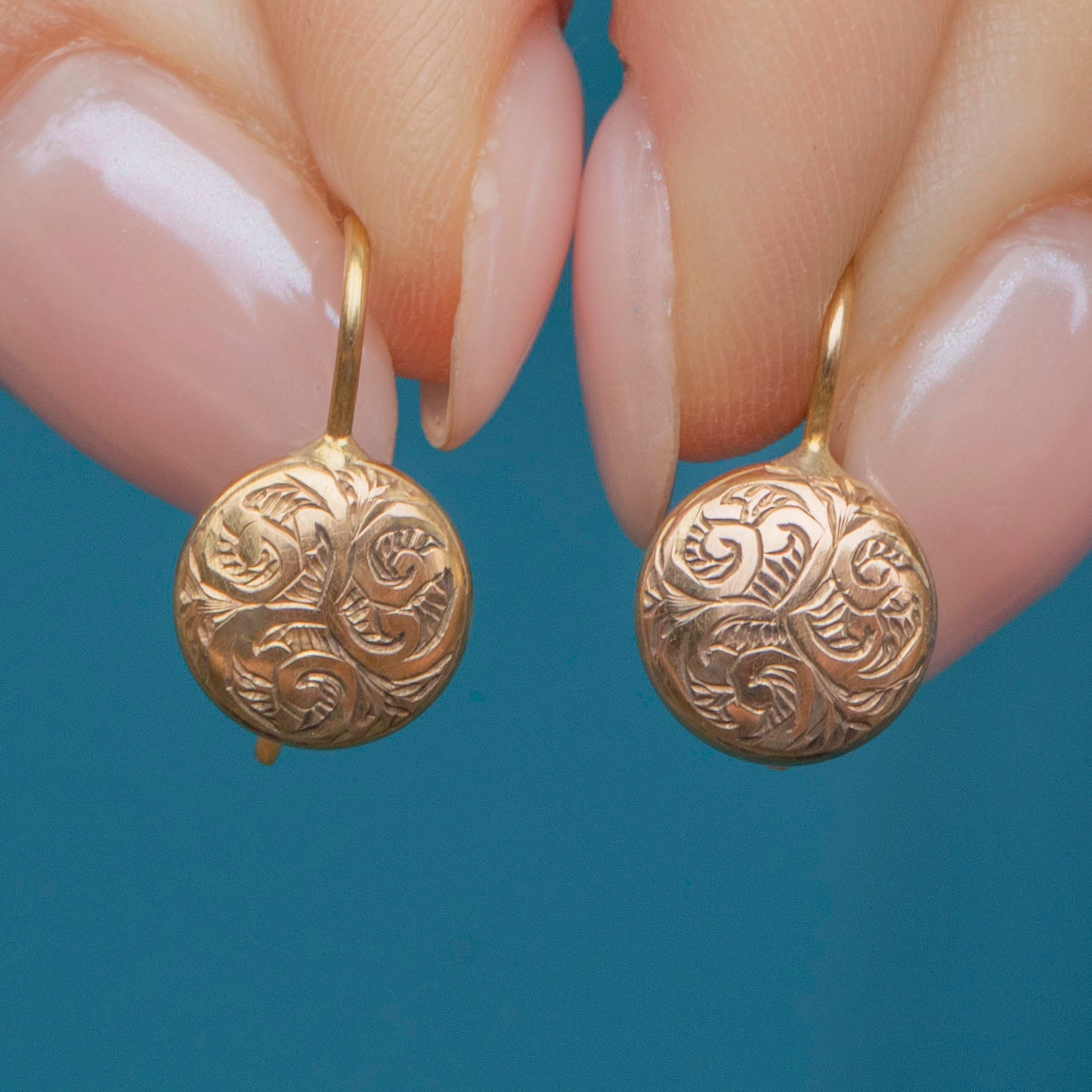 Akin to drops of sunshine, these Victorian 9ct Gold engraved button earrings will sit snug below your lobes, radiating warmth for all to enjoy.
