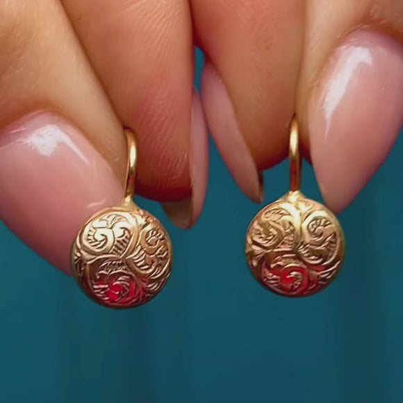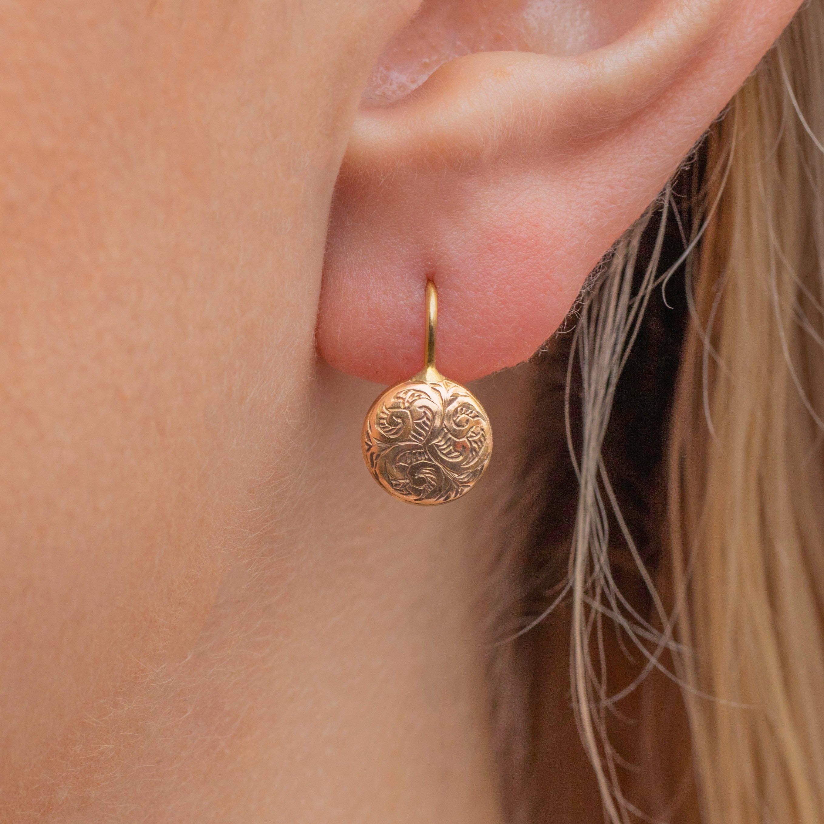 Their sweet, domed button drops are inlaid with acanthas leaves design engravings adorning their front, making these Victorian Gold earrings a symbollic pair. Dainty in size, these antique engraved earrings make a fine addition to any earring stack you like to wear everyday!