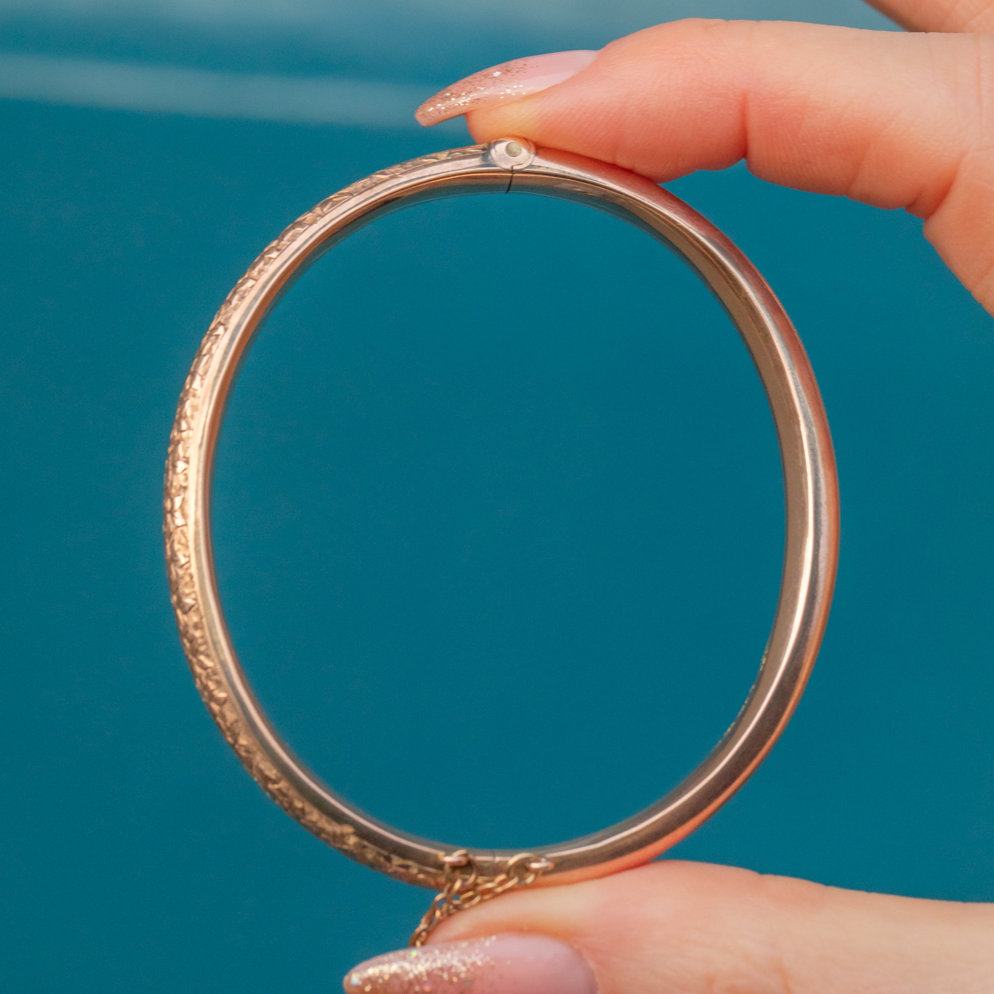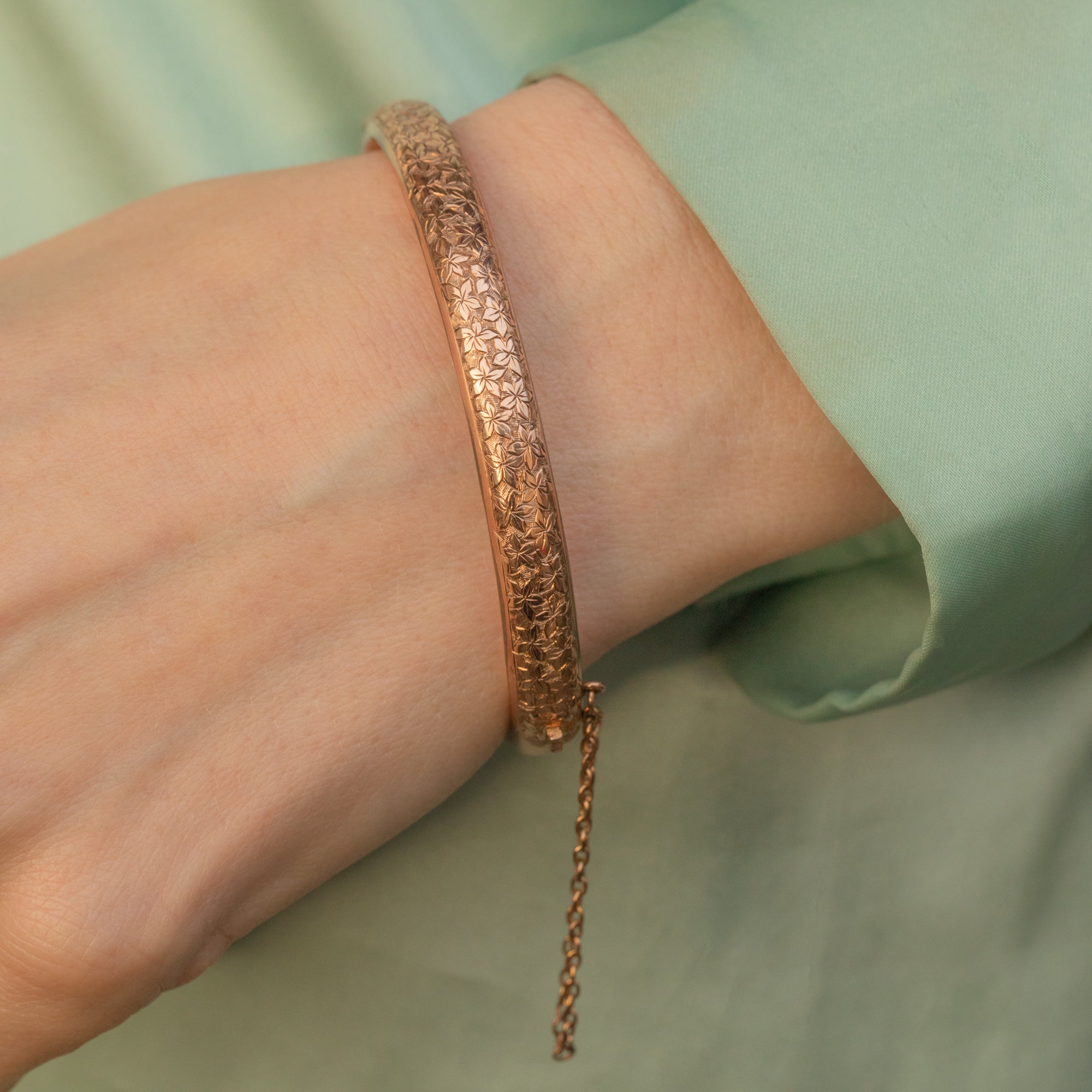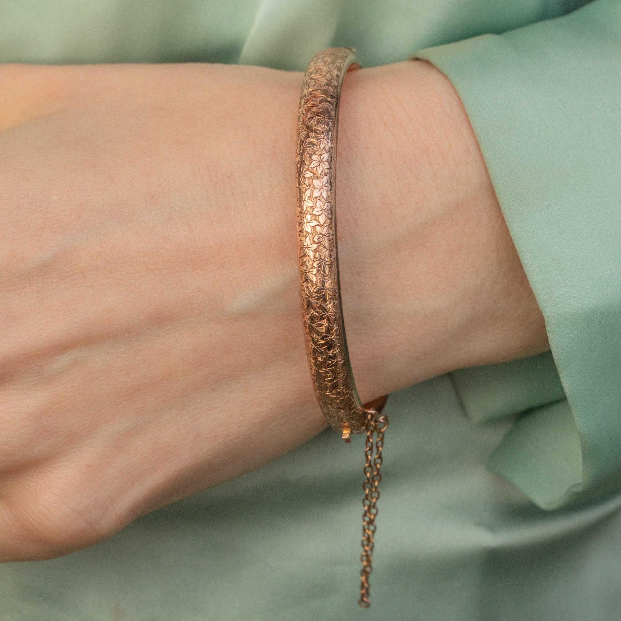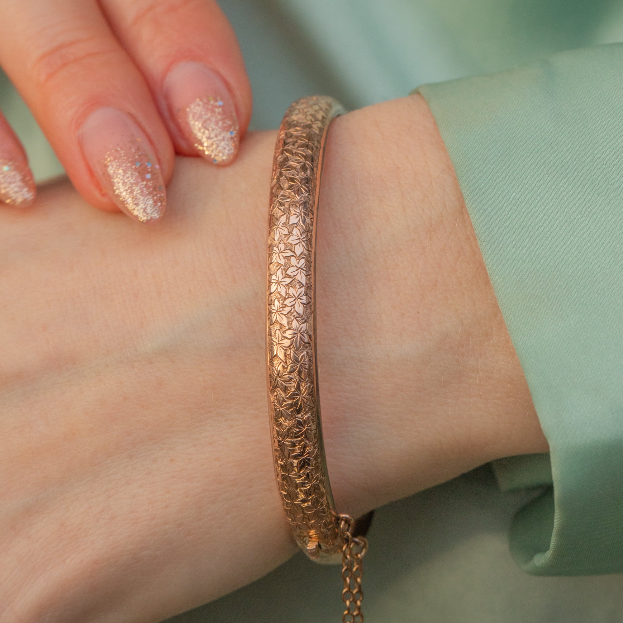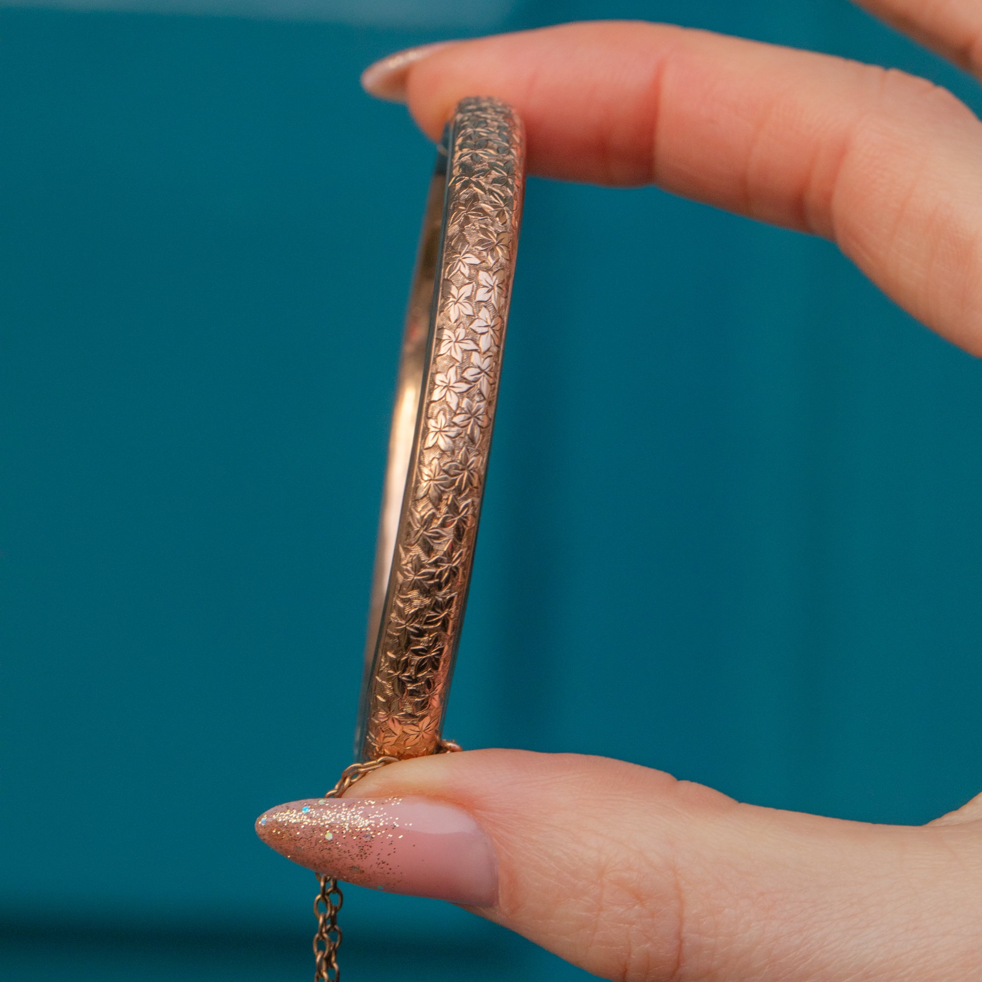 Crafted from rosy-hued 9ct Gold, this antique bangle features gorgeous floral engravings, intricately detailed to provide texture and depth to this classic piece.