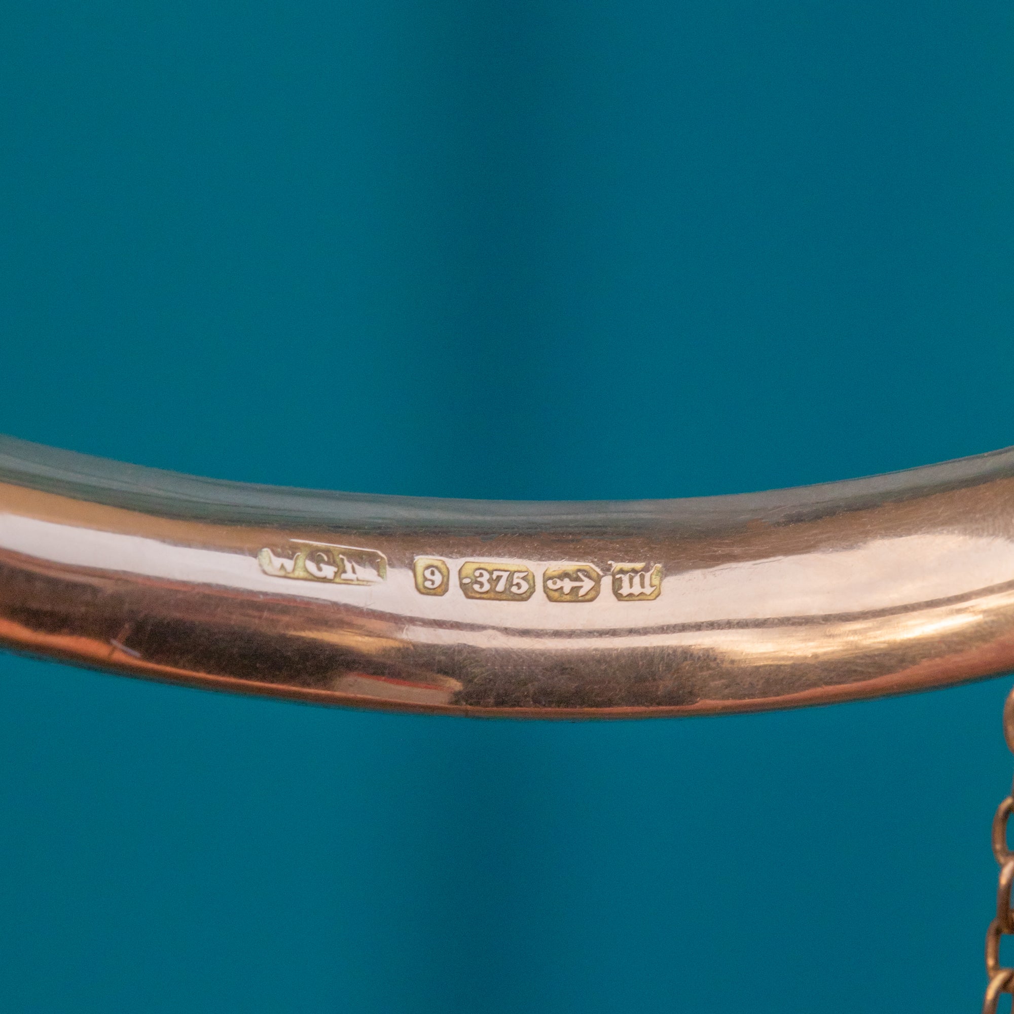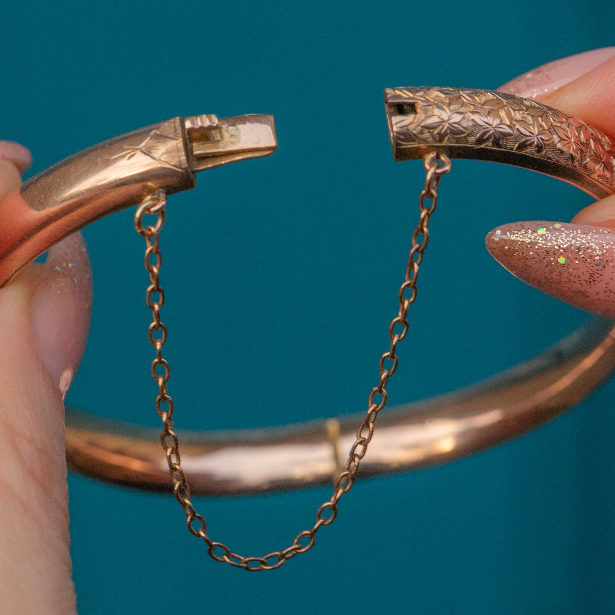 EXCELLENT. This Victorian 9ct Gold engraved floral bangle is in excellent condition. Her details are crisp and she shows minimal signs of wear, especially when considering her grand age. She closes with a nice 'click' and with an added safety chain, you can wear her with confidence.