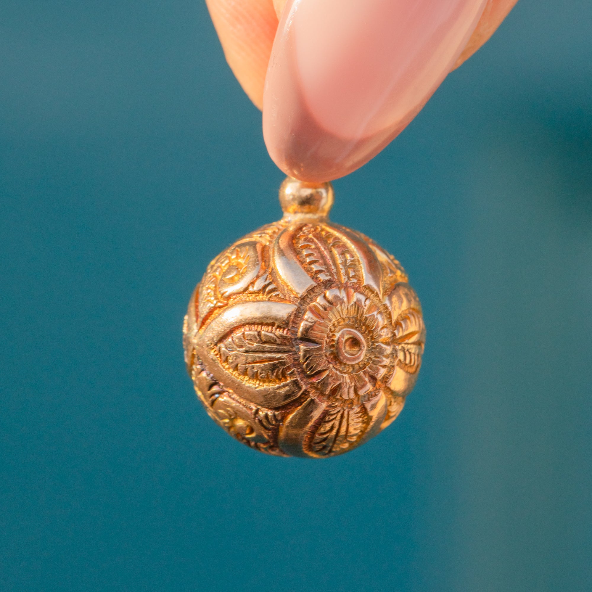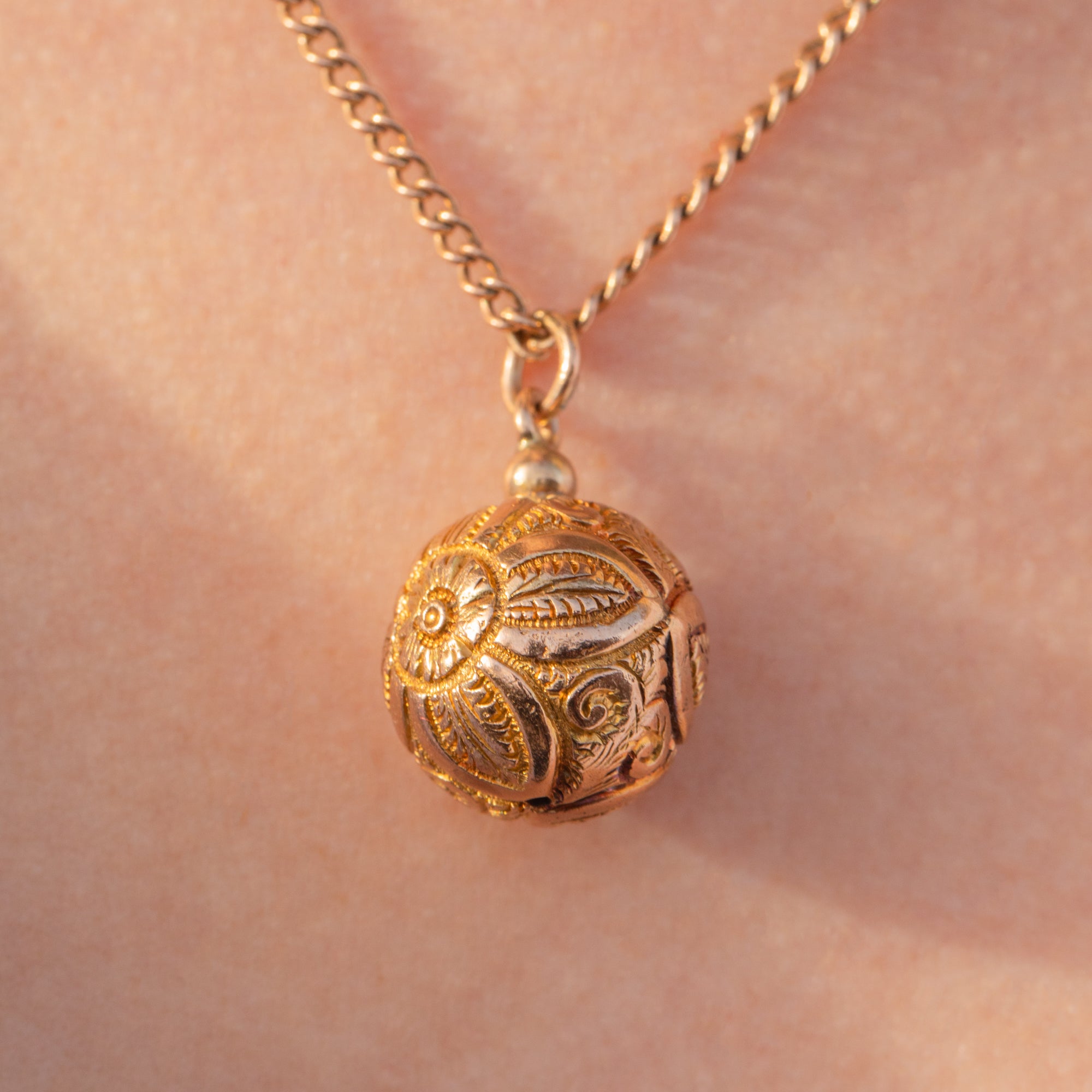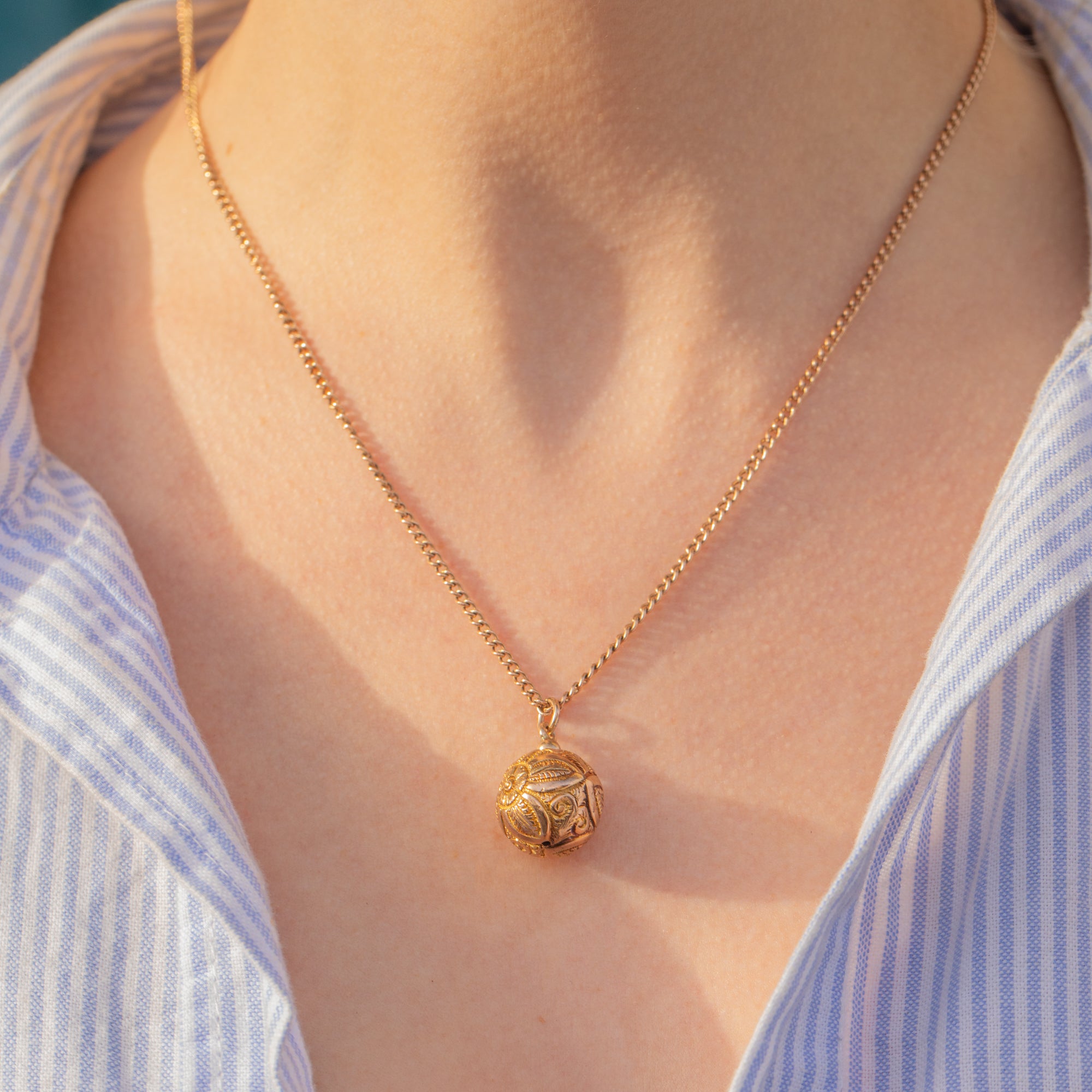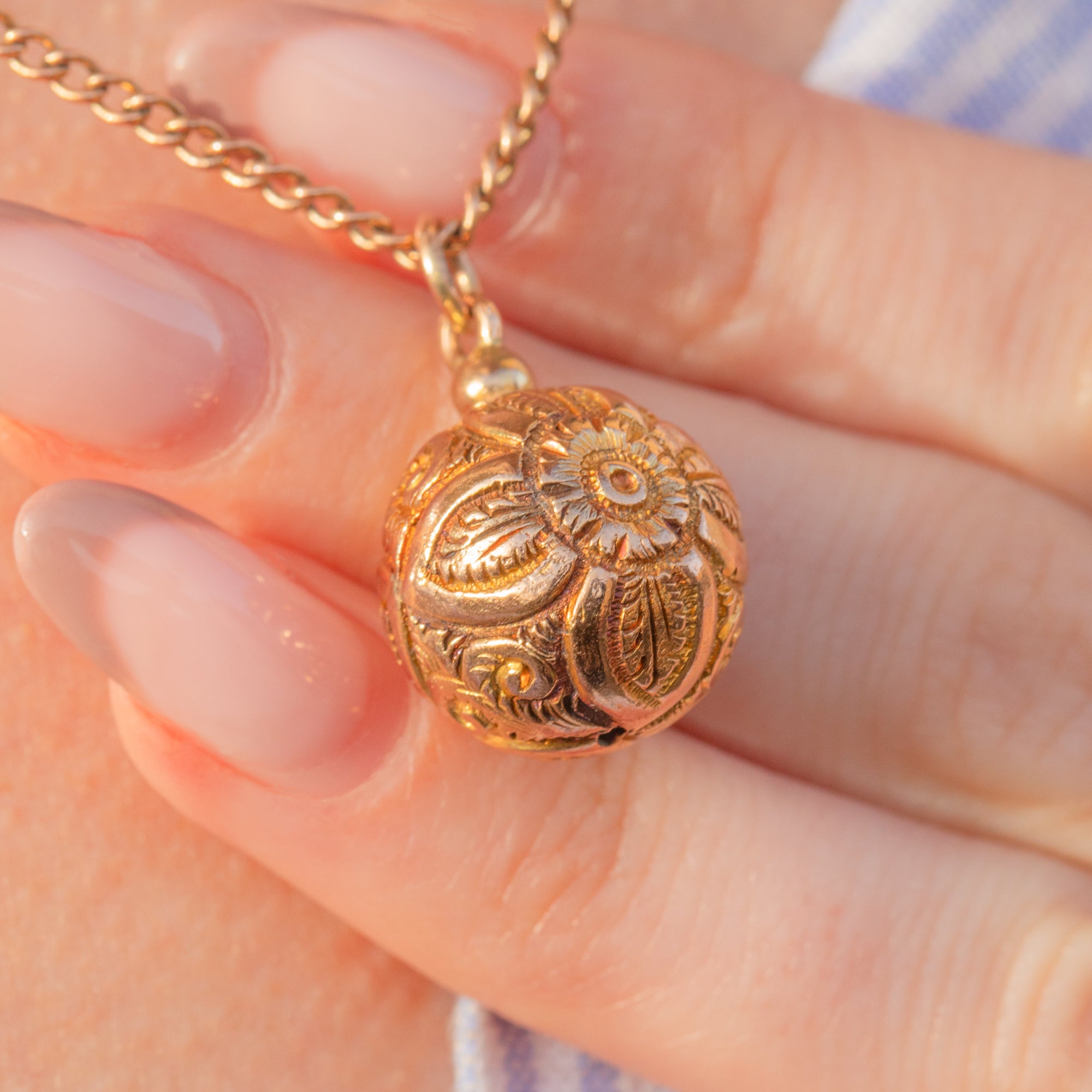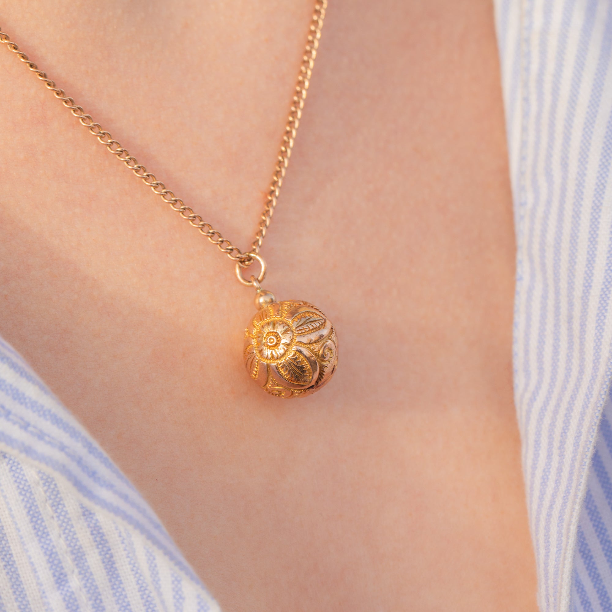 EXCELLENT. This Victorian 9ct Gold engraved floral orb pendant is in very good condition. This piece has very little sign of wear to note, with a beautifully formed exterior and jump ring so you can wear her with absolute confidence!