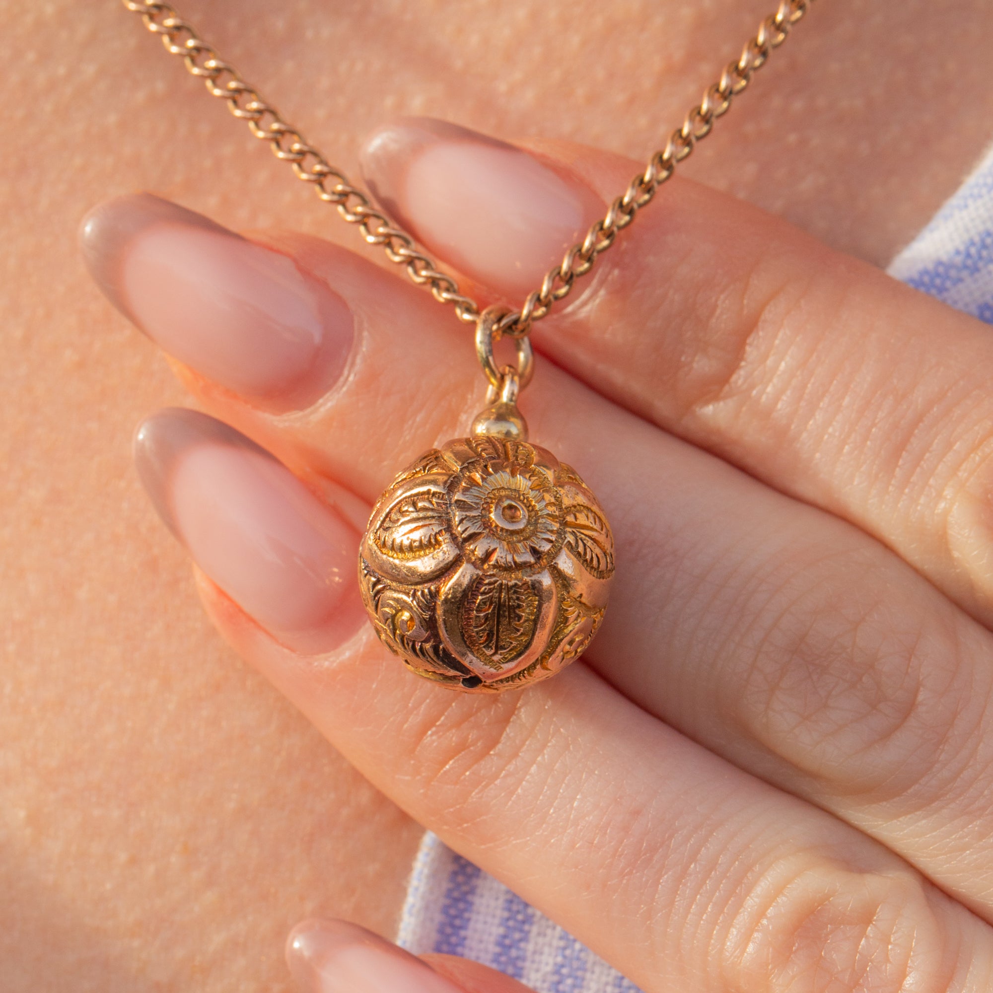 This adorable Victorian 9ct Gold engraved floral orb pendant is a timeless antique treasure with much to boast about! She is crafted entirely from 9ct Gold and covered from top to bottom with decadent floral detailing.