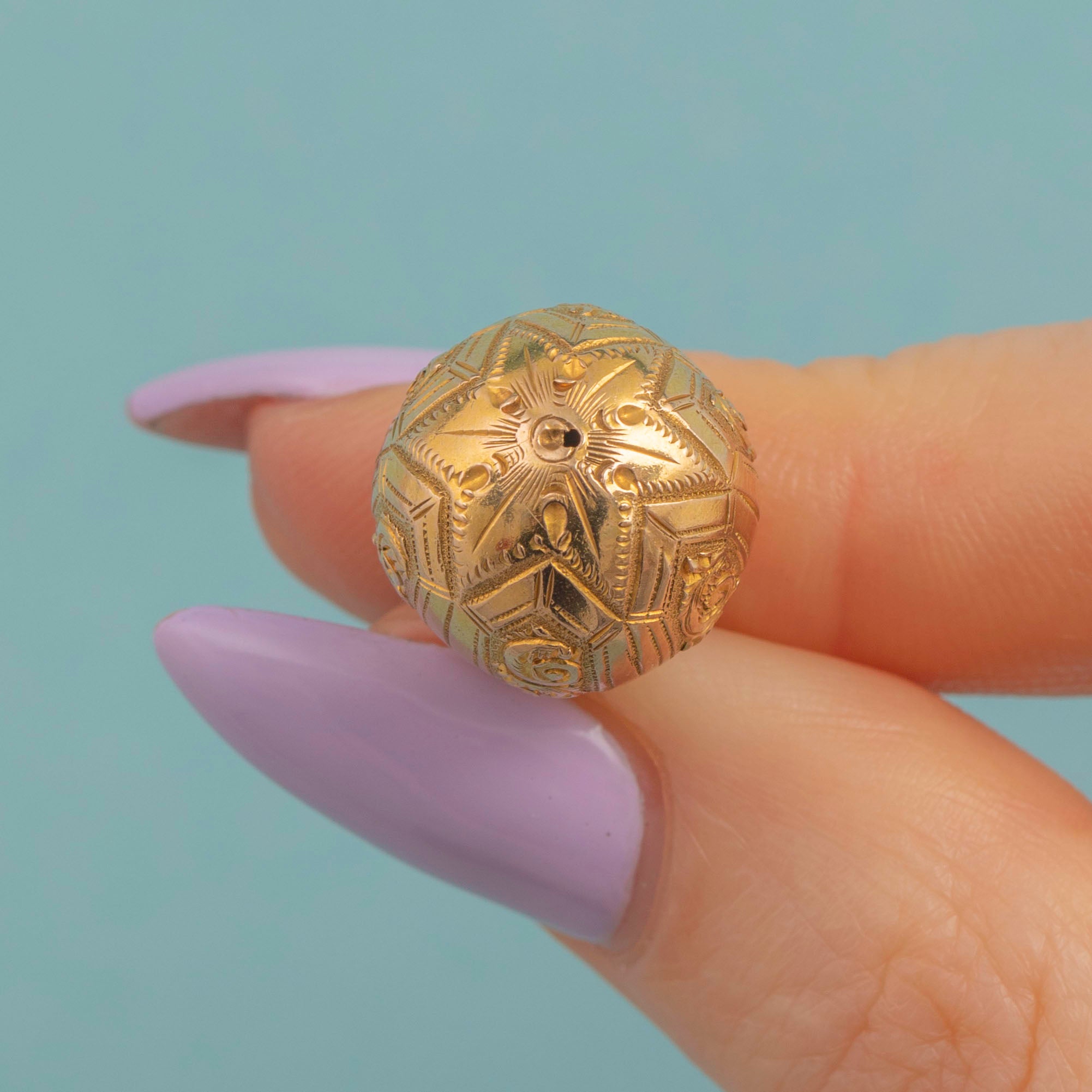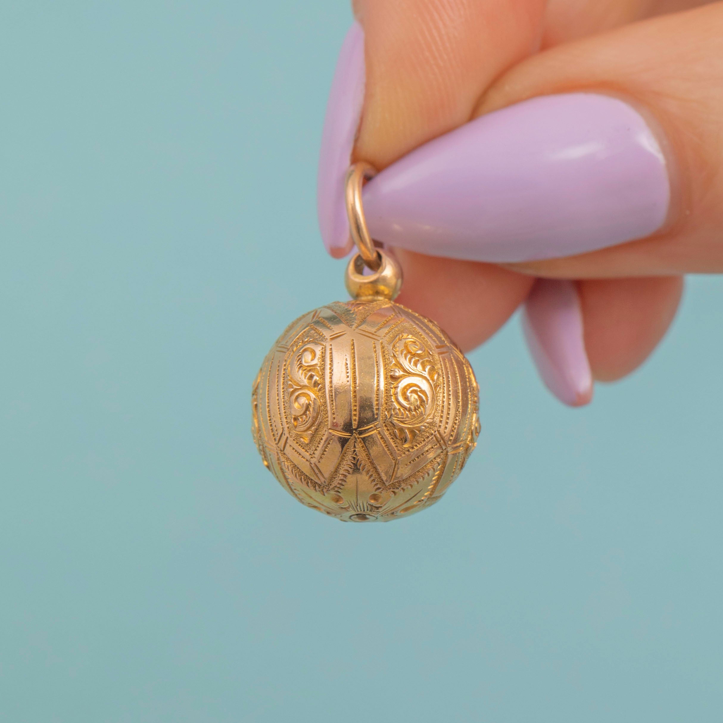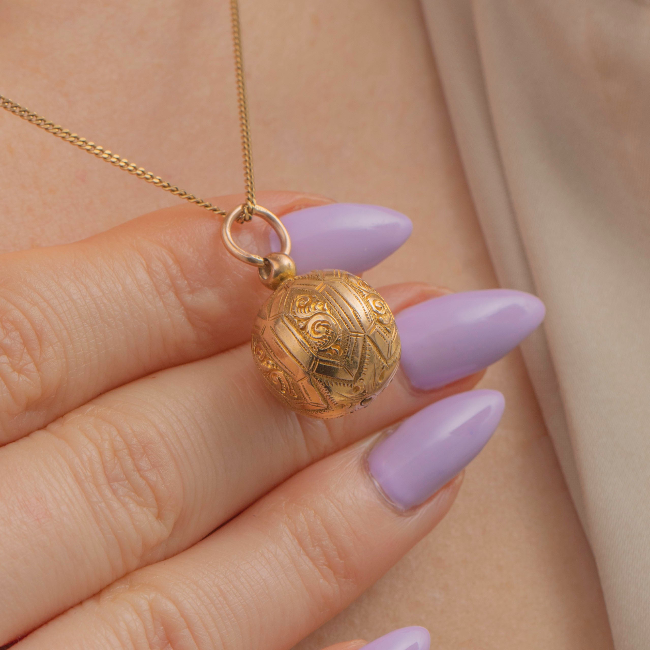 We adore this Victorian 9ct Gold engraved orb pendant! This timeless antique treasure has much to boast about, crafted entirely from 9ct Gold and covered from top to bottom with swirly engravings.