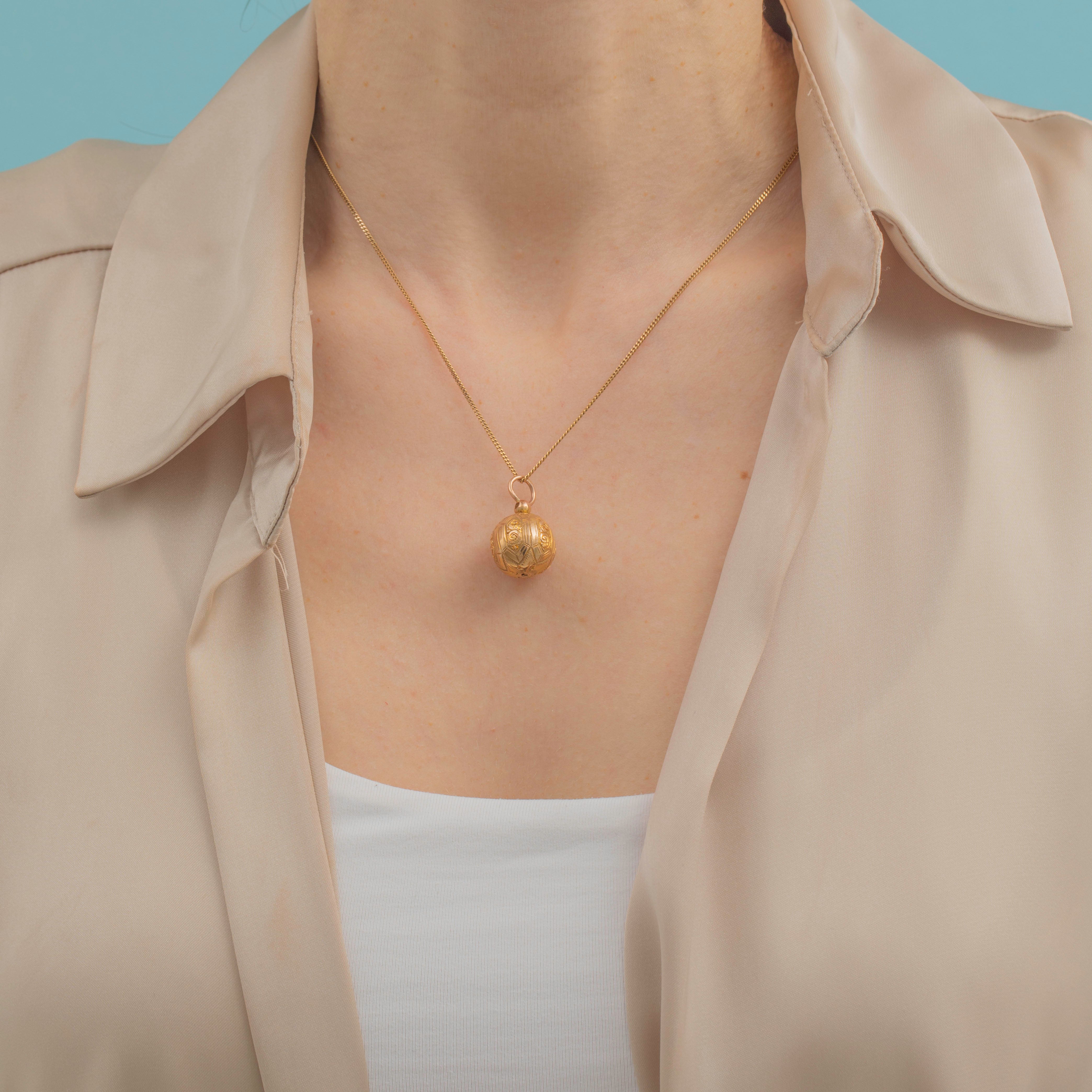 EXCELLENT. This Victorian 9ct Gold engraved orb pendant is in excellent condition. The orb has no dings or damage to note, with gorgeous engravings to absorb from every angle. The Gold has a splendid buttery hue and will remain so for many decades more!