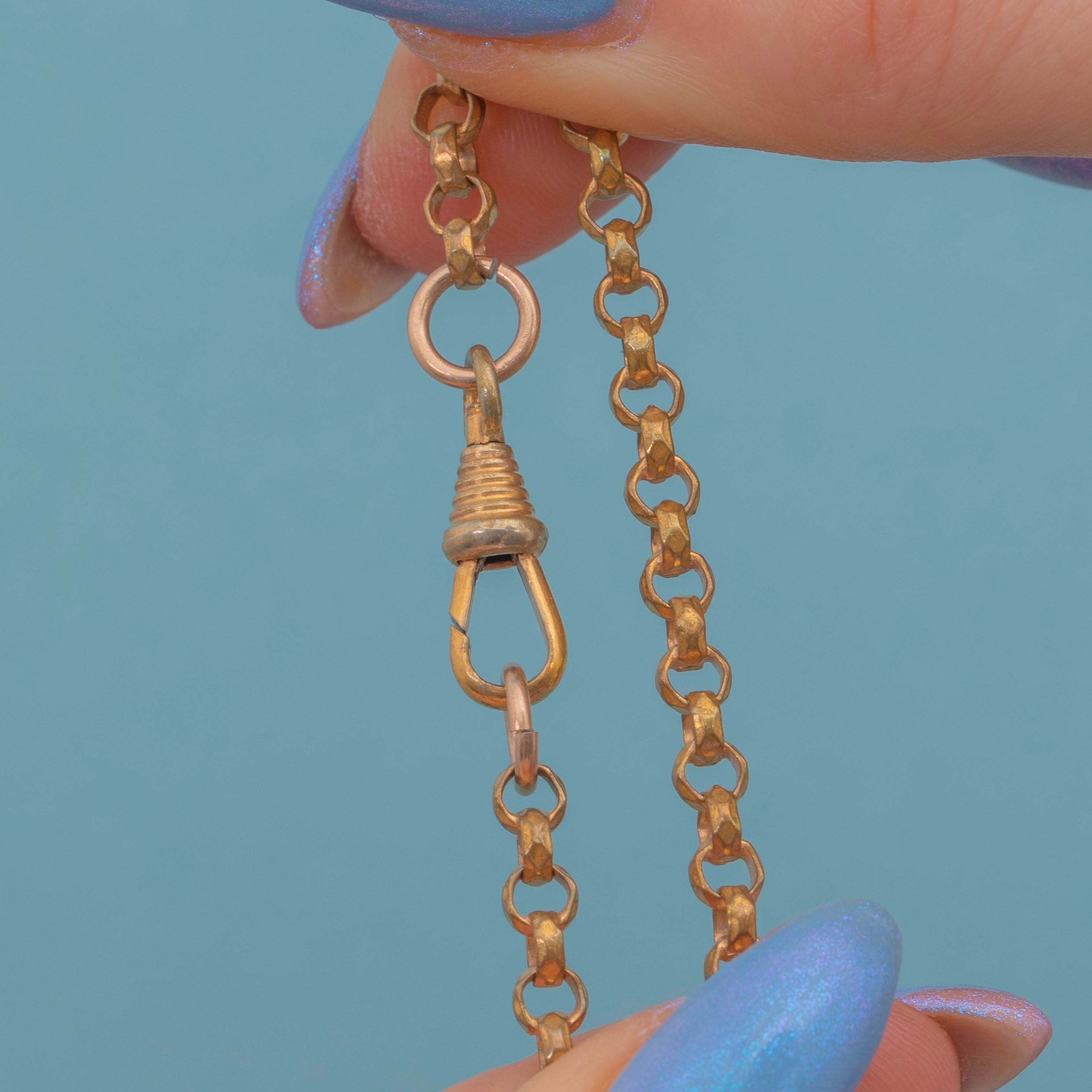 This 51" Victorian 9ct Gold cased faceted longuard chain is the perfect piece to add a Golden glow to any attire! With faceted belcher links, this Victorian chain possesses breathtaking reflective qualities, radiating warmth as she adorns your neck.