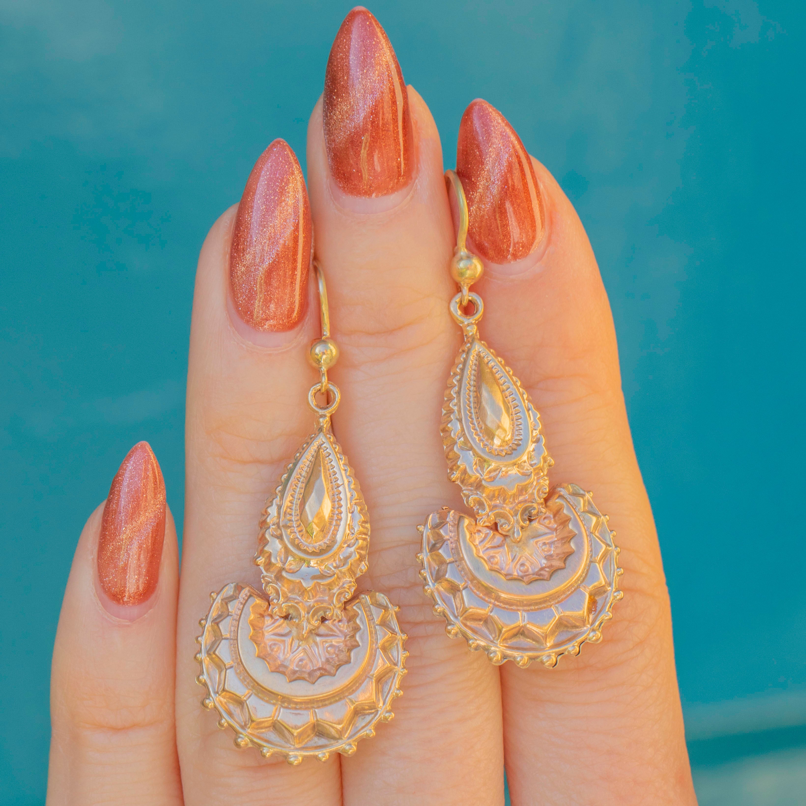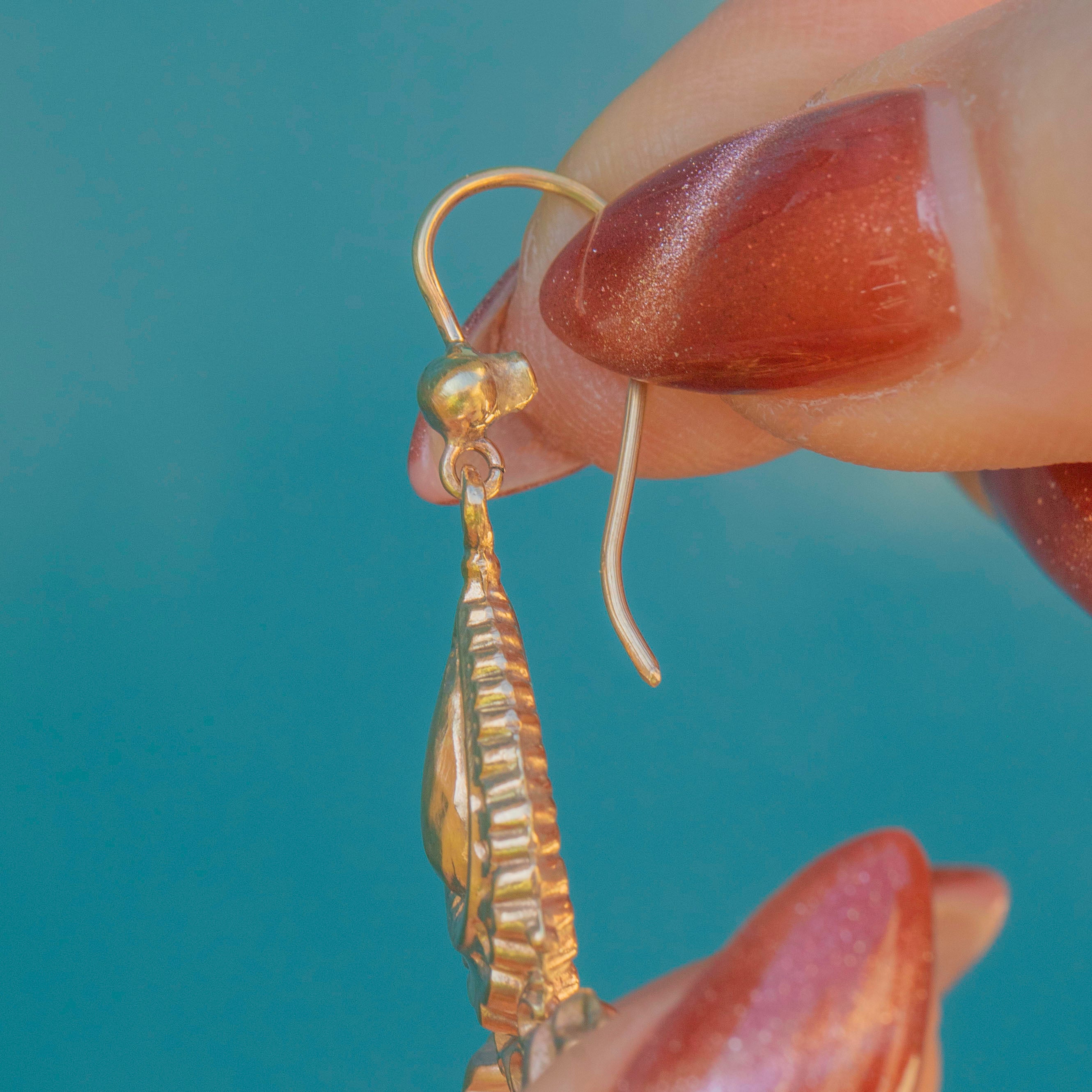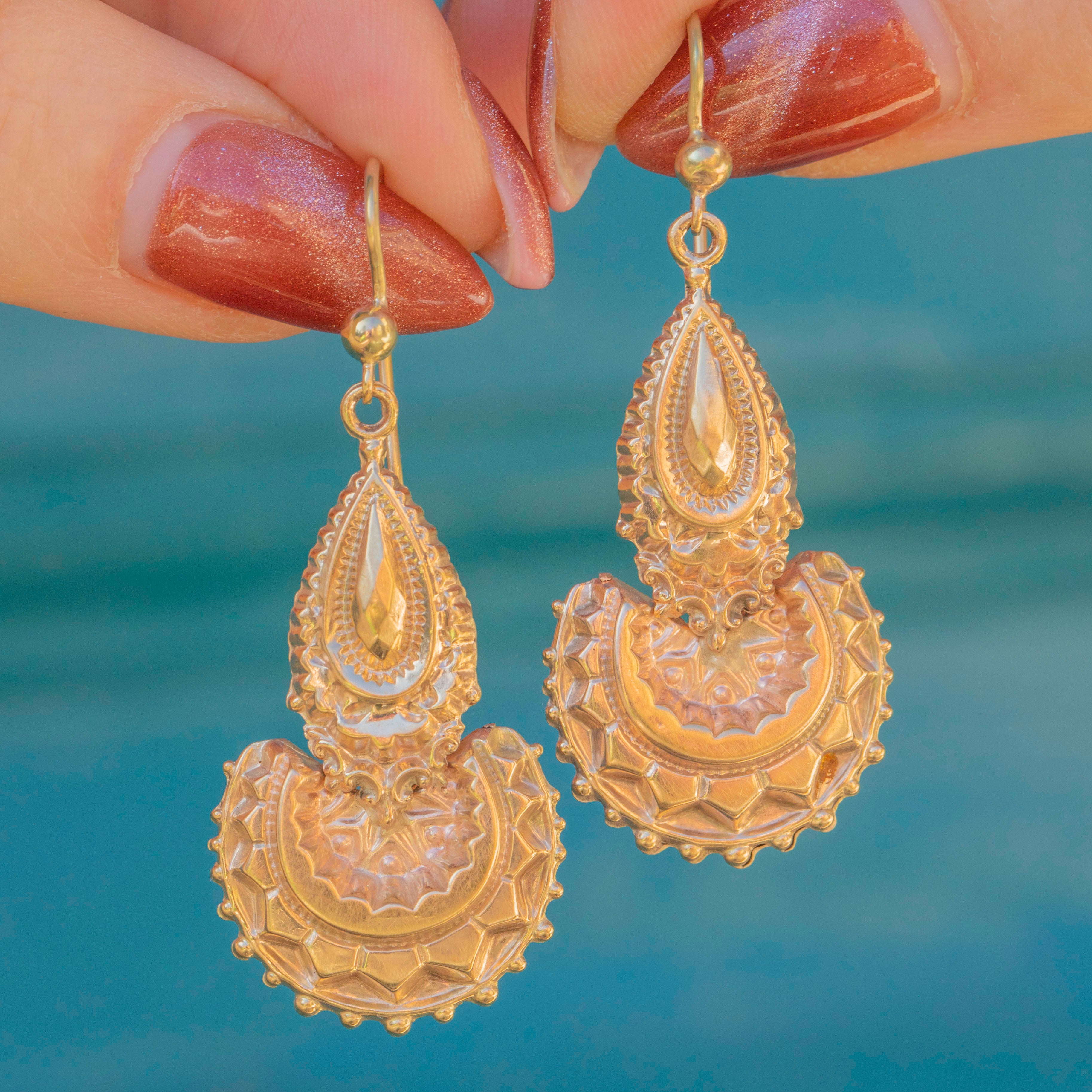 A luxurious pair of Victorian 9ct Gold fancy drop earrings! Crafted from a honey-hued 9ct Gold throughout, every inch of this delightful duo is dripping with intricate details and antique charm.