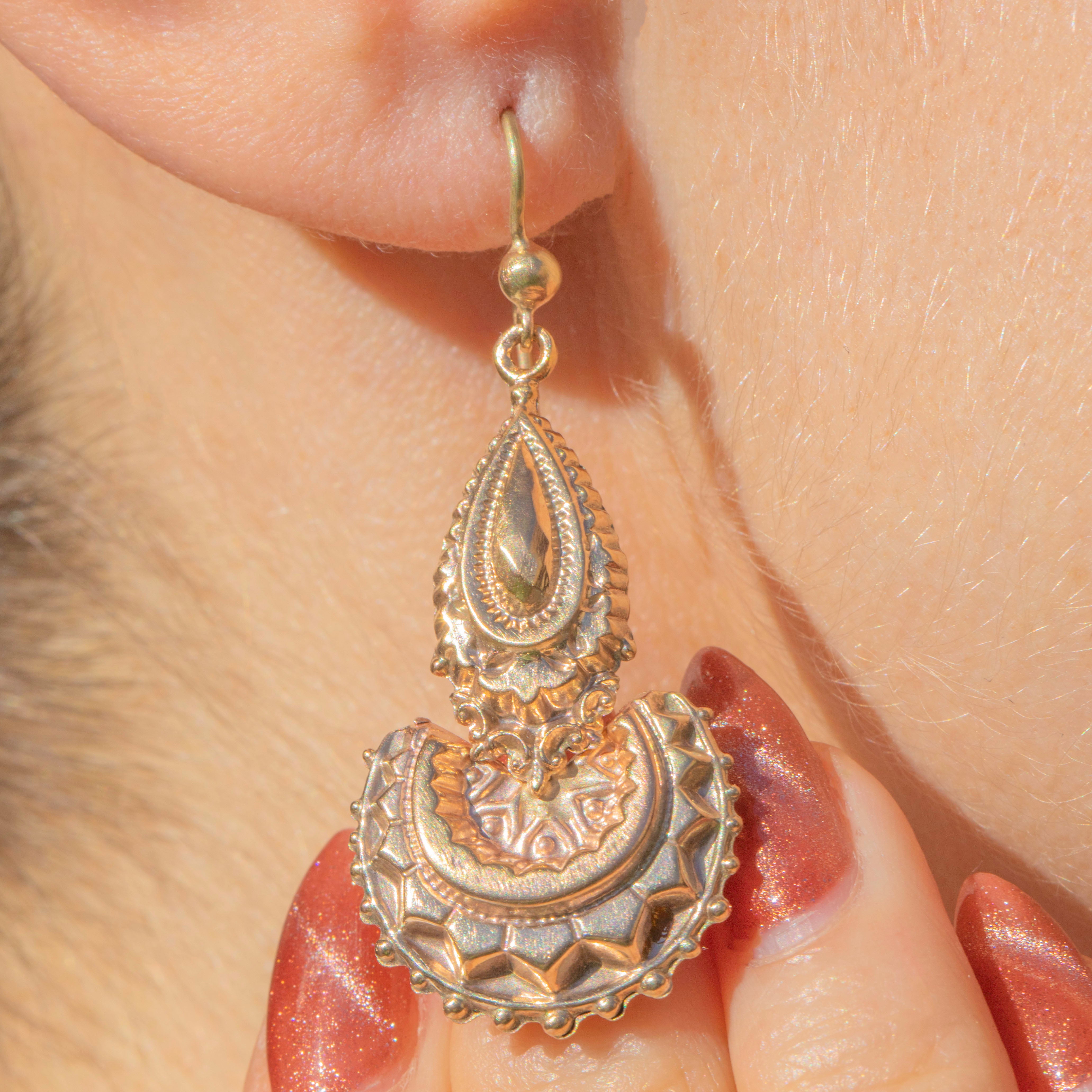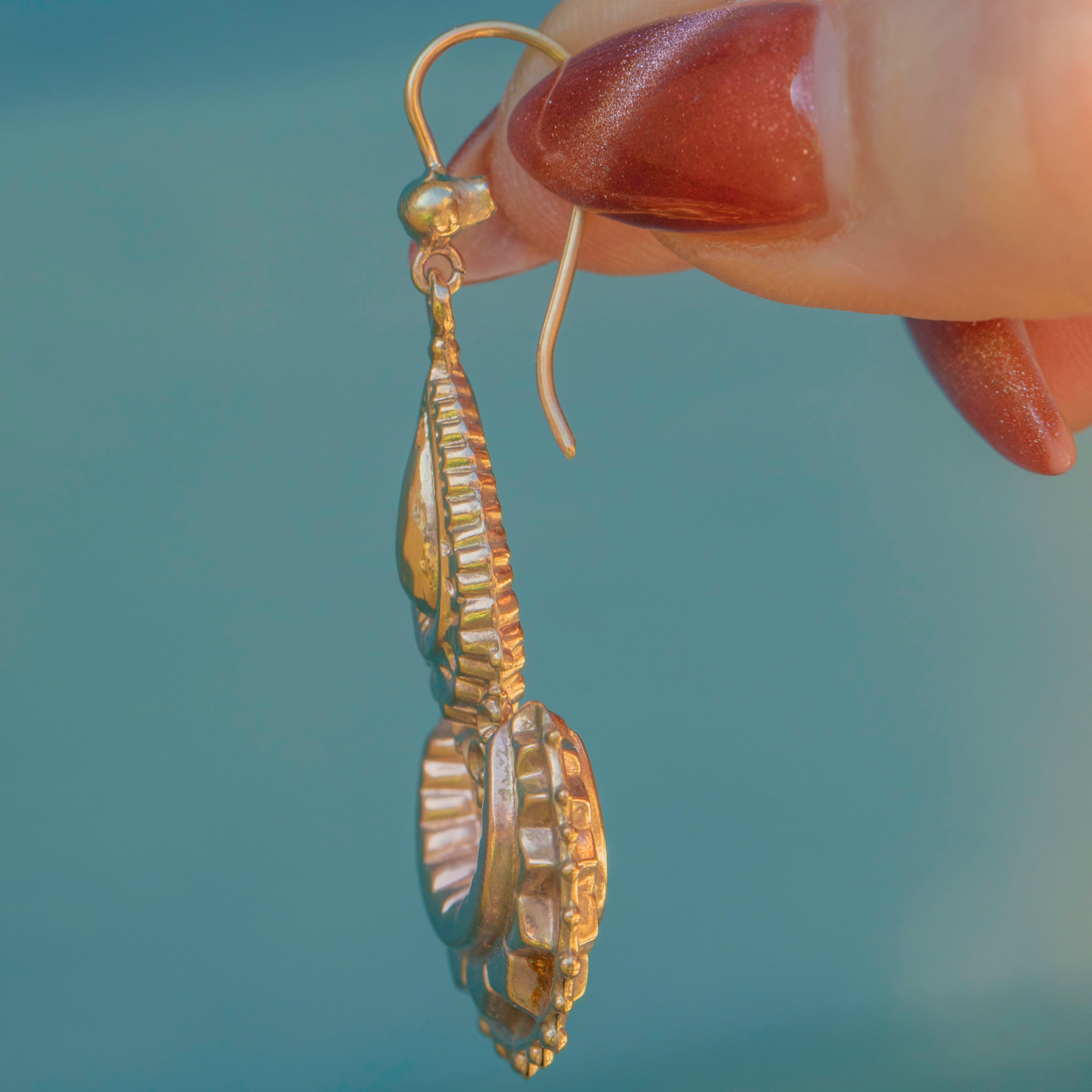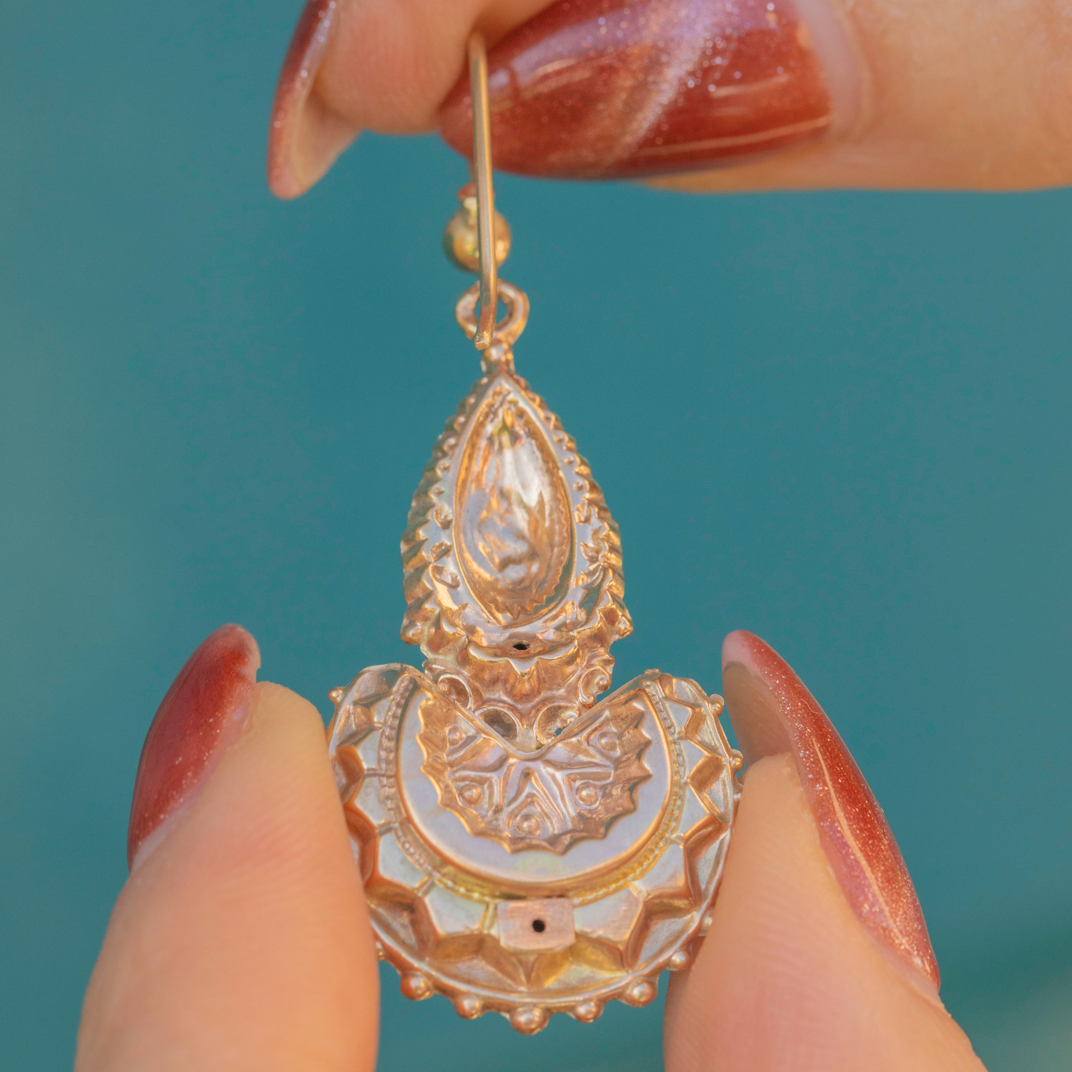 EXCELLENT: These Victorian 9ct Gold fancy drop earrings are in very good antique condition. The Gold has retained a lovely lustre and is detailed intricately. With secure hooks, you can wear these earrings with confidence.