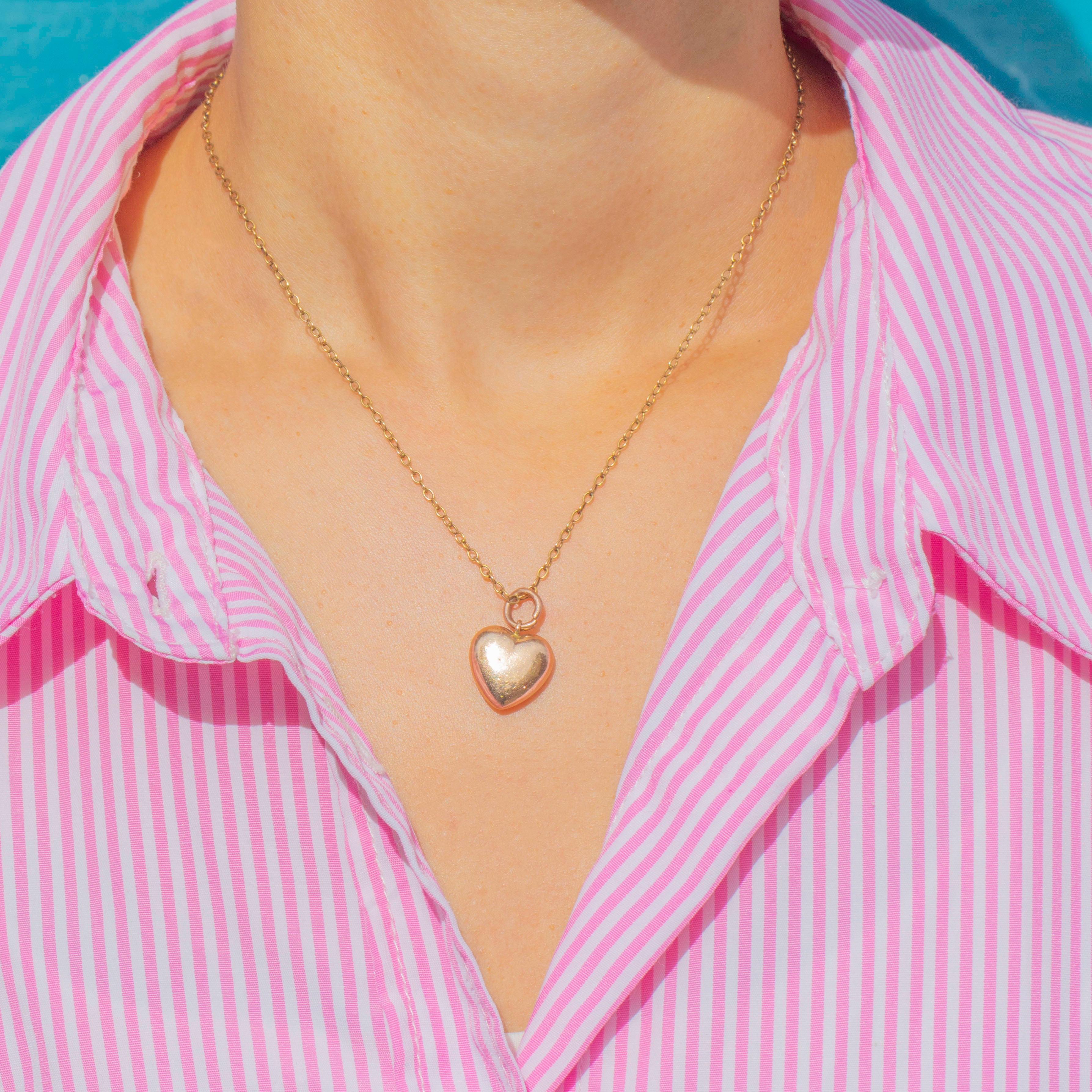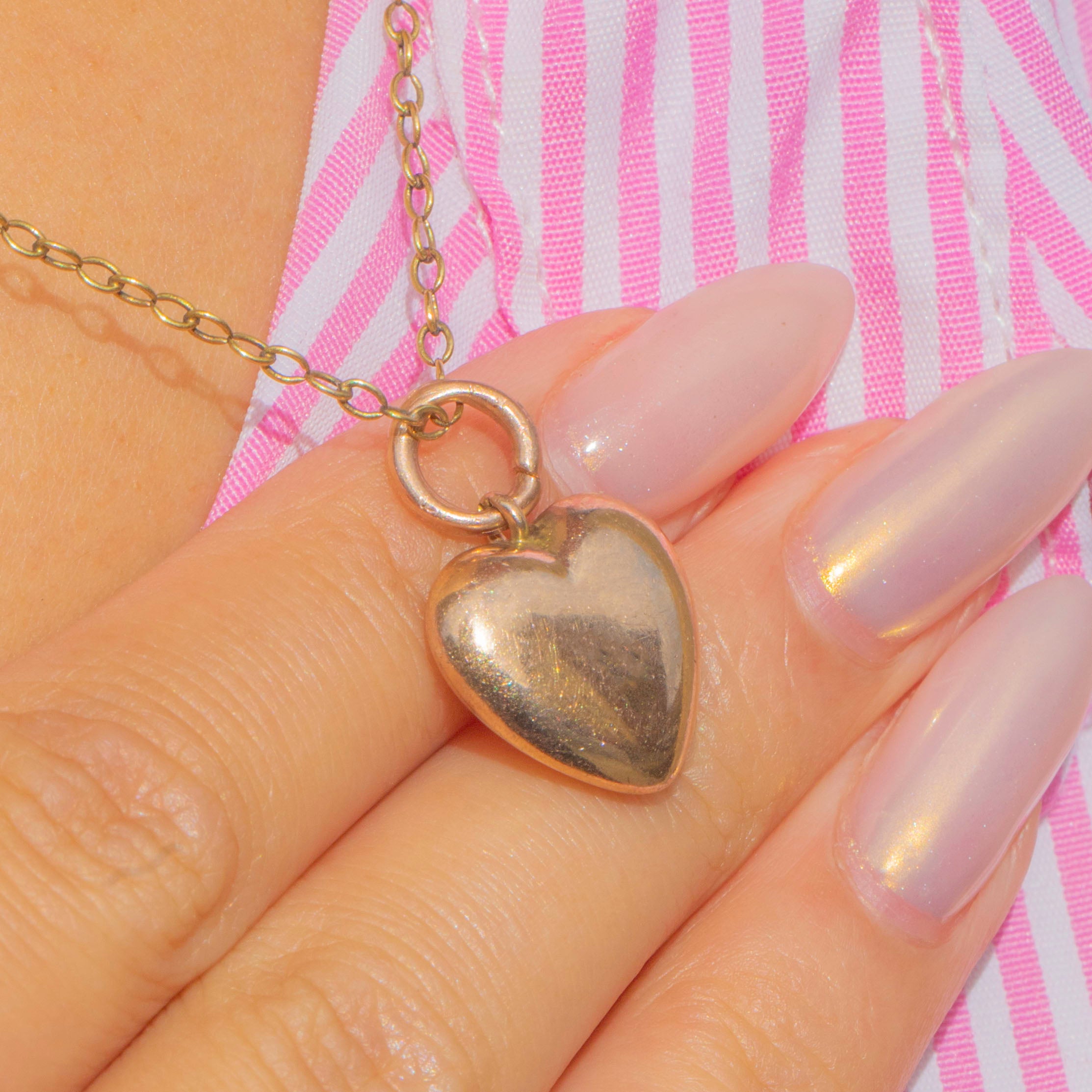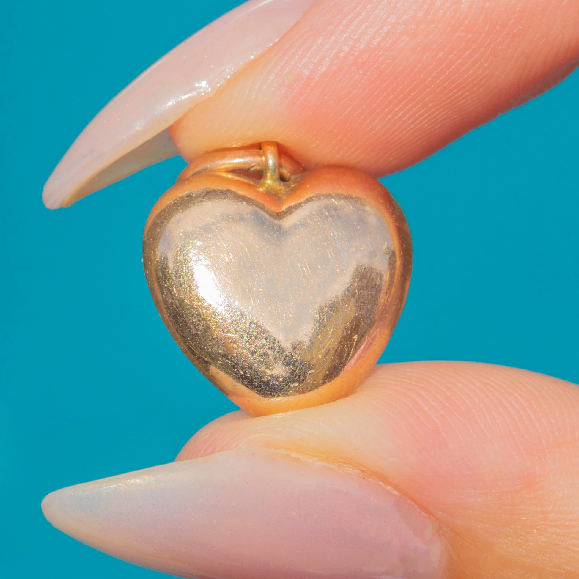 A charming Antique late-Victorian 9ct Gold Puffy Heart charm, c.1900, with a smooth, domed appearance and a plump, tactile form. Its chunky antique jump-ring adds character, while the warm golden hue of the Gold gives the piece a rich, inviting glow.