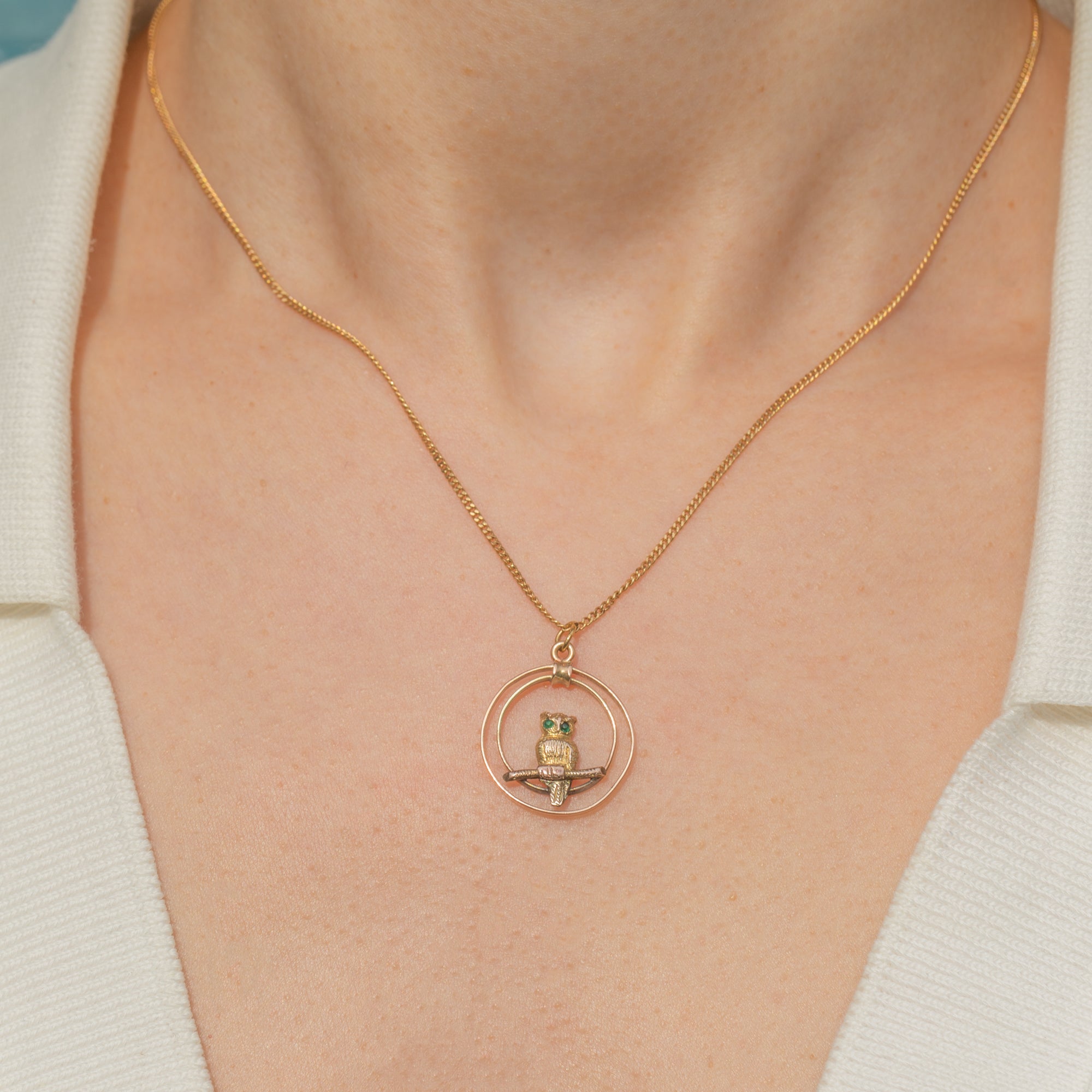 Perched in the centre is an adorable petite owl, with vibrant green Paste eyes and textured feathery engravings on her body, encircled by a buttery 9ct border creating a striking piece.