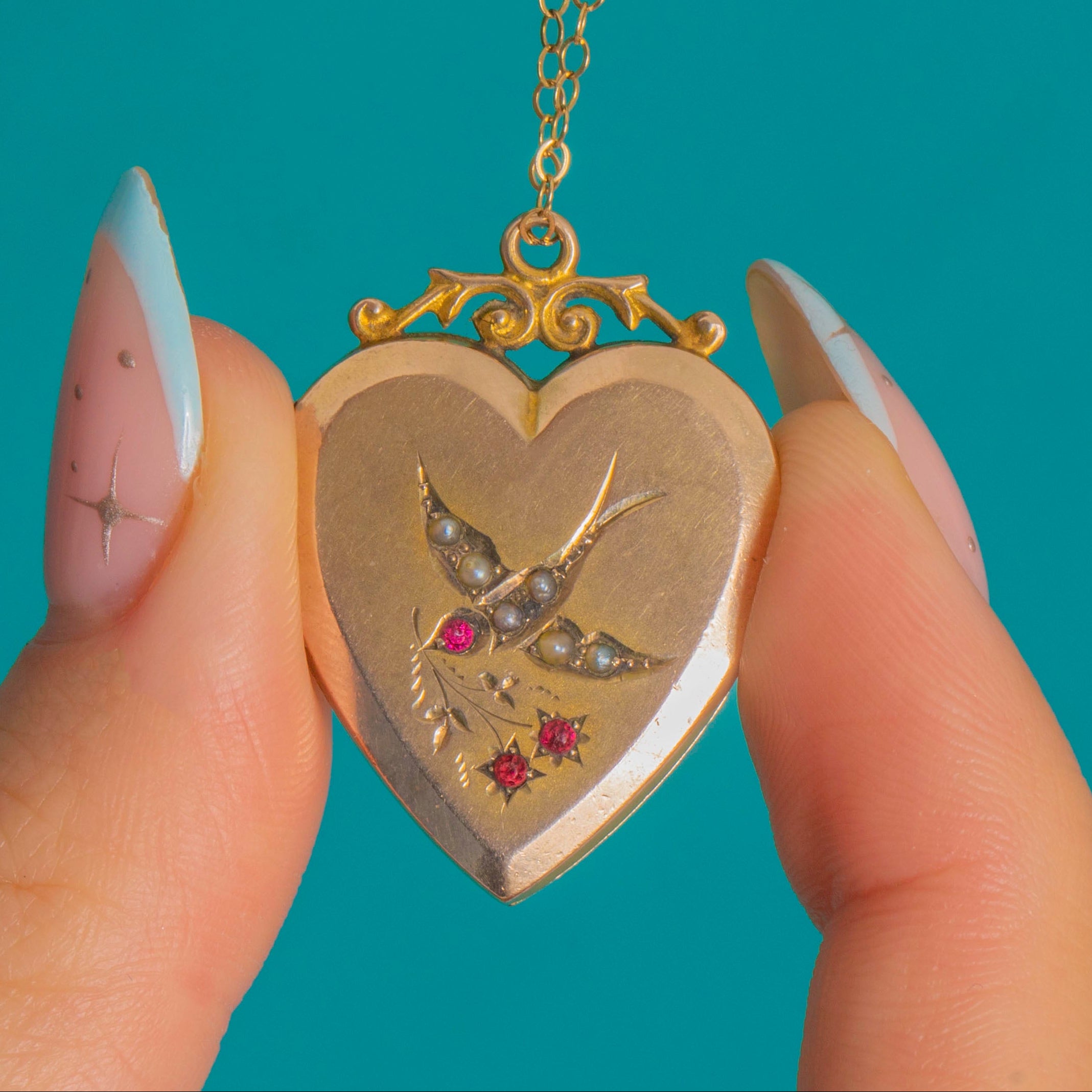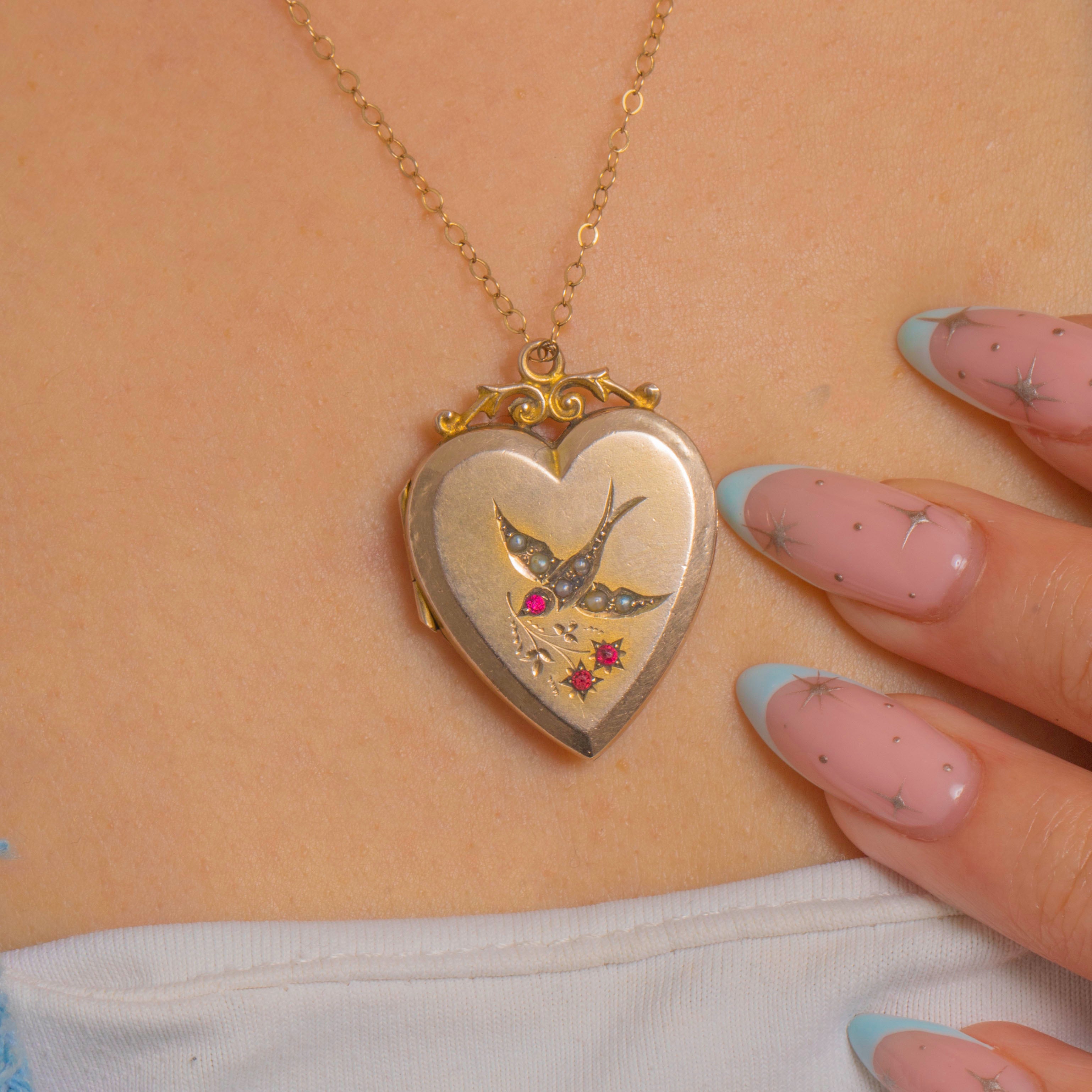 A romantic Victorian heart locket in 9ct Gold, embellished with a graceful swallow picked out in tiny Pearls and accented by twinkling star-set pink-red Paste. The softly satin front is enlivened with engraved foliage and finished with a polished border, crowned by a pretty foliate-scroll surmount and round bail.