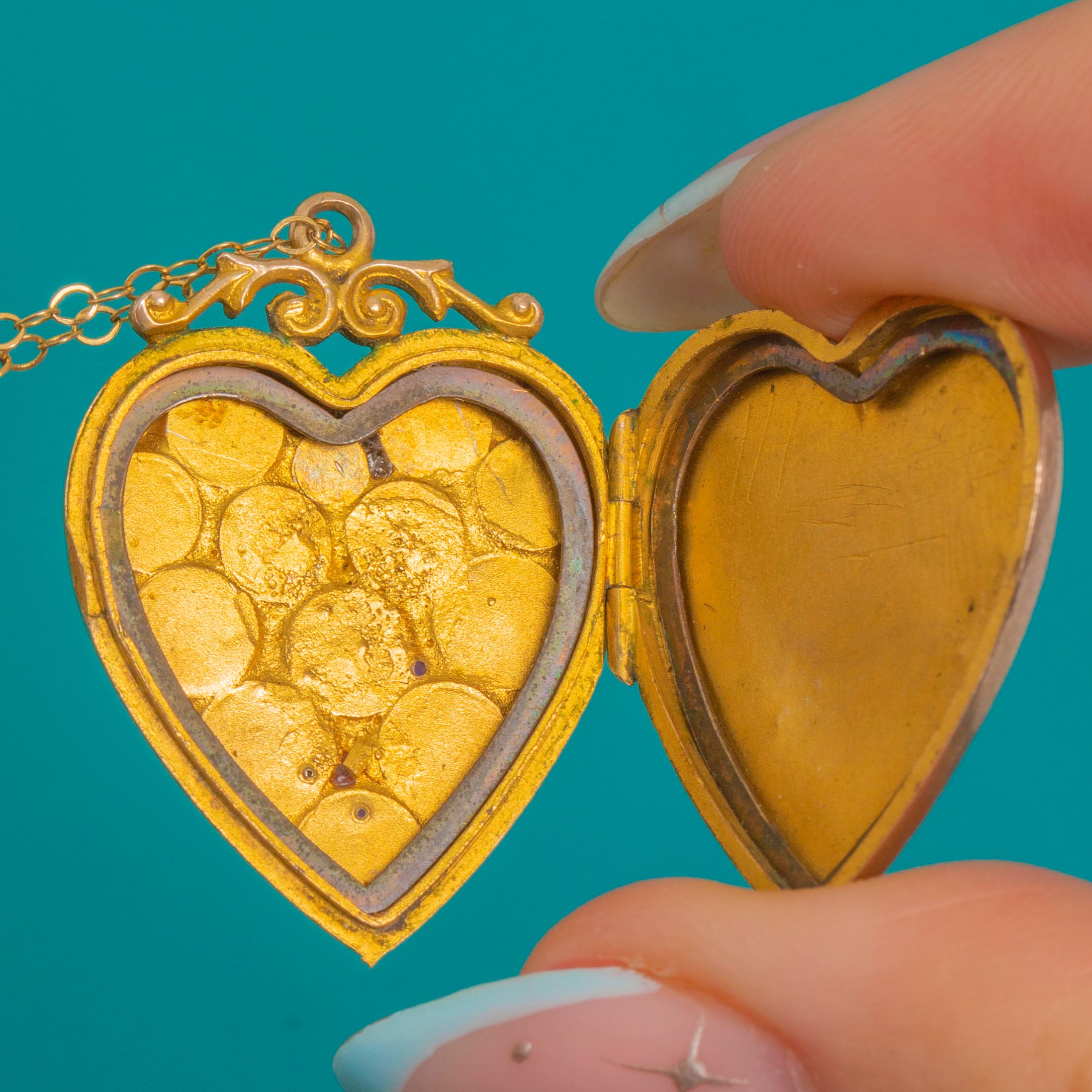 Inside are twin heart-shaped compartments for treasured photographs (the original frames/glazing are not present). It comes with a fine 9ct Gold chain for effortless, ready-to-wear elegance.