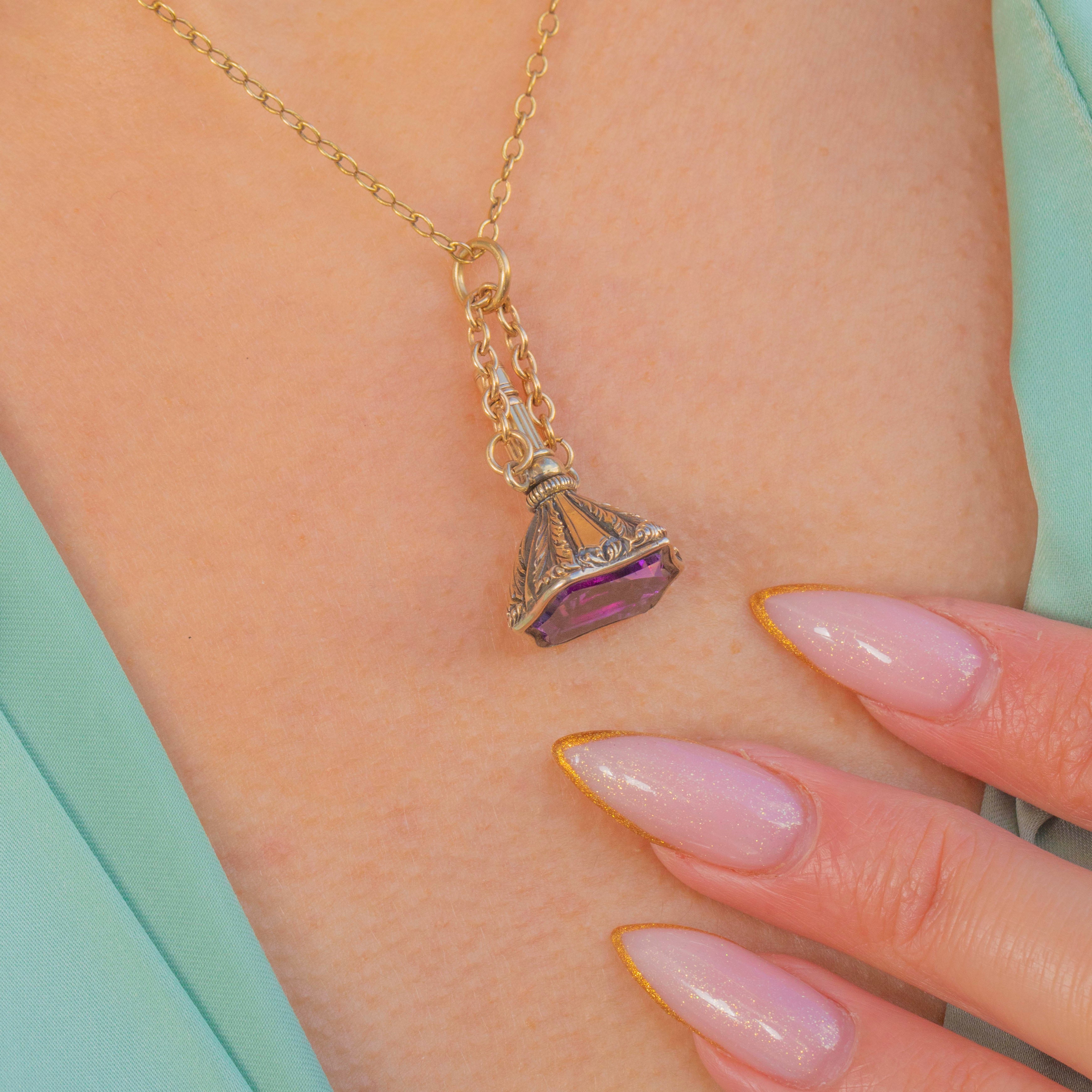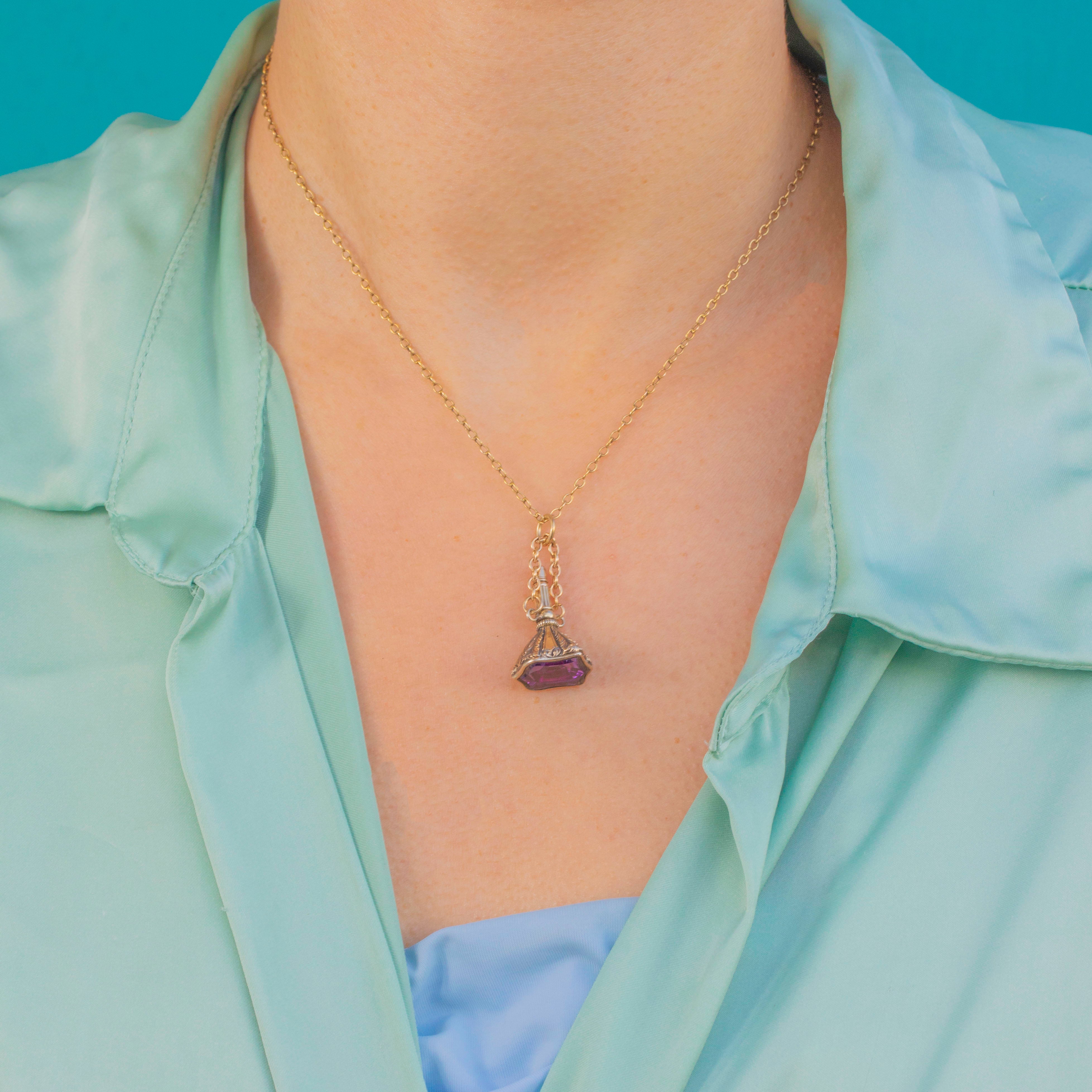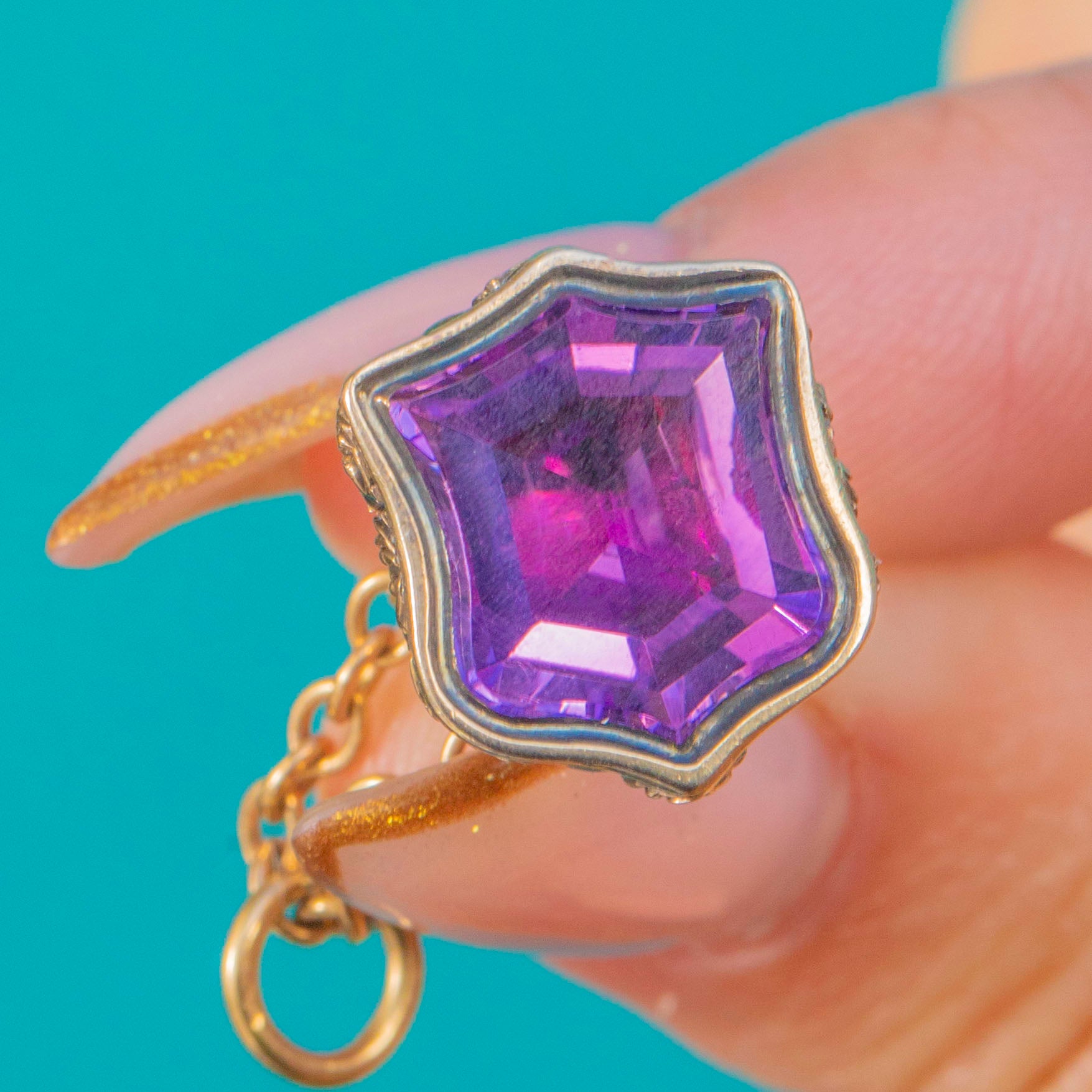 Victorian Charme de clé de montre en améthyste pourpre avec feuille en or 9ct