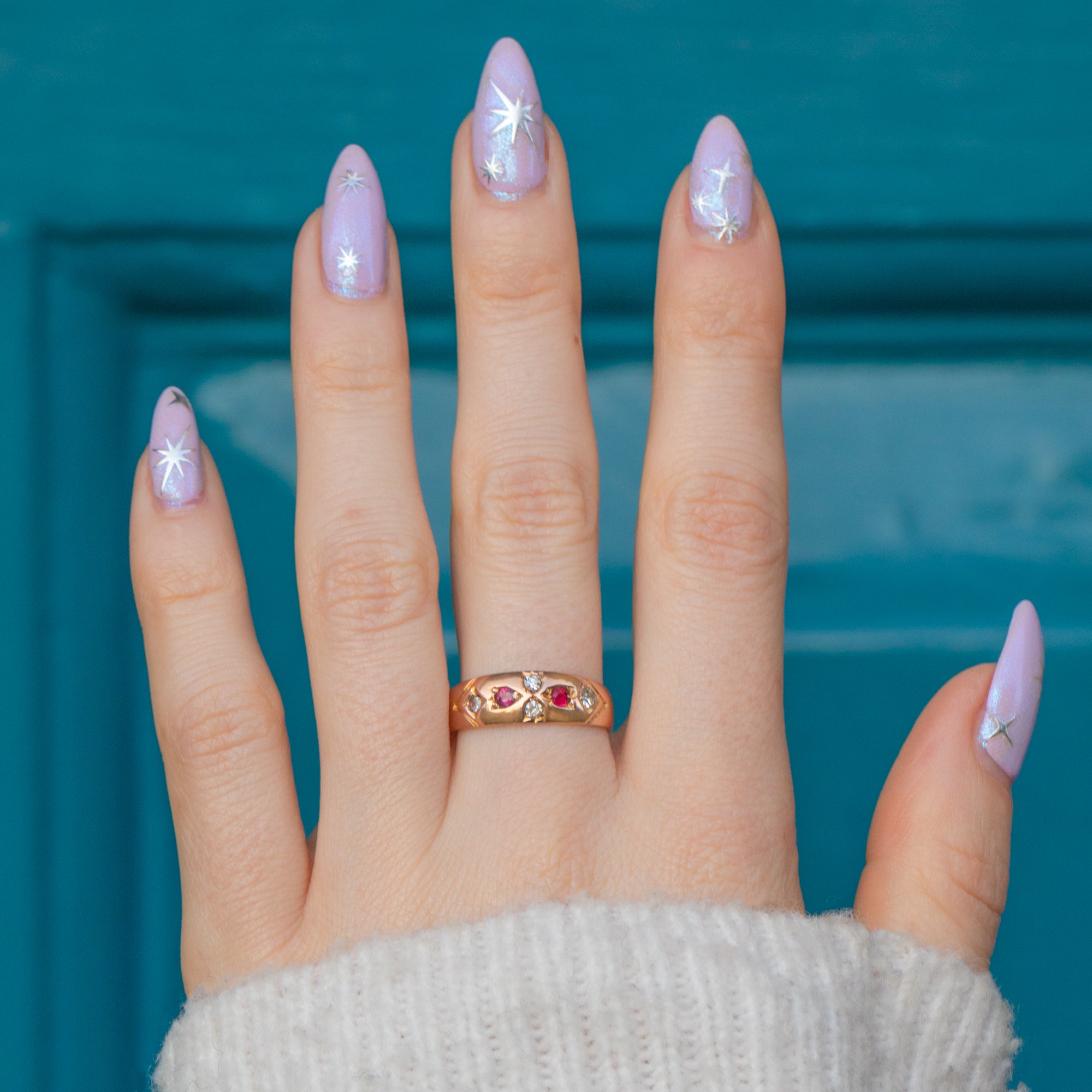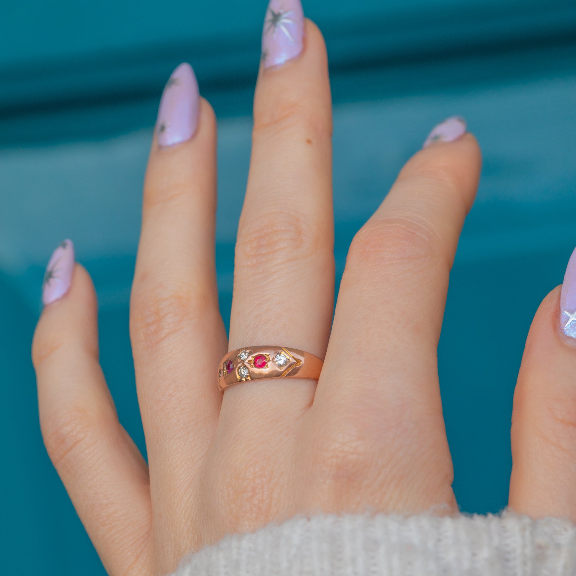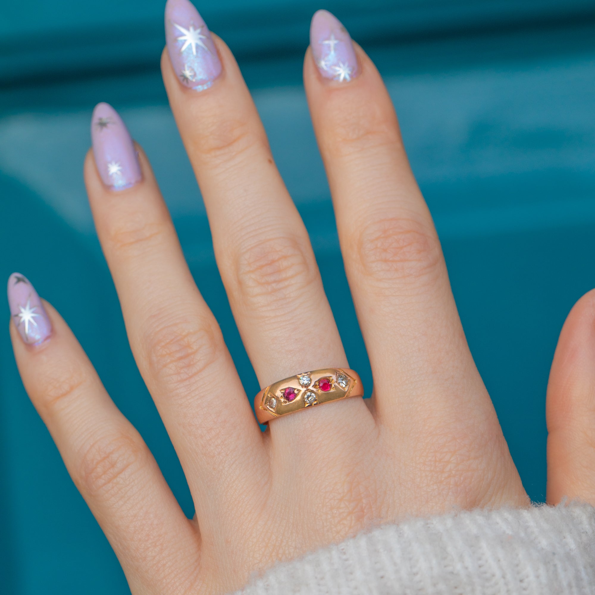 We are delighted to bring you this beautiful 9ct Gold Ruby Diamond gypsy ring! Bursting with Victorian charm, this ring featured four dainty Diamonds, accented by two magenta-hued Rubies and a full set of hallmarks dating to 1896, including the rare Chester Assay.
